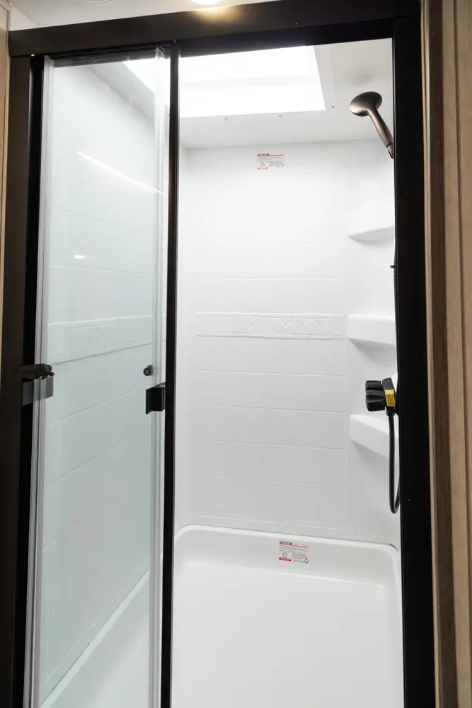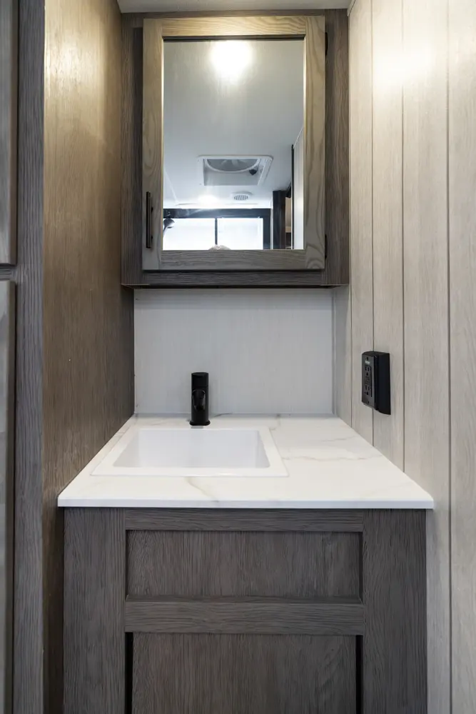 Meet the Alpha Wolf 22SW by Forest River; a lightweight 27ft travel trailer that's PACKED with big amenities! Relax in the theatre seats directly across from your cozy fireplace and entertainment center. There's also a removable table that connects to the sofa when it's time for a meal. The kitchen features a walk-in pantry, 12-volt refrigerator, farm style sink, oven, microwave and lots of storage. In the rear is a full bathroom and up front you'll find a queen bed and two wardrobes.