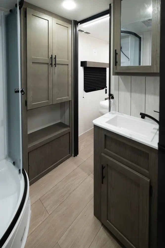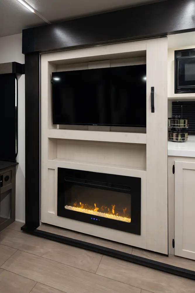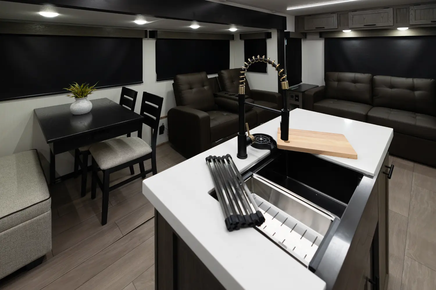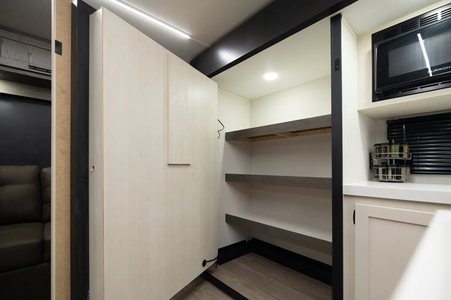 The Alpha Wolf 26RL by Forest River takes a popular 5th wheel design and brings it into a smaller form factor! Stretch out and relax with a queen size bed and ample wardrobe space in the bedroom. The spacious living area features oversized windows, perfect for enjoying the scenery. A beautiful island highlights the kitchen along with a 12-volt refrigerator, oven, microwave and built-in trash can. Easy to tow and perfect for your next adventure!