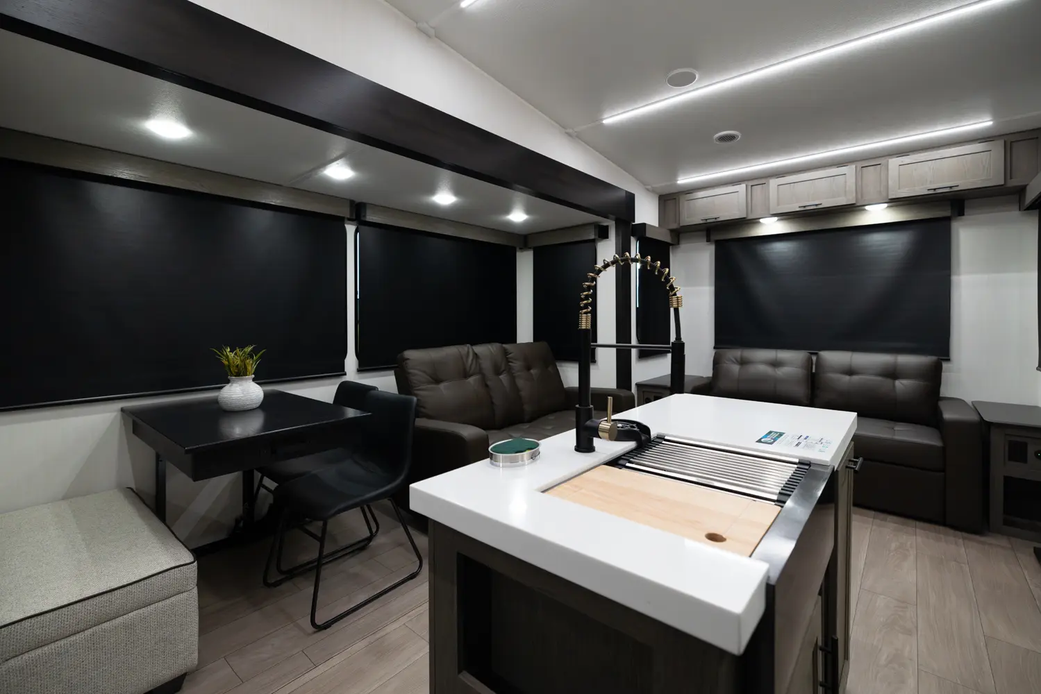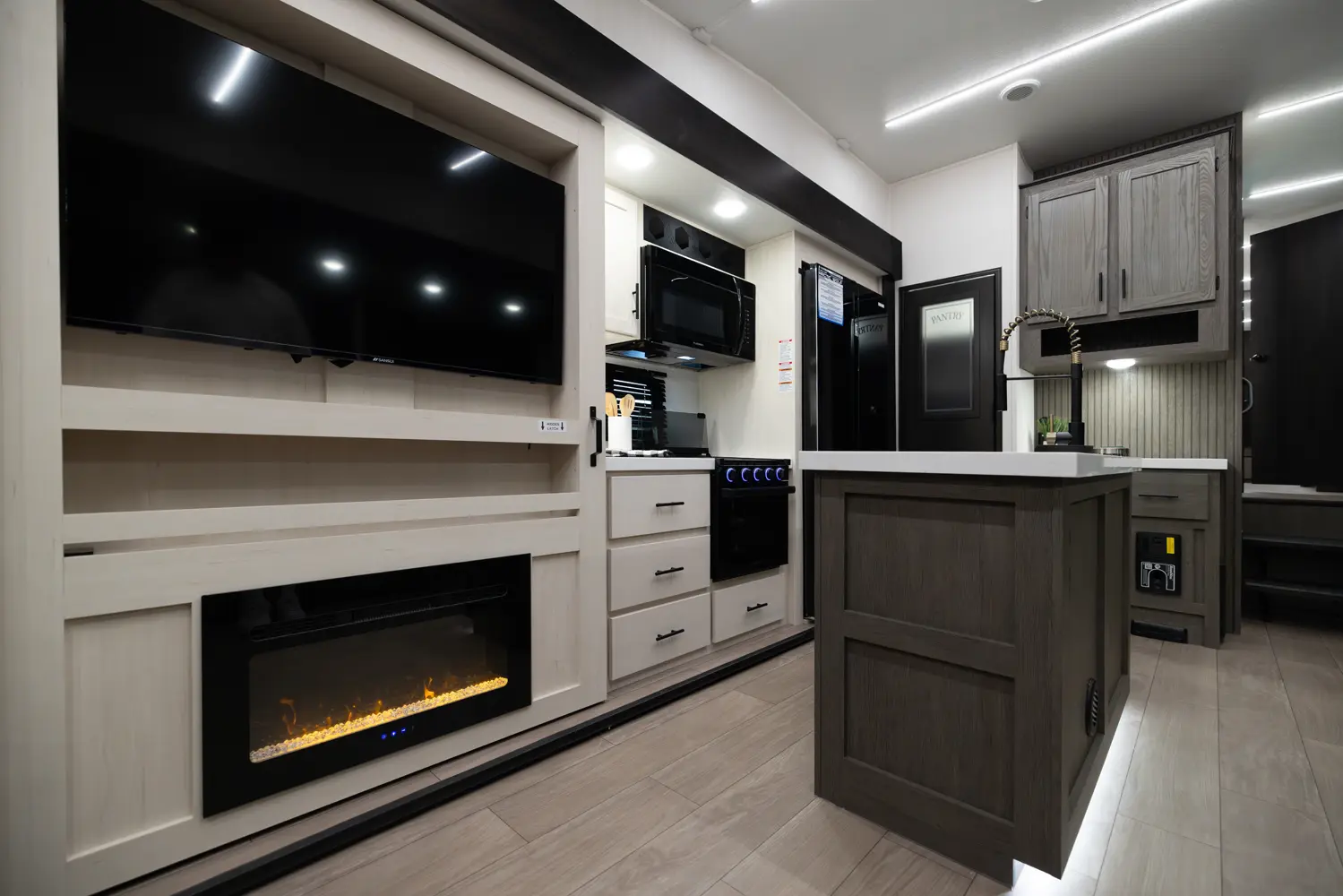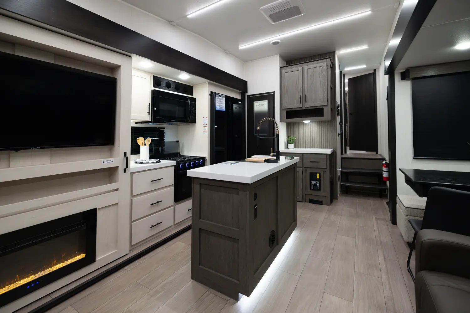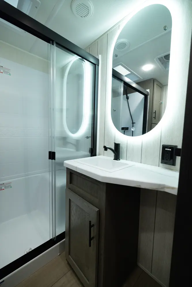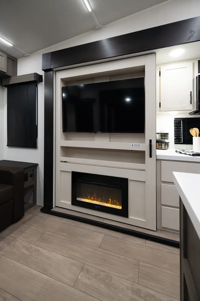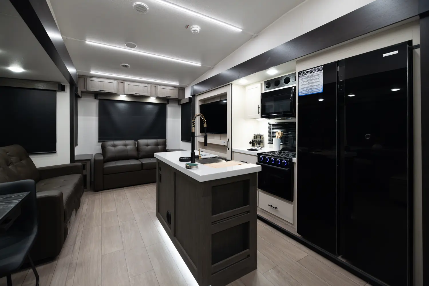The Arctic Wolf 3250SUITE is perfect for couples and solo travelers alike with a spacious open concept design. The rear living room is flanked by big windows for natural light and the entertainment center doubles as a hidden pantry. In the modern island kitchen, you'll find two 10 cu. ft. refrigerators, 30" microwave, oven and a spacious dinette. Up front is a king size bed, full bathroom, sun bench and lots of great wardrobe space.