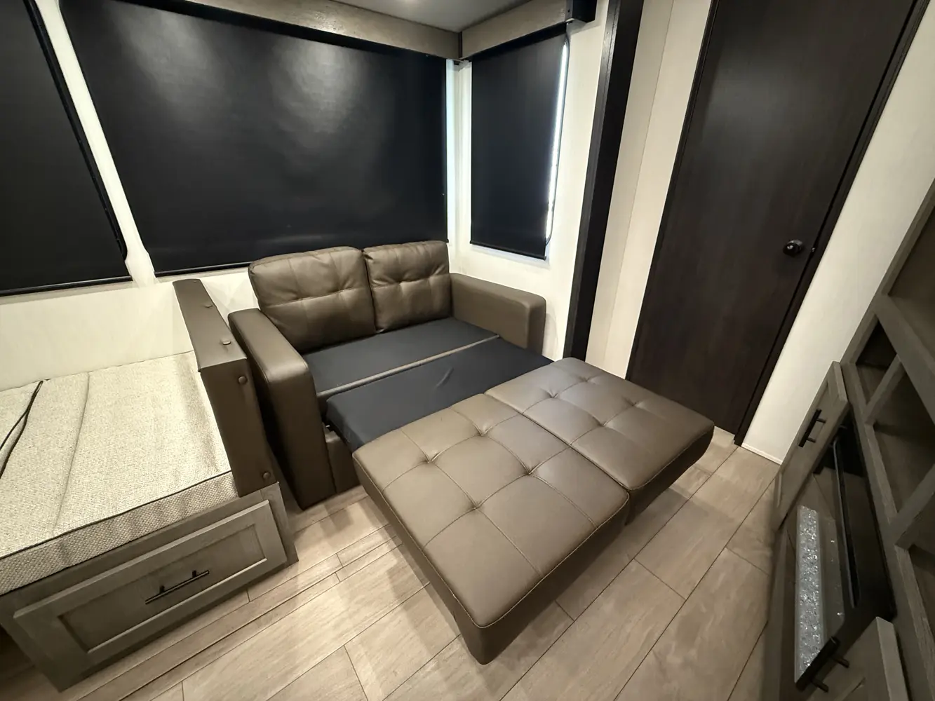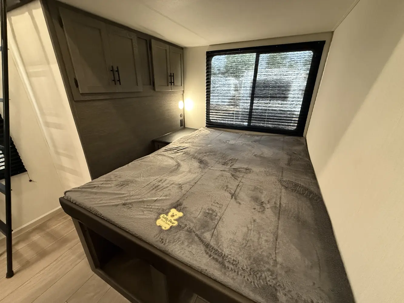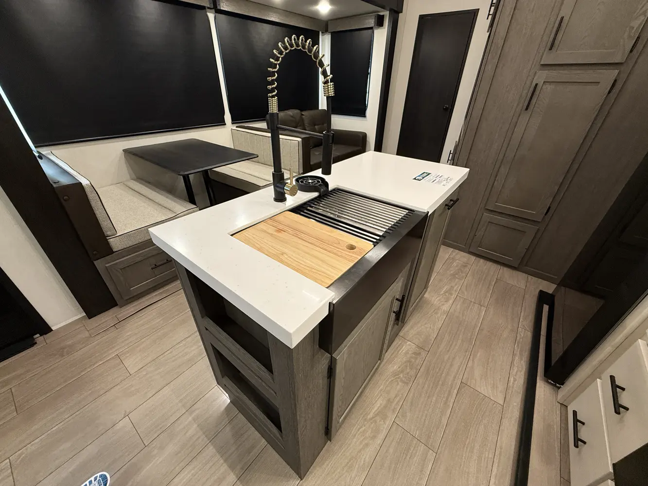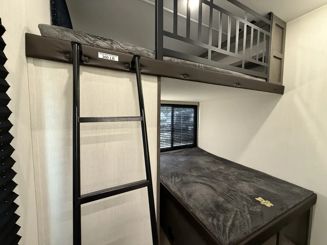 The Arctic Wolf 331BH by Forest River offers a two-bedroom design in a relatively short 38 ft 3 in form factor. In the rear is a half bathroom, 54x74 bunk, built in wardrobe storage and a 60x80 loft bunk overhead. Chef's will appreciate the island kitchen that features a 12-volt refrigerator, microwave, oven, trash can drawer, breakfast hutch and dinette that converts into a bed. Up front is a queen bed, two wardrobes and a full bathroom.
