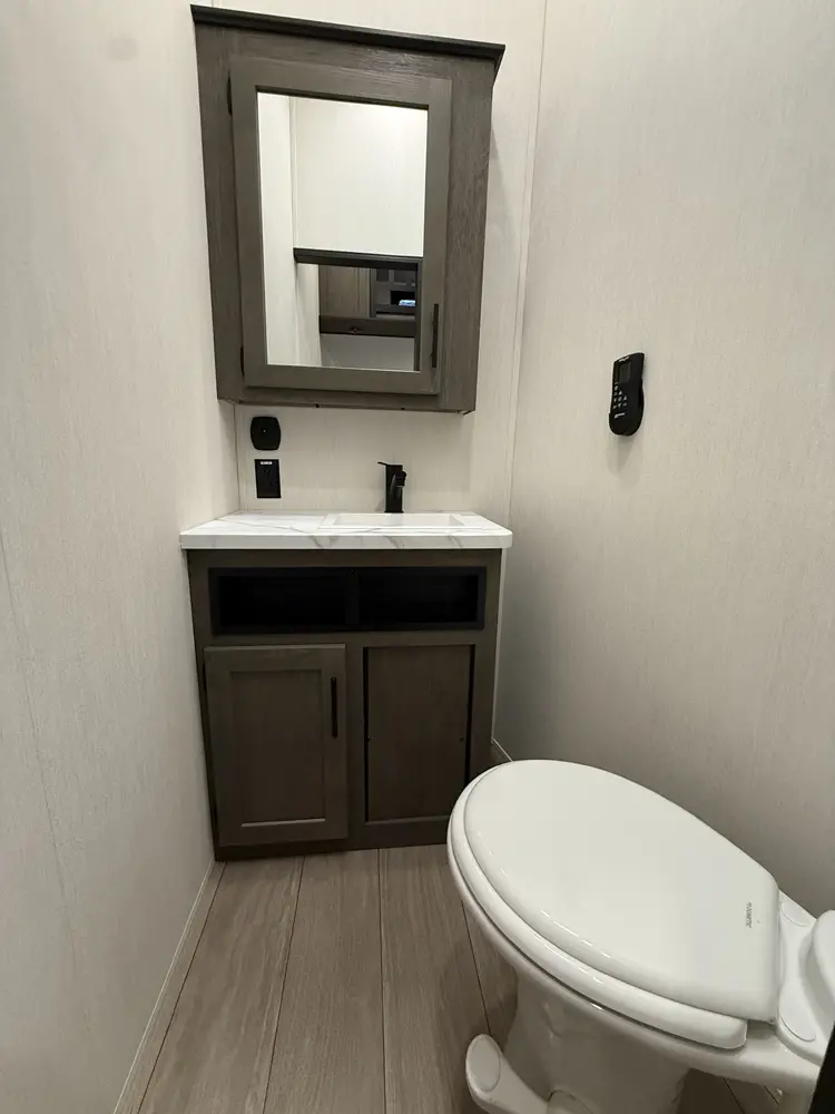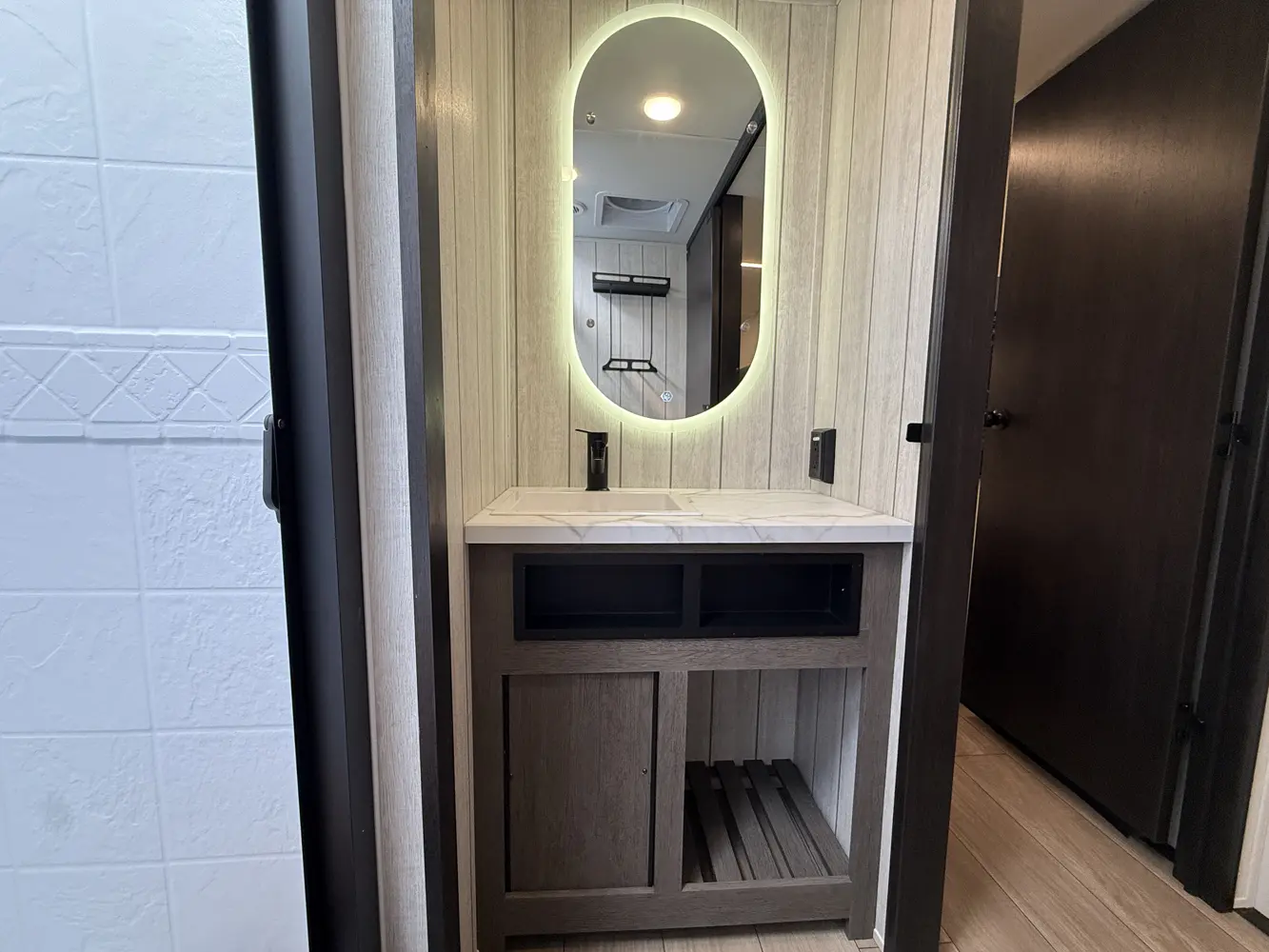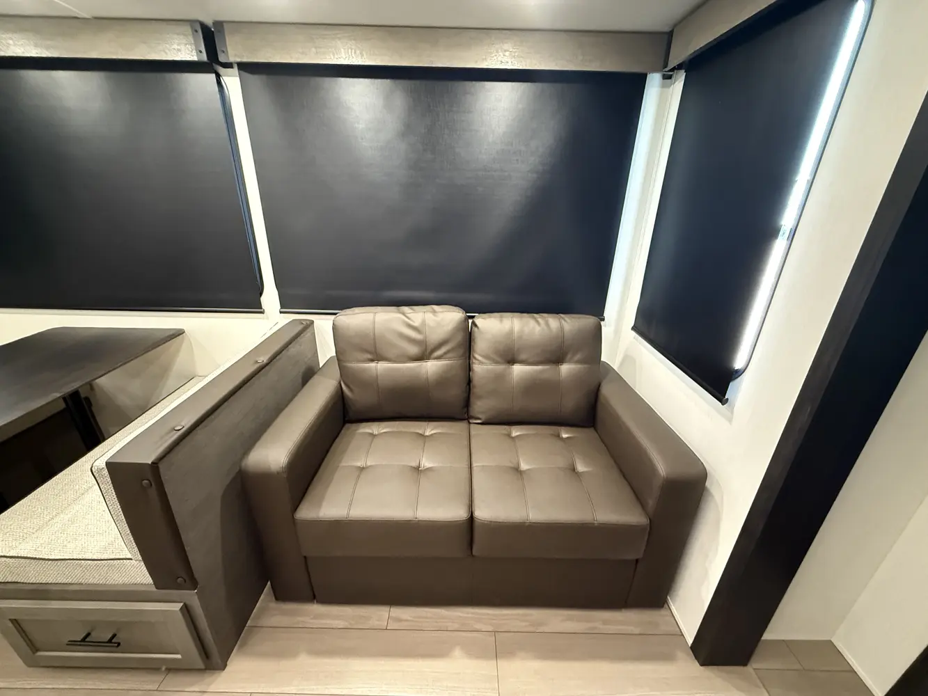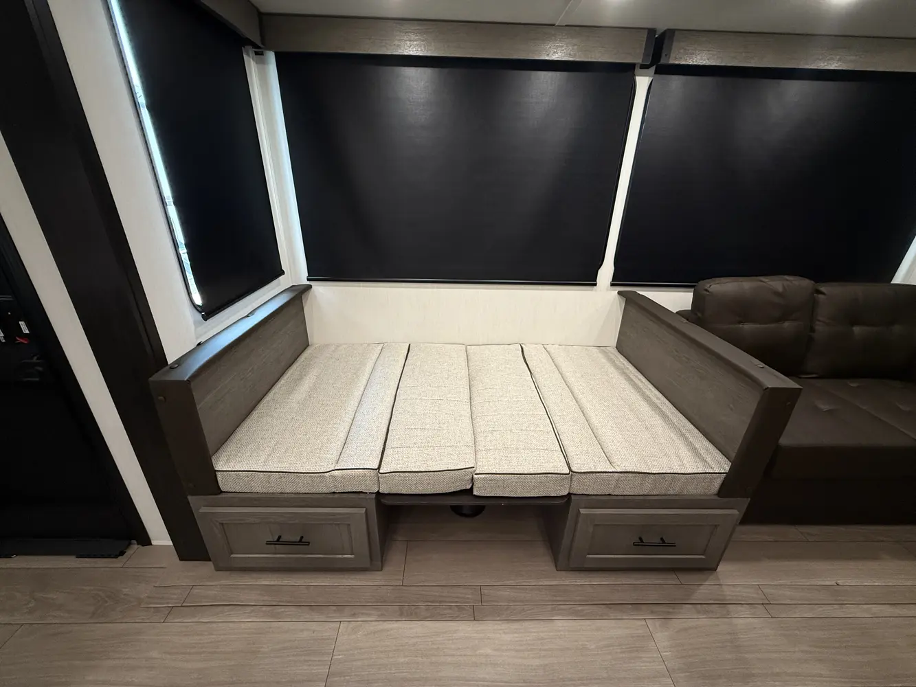 The Arctic Wolf 331BH by Forest River offers a two-bedroom design in a relatively short 38 ft 3 in form factor. In the rear is a half bathroom, 54x74 bunk, built in wardrobe storage and a 60x80 loft bunk overhead. Chef's will appreciate the island kitchen that features a 12-volt refrigerator, microwave, oven, trash can drawer, breakfast hutch and dinette that converts into a bed. Up front is a queen bed, two wardrobes and a full bathroom.