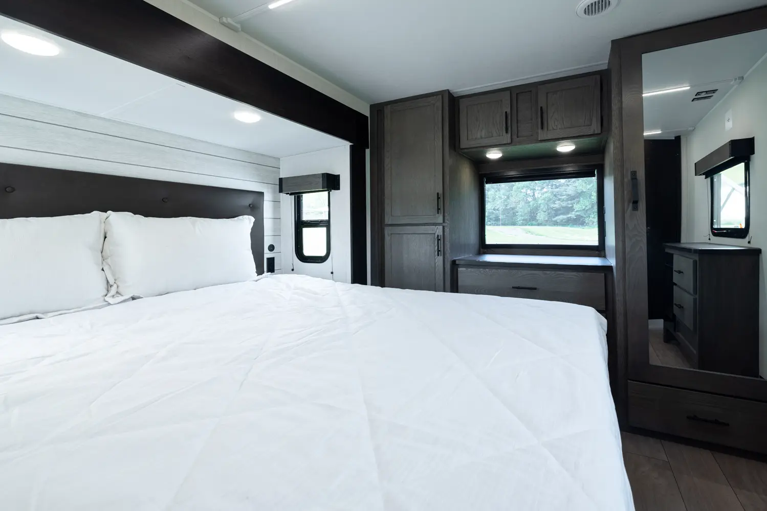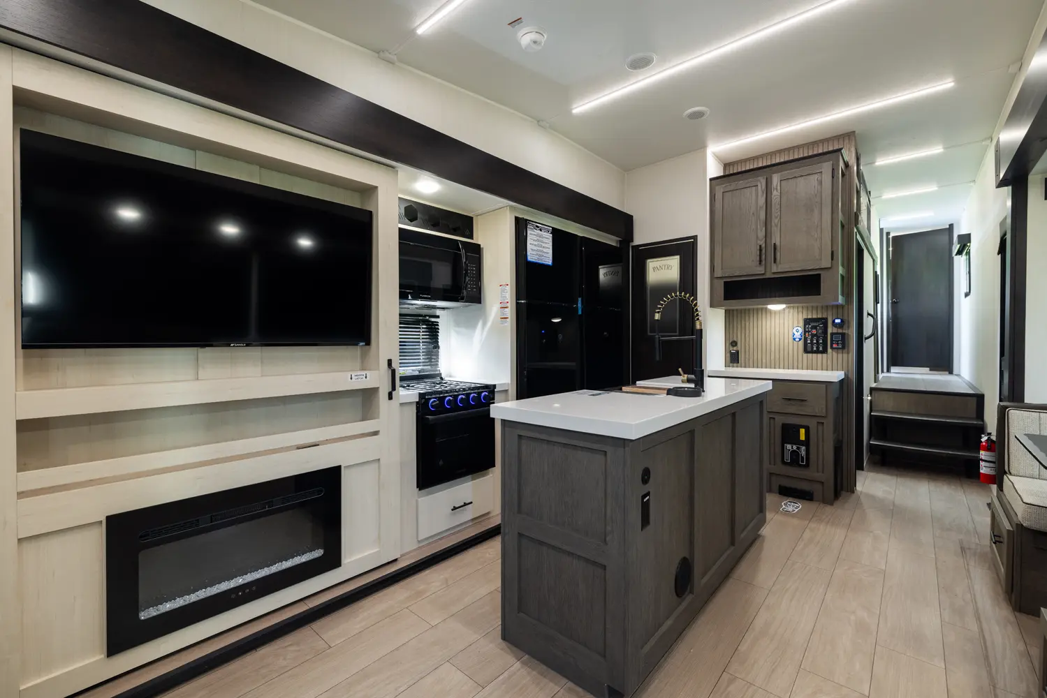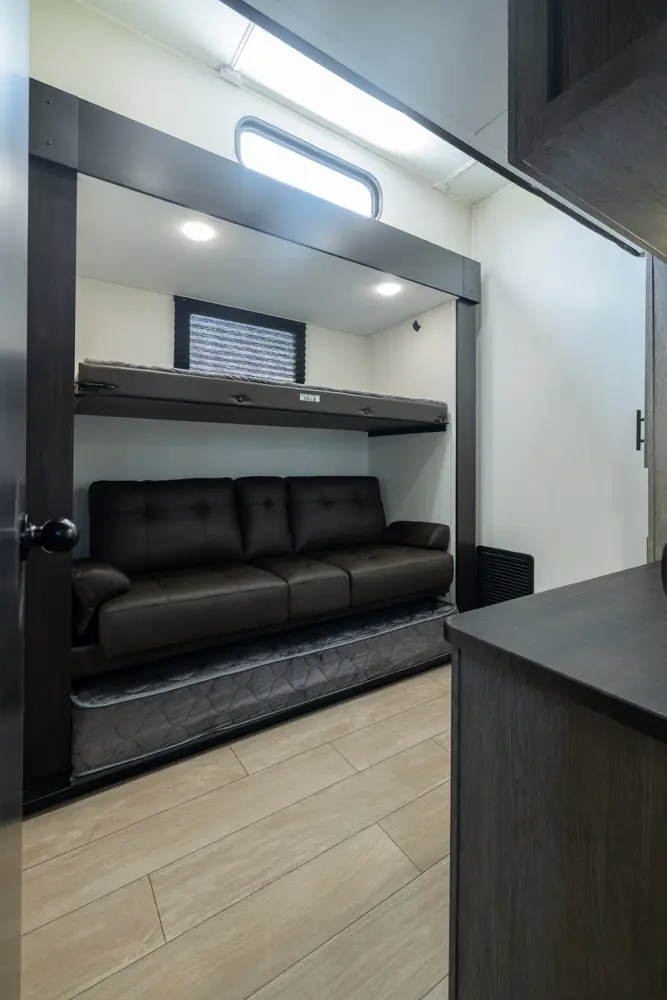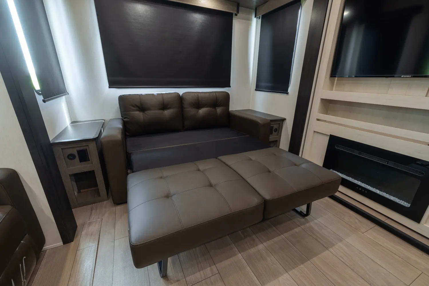 Versatility is the name of the game with the Arctic Wolf 3650SUITE by Forest River. The bonus room located in the middle of this model is highlighted by a desk, trundle bed, drop down bunk, jack knife sofa and a loft overhead. The living room is flanked by big windows for natural light and the entertainment center doubles as a large hidden pantry. For extra sleeping, both the trifold sofa and dinette convert into extra beds when not in use. Up front you'll find a king bed and full bathroom.