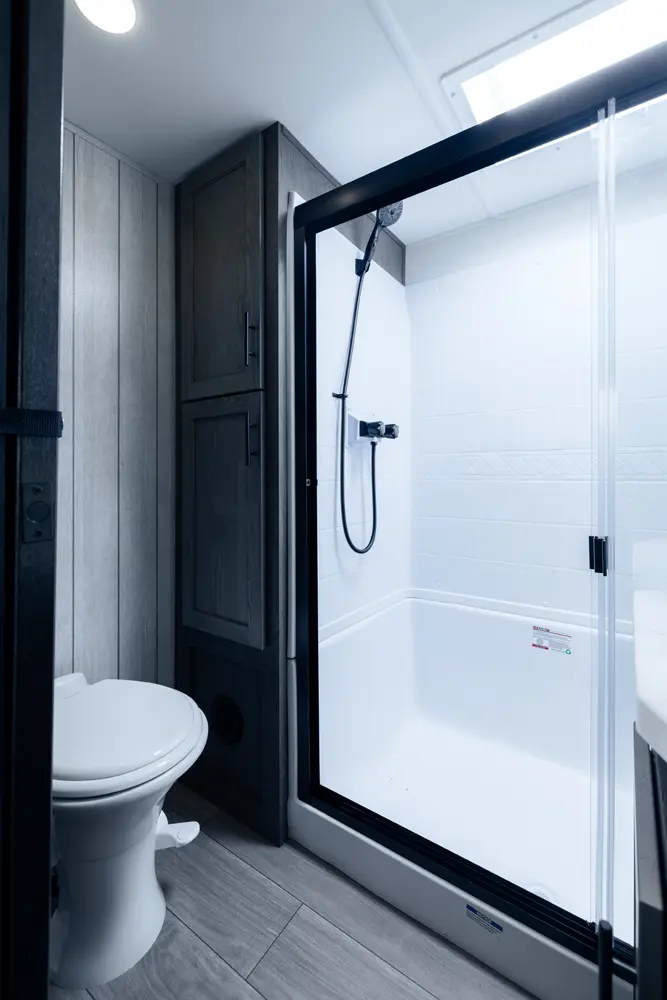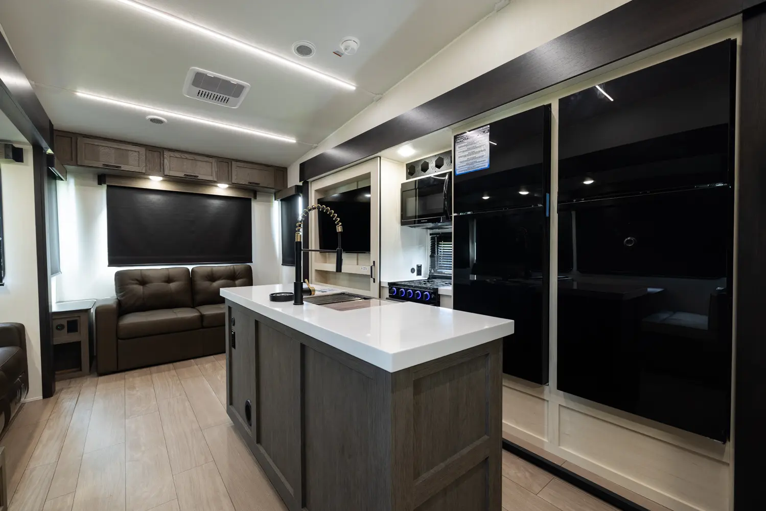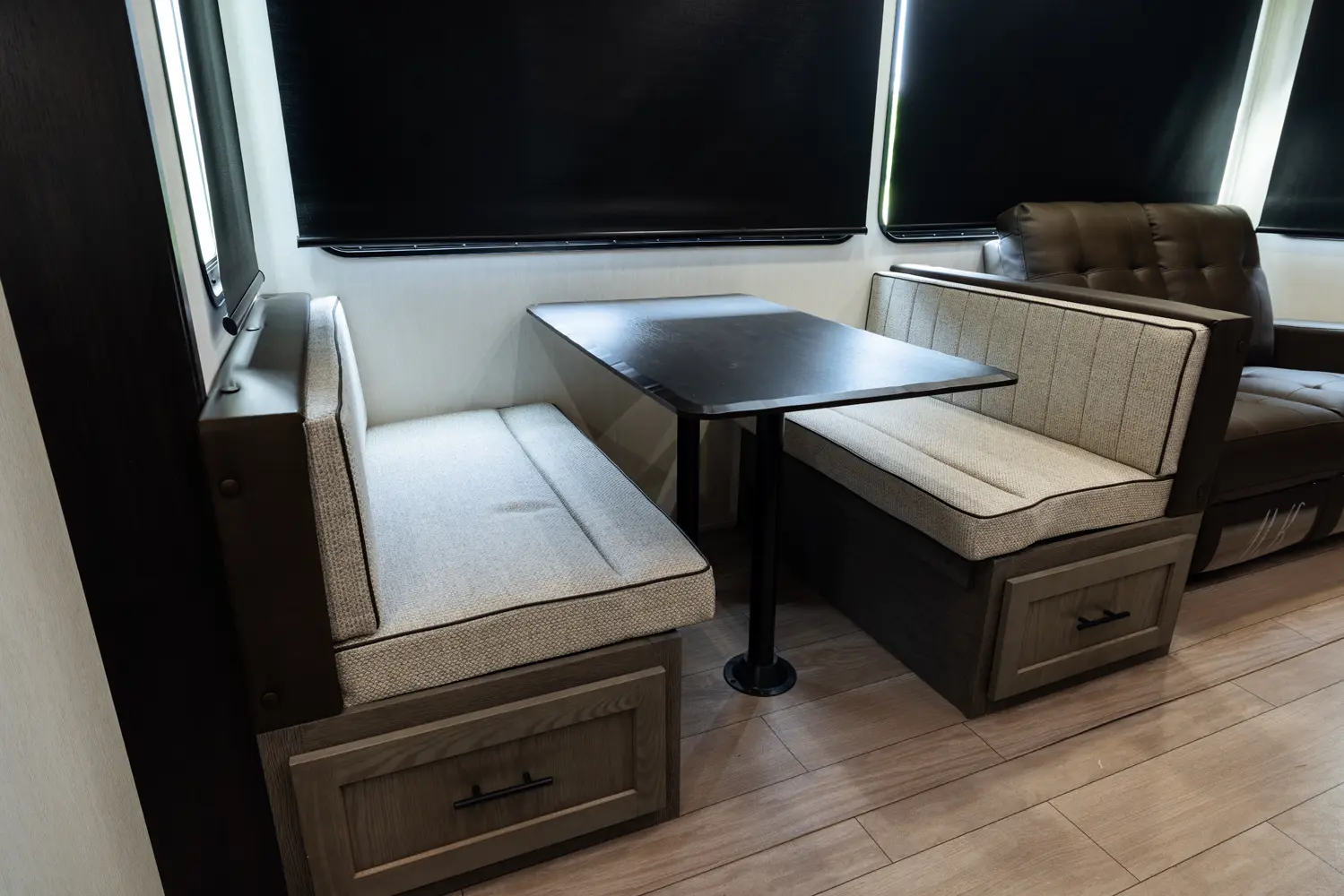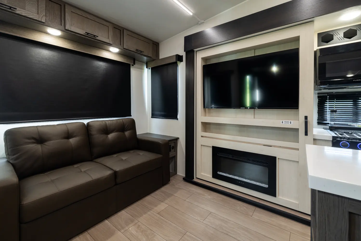 Versatility is the name of the game with the Arctic Wolf 3650SUITE by Forest River. The bonus room located in the middle of this model is highlighted by a desk, trundle bed, drop down bunk, jack knife sofa and a loft overhead. The living room is flanked by big windows for natural light and the entertainment center doubles as a large hidden pantry. For extra sleeping, both the trifold sofa and dinette convert into extra beds when not in use. Up front you'll find a king bed and full bathroom.