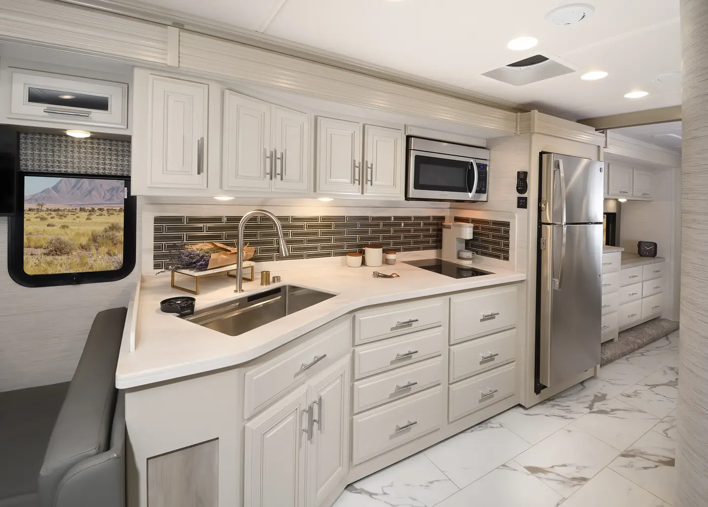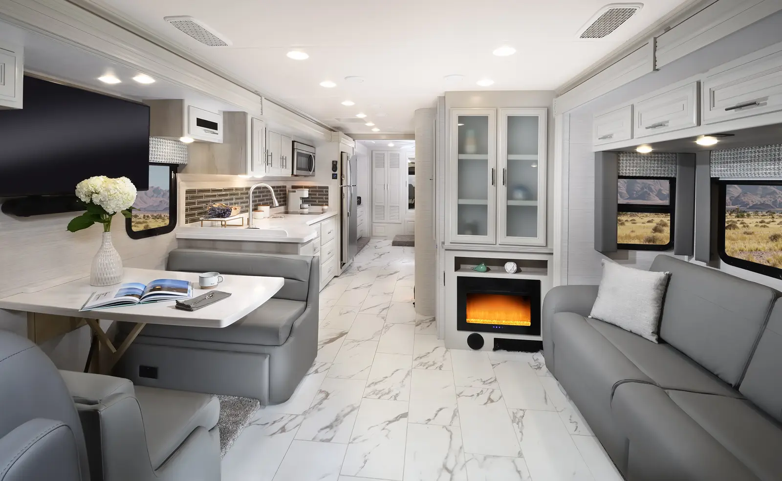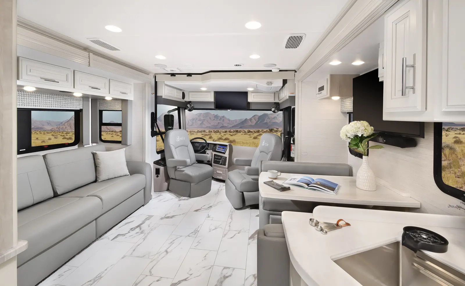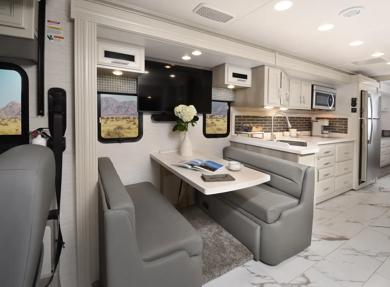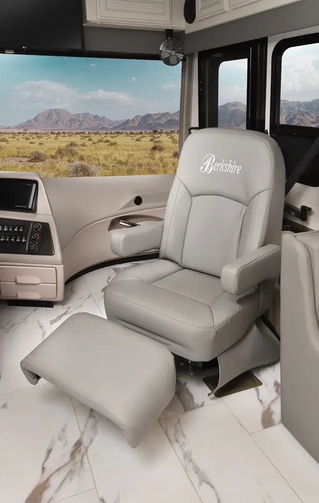 Experience luxury RV travel in a manageable size with the Berkshire 34B by Forest River. This Class A motorhome features three slides for ample space, a king-size Tilt-a-View bed, and a well-equipped kitchen. Perfect for comfortable and stylish road trips.