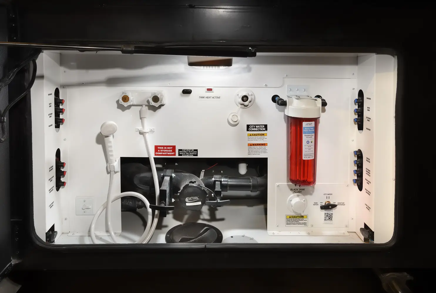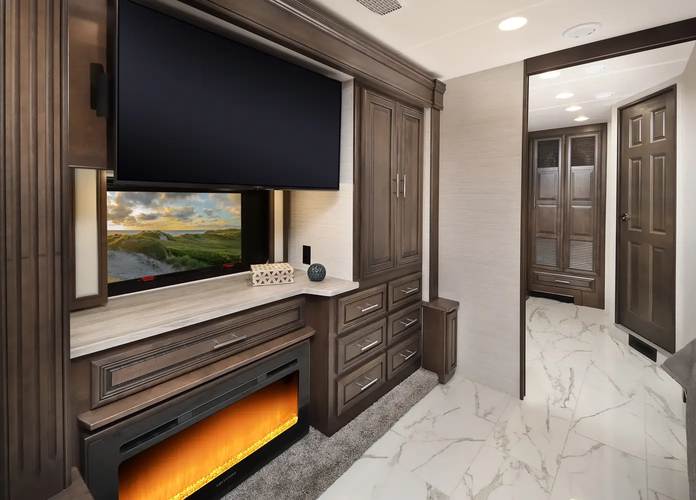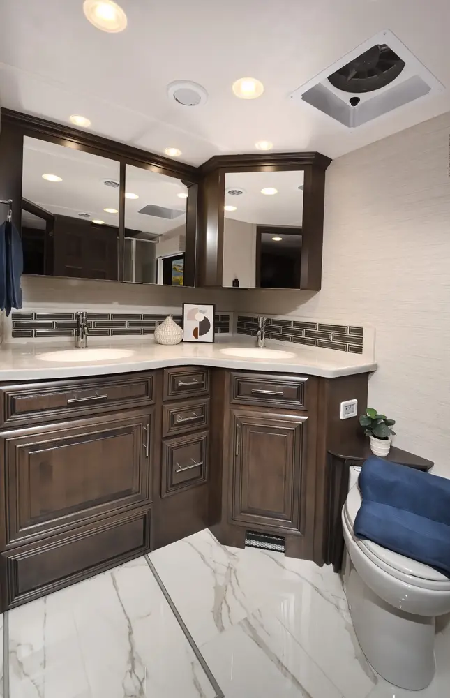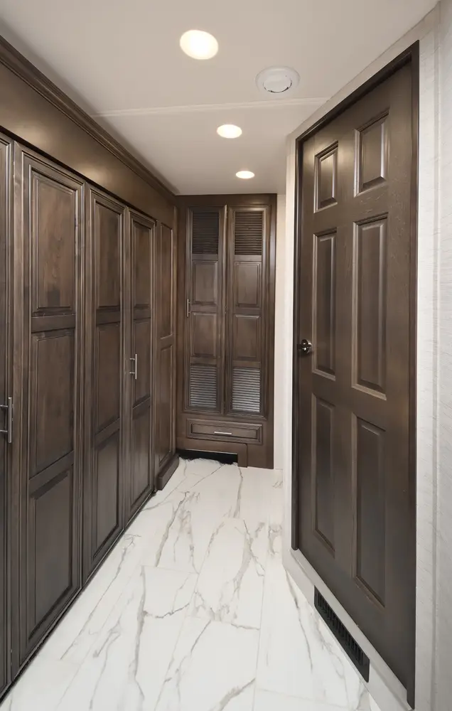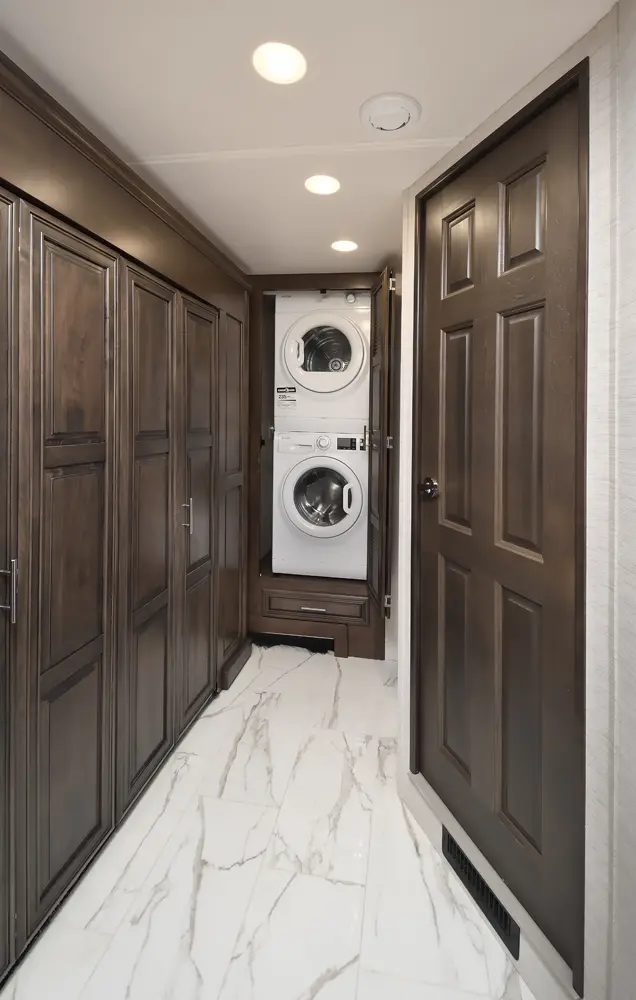 The Berkshire XLT 45E is a five-slide bunkhouse model. The large full rear bath includes a shower, vanity, cabinets, and stacking washer/dryer. Within the bathroom is a slideout bunk room/wardrobe combo. Each bunk is 30" x 73" and has its own TV. The main bedroom has a slideout, 72" x 80" Tilt-a-View king bed, plus a dresser, wardrobe cabinet, 43" TV, and overhead cupboards. Moving toward the living area is a half bath with vanity sink, medicine cabinet, and commode. The kitchen is fully equipped with a convection microwave, induction cooktop, and residential-style refrigerator. Just over the cockpit, you'll find a unique drop-down bed that provides an additional sleeping surface.