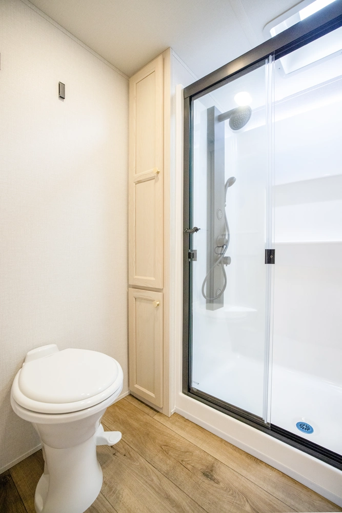• Redesigned 48" x 30" Rectangular-Style shower with seat, sliding glass doors, and an Upgraded Shower Head