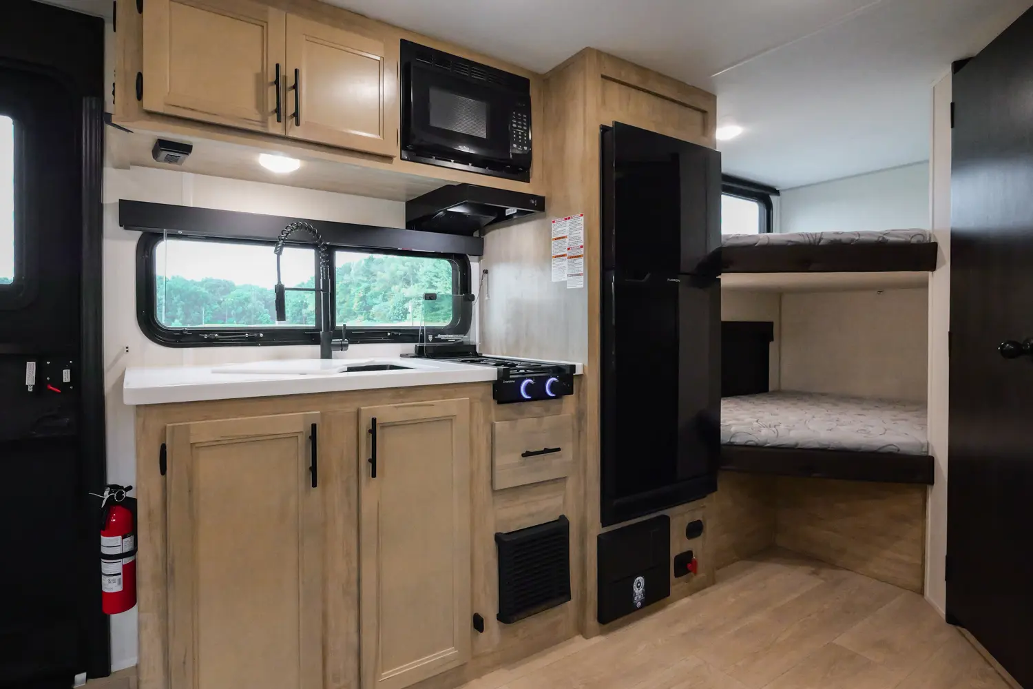 The 17JWBL is the embodiment of the family camper. The large U-shaped dinette offers great seating, full-size pull-out drawers, as well as additional sleeping for two adults. The master queen bed offers comfort, while housing huge under bed storage. A functional modern chef’s kitchen, and bathroom round out the interior of this class leading unit. The exterior under awning space provides ample entertaining space with the exclusive Pup kitchen, LED Power awning, exterior speakers, and TV bracket.