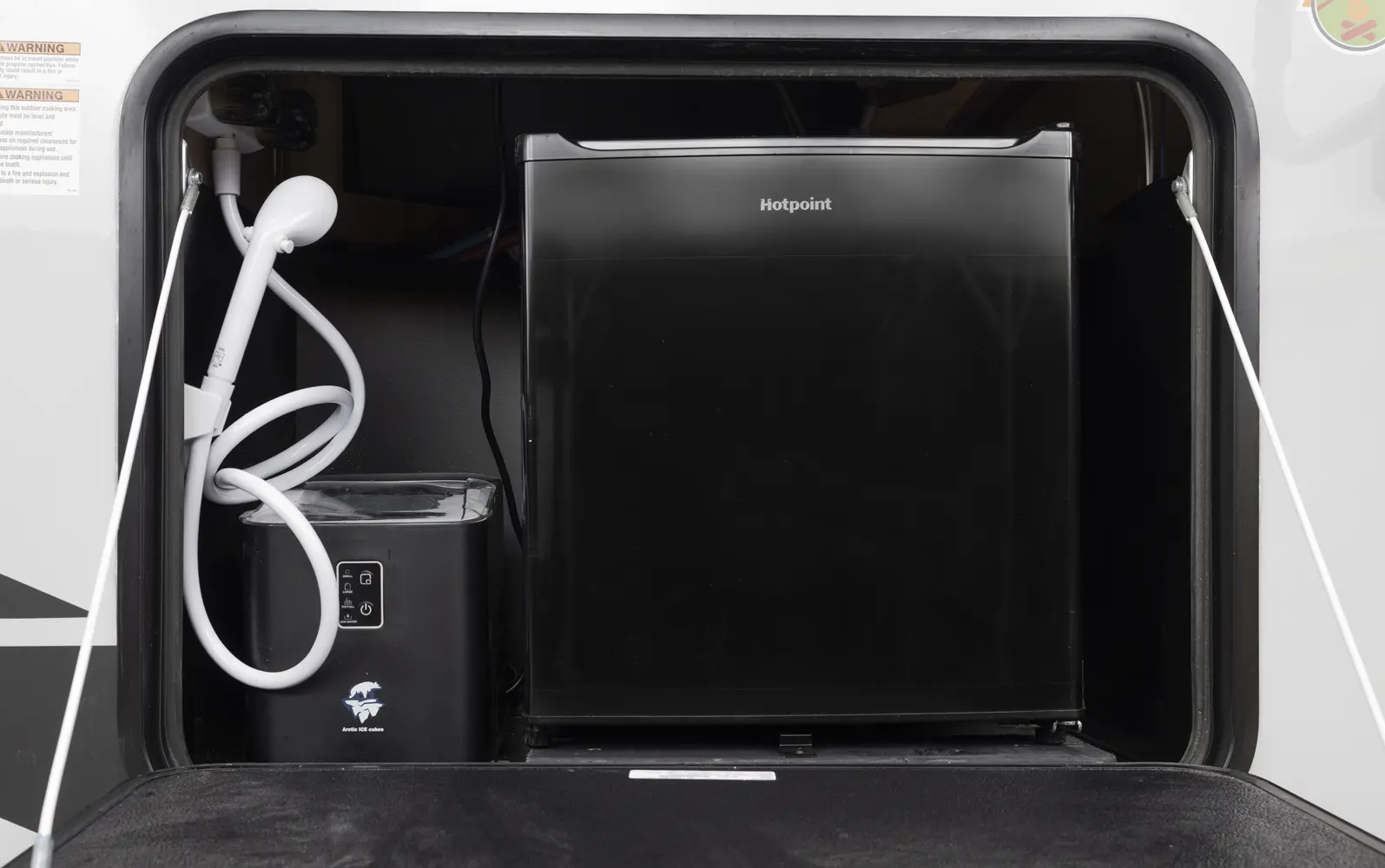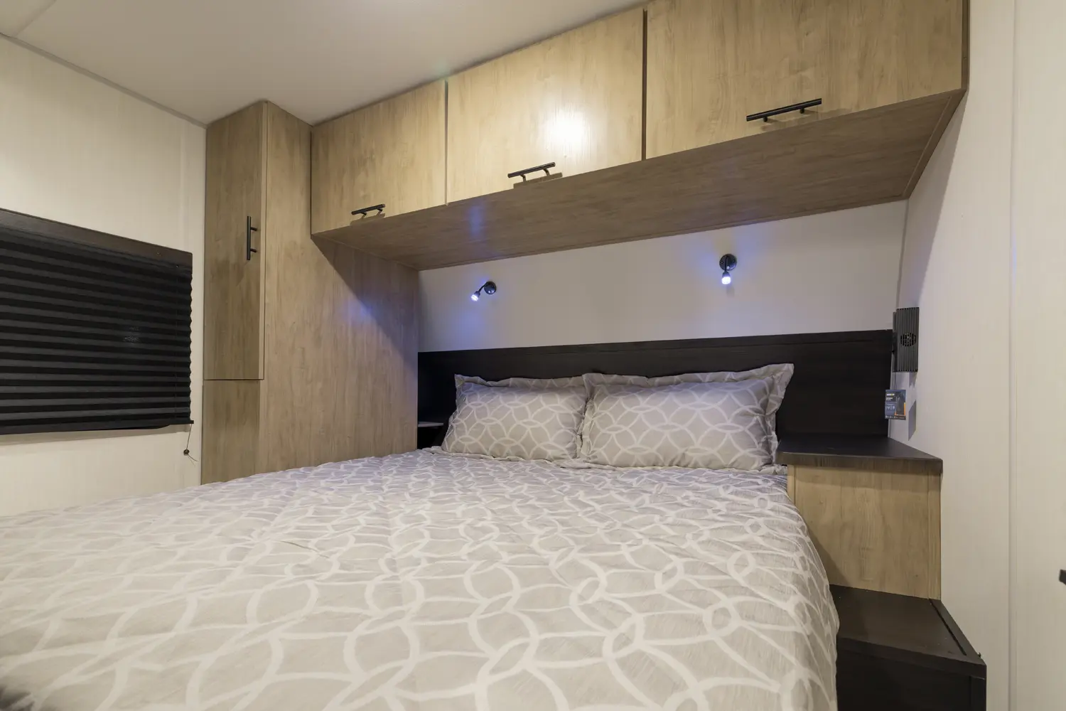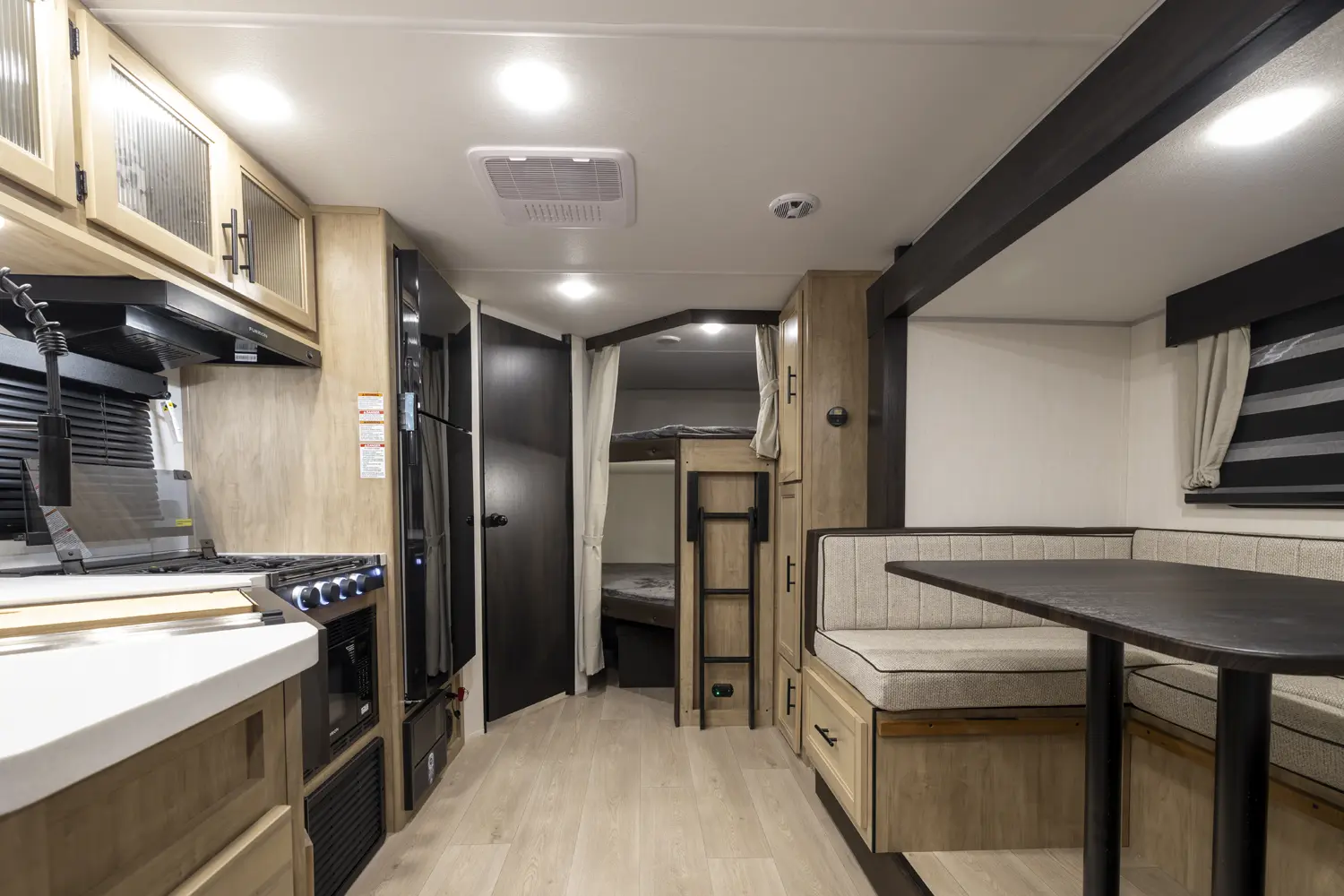The 23DBHBL is a family bunkhouse featuring a huge double bunk with ladder for kids. The double entry doors allow easy access to the bathroom and kitchen from the exterior. The modern chef’s kitchen, oversized pantry, and extra-large U-shaped dinette with full length drawers give you more than enough storage. The private master suite provides a queen size bed with ample overhead and side cabinetry. The exterior provides under awning entertainment area with TV bracket, and outside speakers.