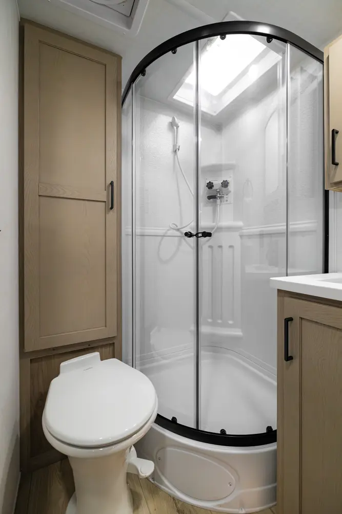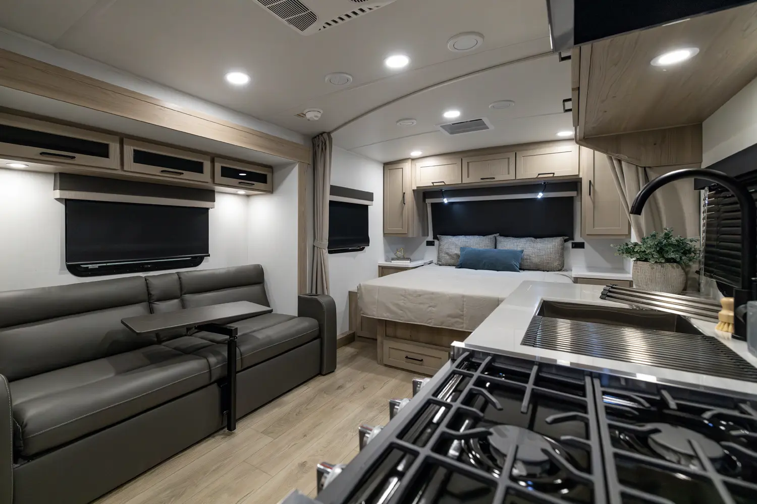 This unit has everything you need in a trailer under 23' feet. This big 60" X 74" queen bed with a wardrobe and night stand on both sides has privacy curtains to give the feeling of a separate bedroom. The fan above the bed and the three windows around the bed are added to enhance the camping experience. This trailer has a 72" sofa slide that allows for more space in the kitchen and entertaining center.