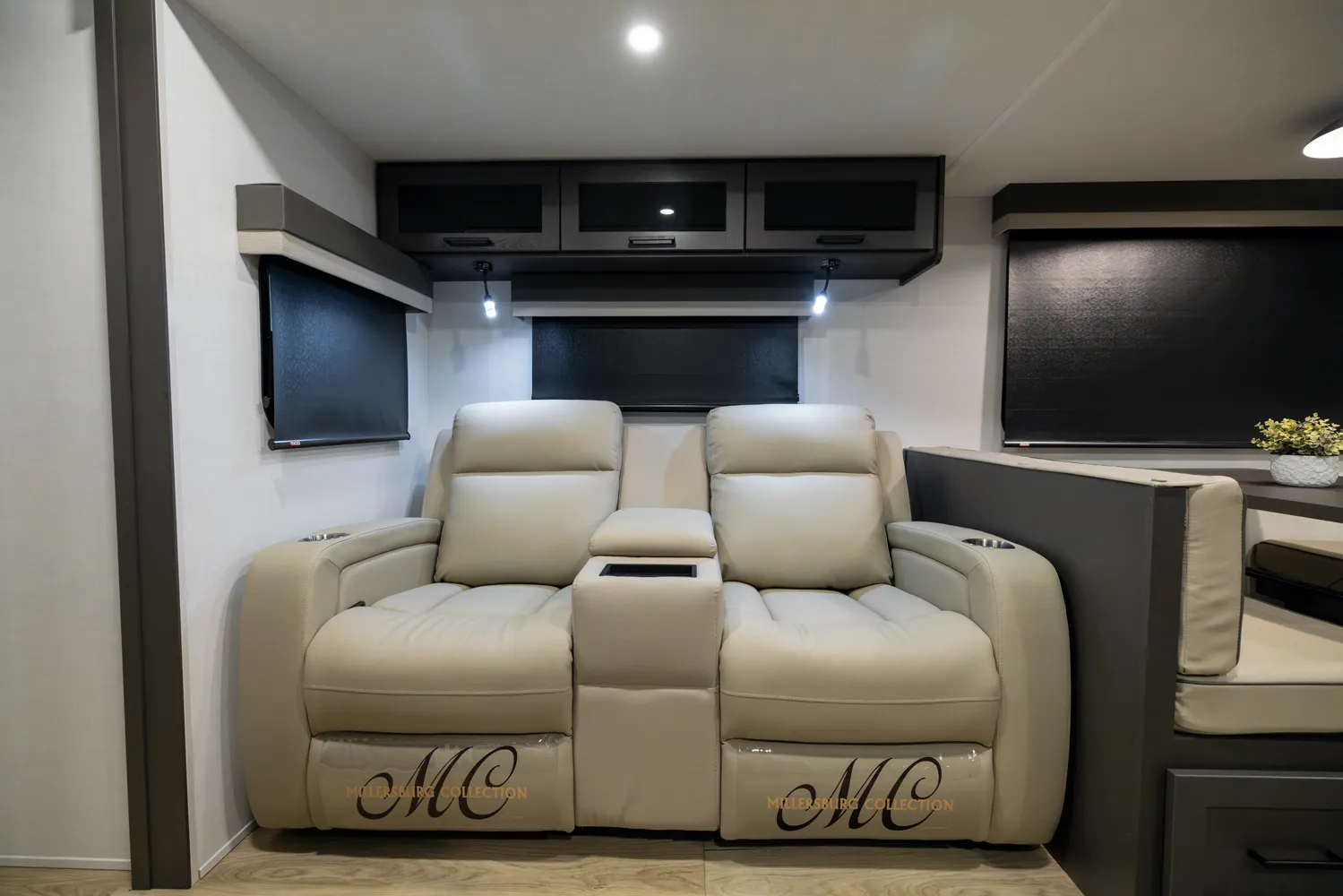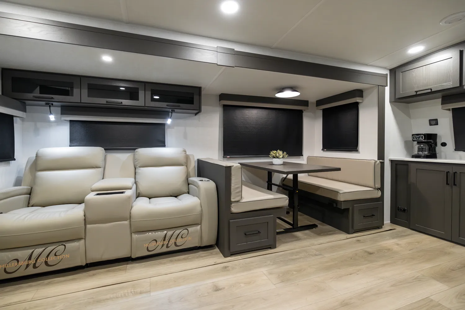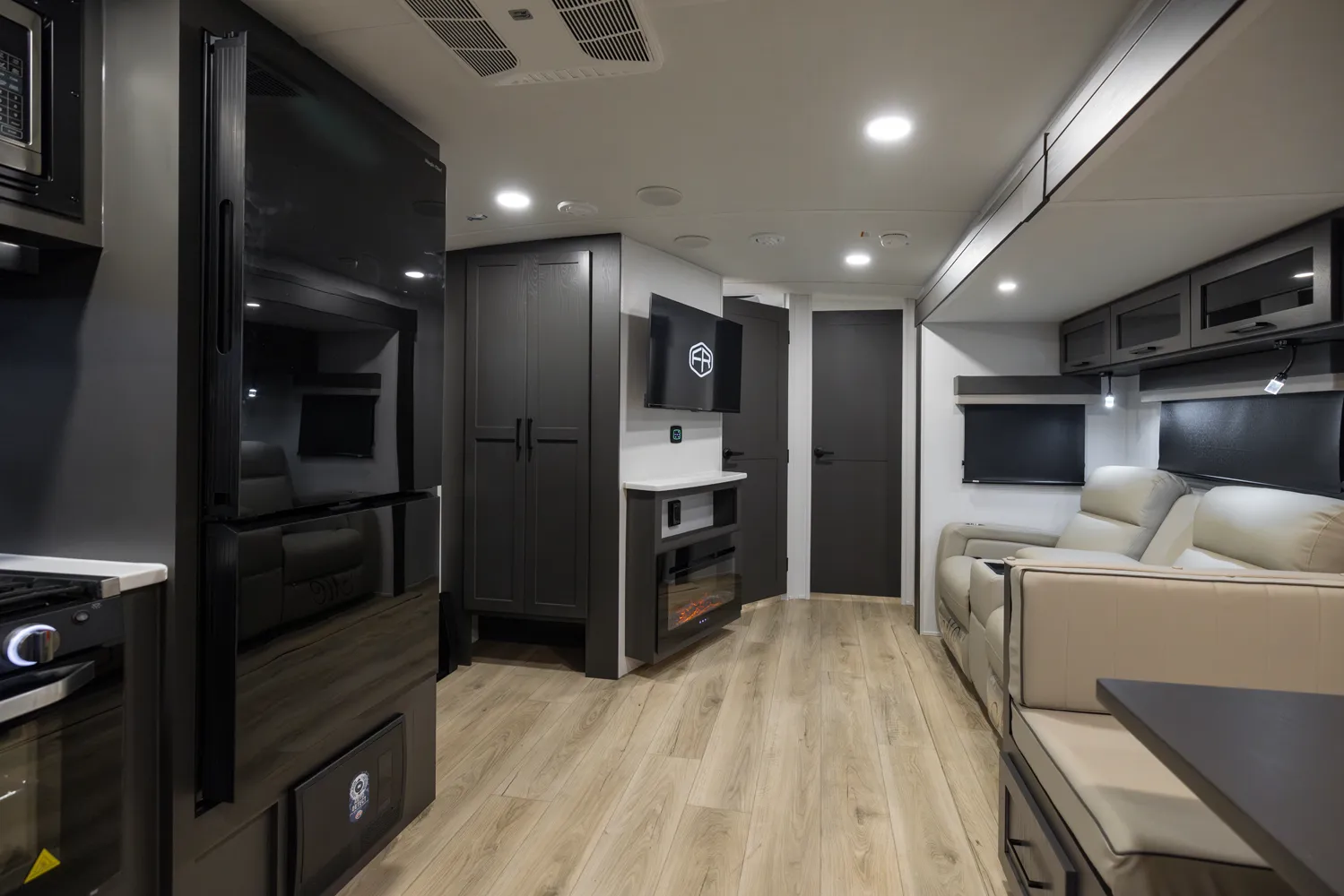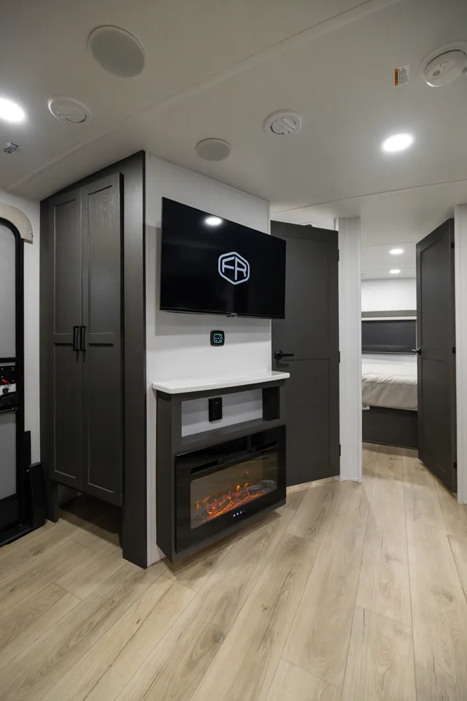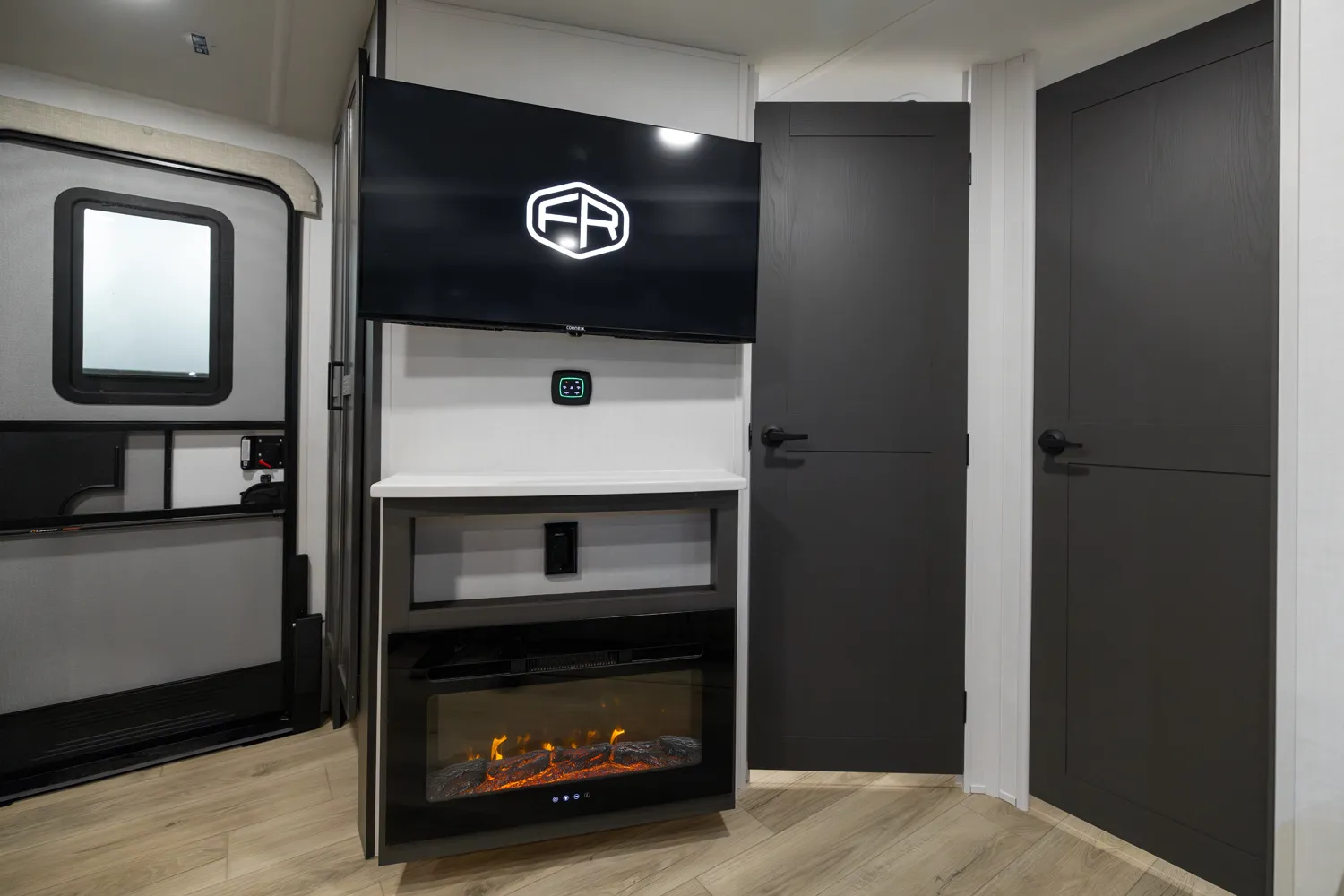 Holy counter space! This front kitchen offers a ton of counter space with a giant window to enhance the camping experience. The 67" theater seating is conveniently located right in front of the entertainment center and the cozy space heating fireplace. The master bedroom offers a big 60"x 80" queen bed slide out which makes the room feel residential. This bedroom has a separate entry and exit door that is also covered by the giant 21' awning.
