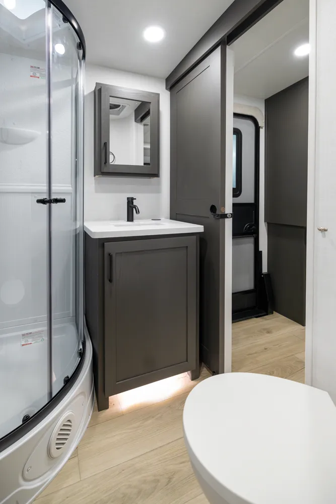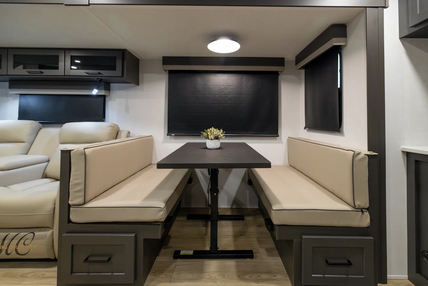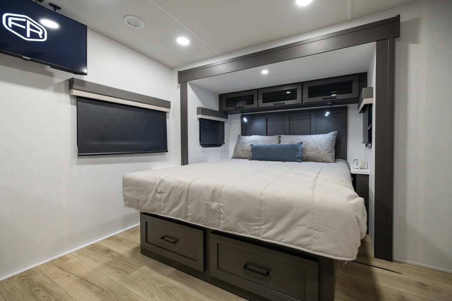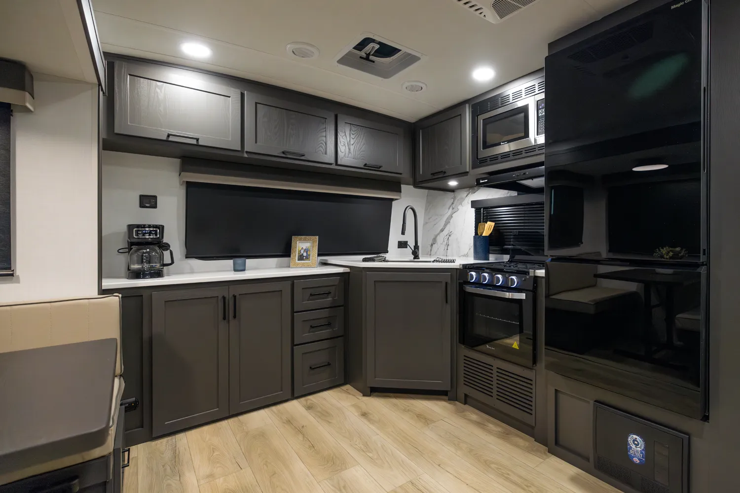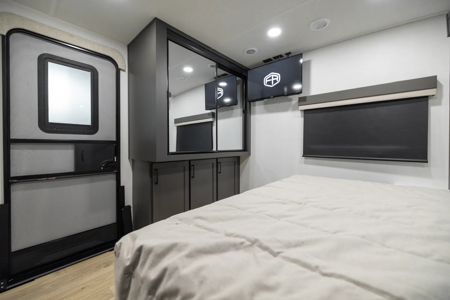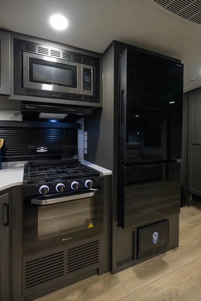 Holy counter space! This front kitchen offers a ton of counter space with a giant window to enhance the camping experience. The 67" theater seating is conveniently located right in front of the entertainment center and the cozy space heating fireplace. The master bedroom offers a big 60"x 80" queen bed slide out which makes the room feel residential. This bedroom has a separate entry and exit door that is also covered by the giant 21' awning.