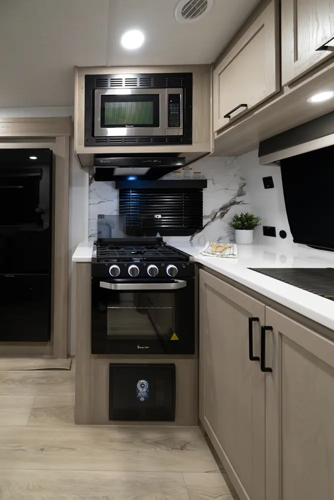 • Platinum Package: Auto Leveling, Frameless Windows, 1800W Inverter, MORryde Strut Assist Entry Step, Dual 30 LP Tanks