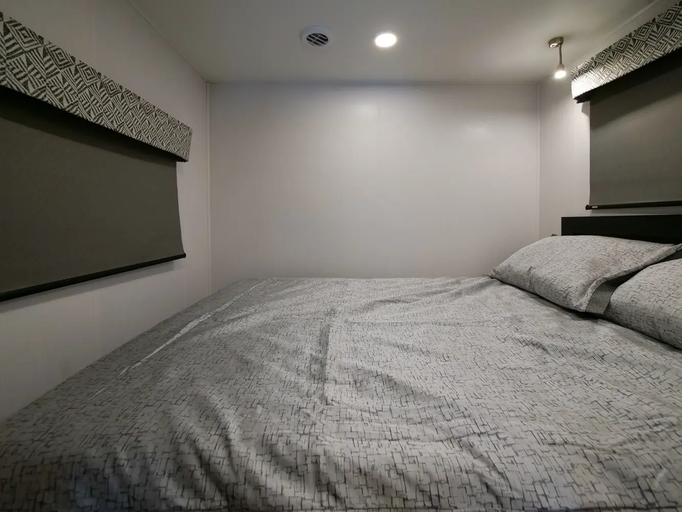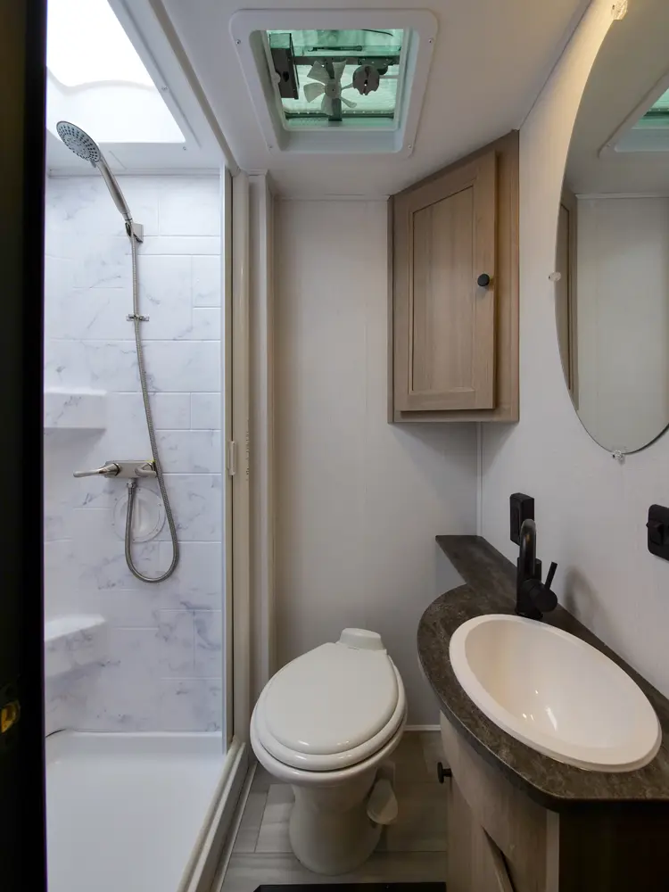 The Forester TS2381 is a great couple's coach with a 54" x 74" full bed in the bedroom and a two-person dinette with a table in between. There is a wardrobe across from the bathroom for storage. The full bathroom includes a 24" x 32" skylight shower, commode, vanity sink with extended countertop, and medicine cabinet. The kitchen offers a corner counter 12V 10 CU FT refrigerator, convection microwave, and 3-burner stovetop. Overhead cabinets throughout provide additional storage.