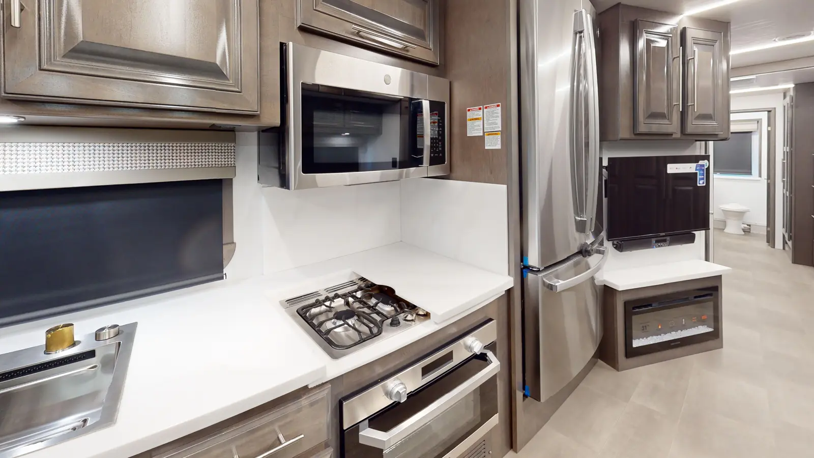 The Georgetown 36K7 by Forest River is designed for family comfort with two full baths and bunks. The kitchen features a farmhouse sink, 3-burner cooktop, microwave, and residential refrigerator. Enjoy entertainment in the theater seats across from a TV. The mid-ship full bath is across from the bunk beds. The bedroom offers a king bed and optional washer/dryer, plus a full master bath. The cab features swivel captain seats, a table, and a power overhead bunk.