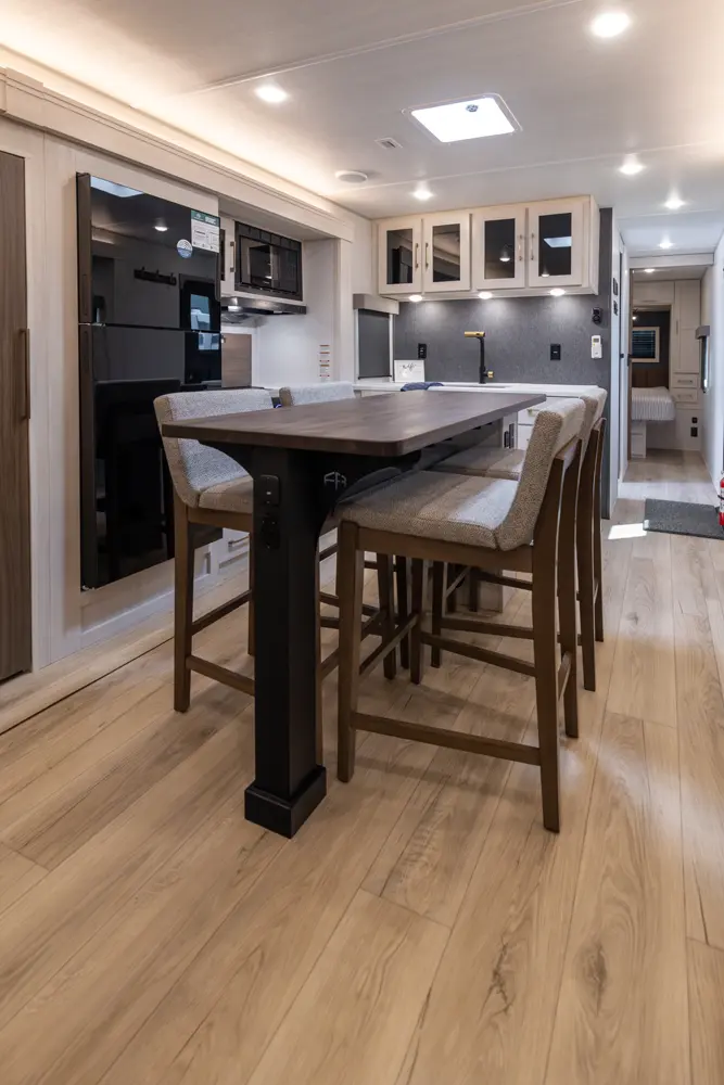 This 36' 7" travel trailer offers a spacious rear living area with dual opposing slides, creating an open, inviting space. The modern kitchen is equipped with a 10 cu. ft. 12V black glass refrigerator and a 3-burner residential-style range with glass cover. The custom king bedroom suite features ample storage, motion lighting, and a privacy wall. Exterior features include a 12' electric awning with LED lights, outdoor camp kitchen, TrailGate outdoor bar, and a hot & cold spray port.