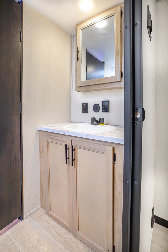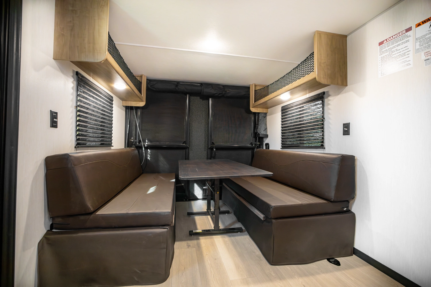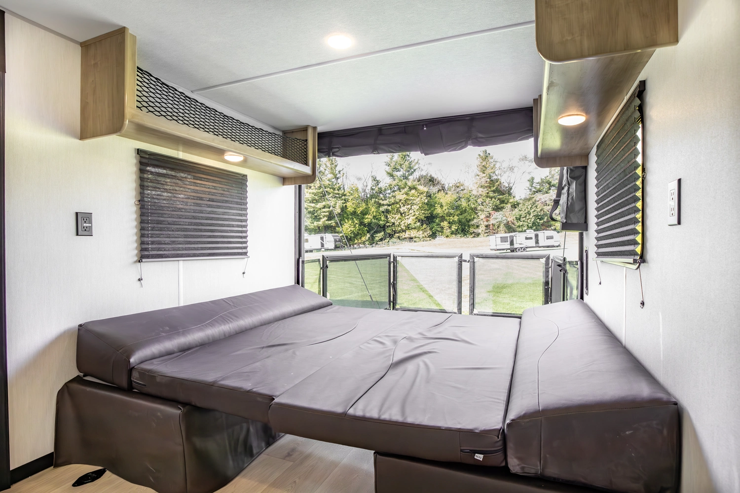 The Cherokee Grey Wolf 27RR by Forest River is a luxurious travel trailer that offers a unique camping experience with a ramp door that doubles as a patio. The private 11-foot toy hauler garage, convertible into a sleeping area, is perfect for storing toys, bikes, or other gear. The outdoor kitchen, complete with a shower, speakers, TV hookup, and a rear ramp-turned-patio, is ideal for outdoor entertaining. The bedroom, with a queen-size bed and a full bathroom, provides a peaceful retreat.
