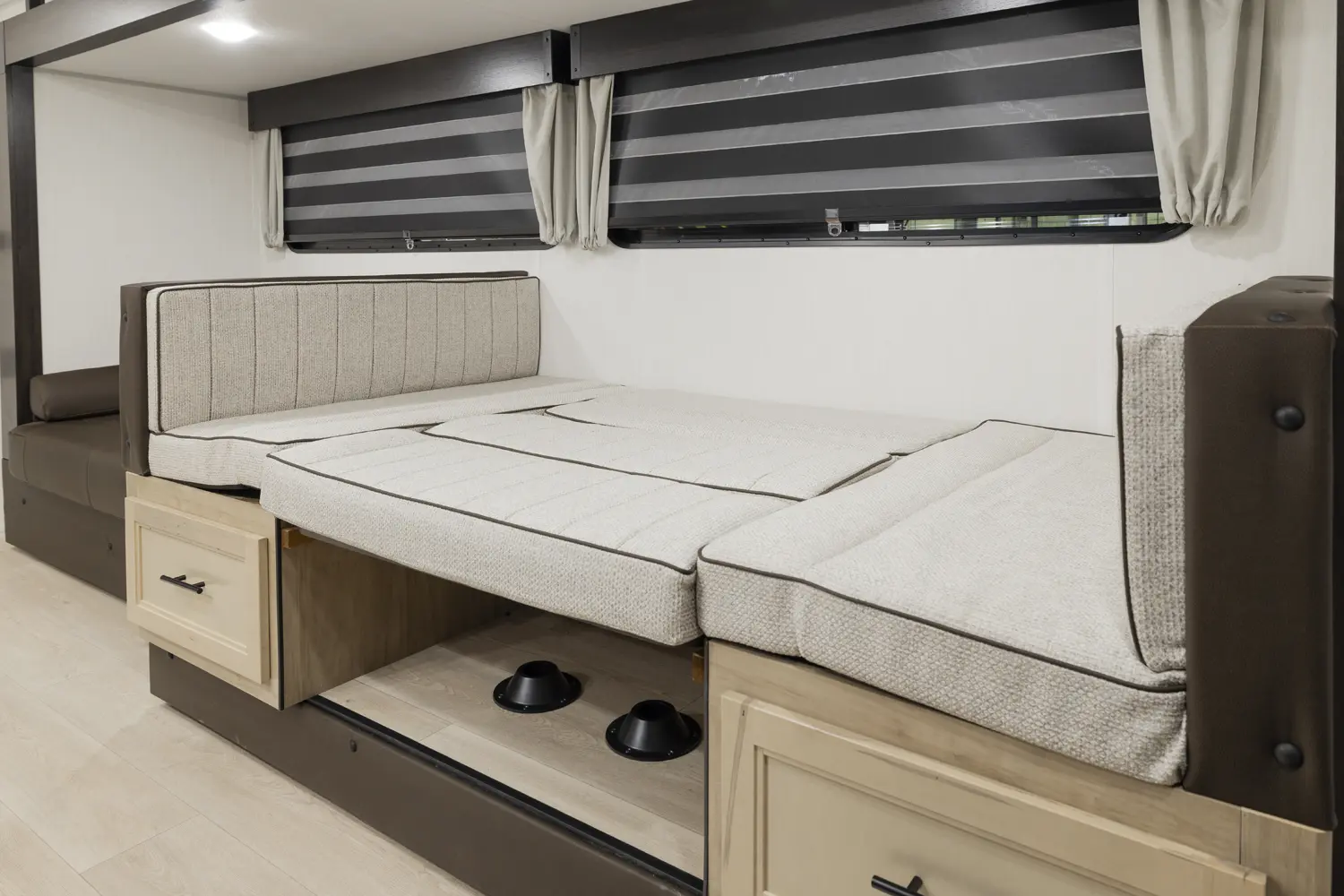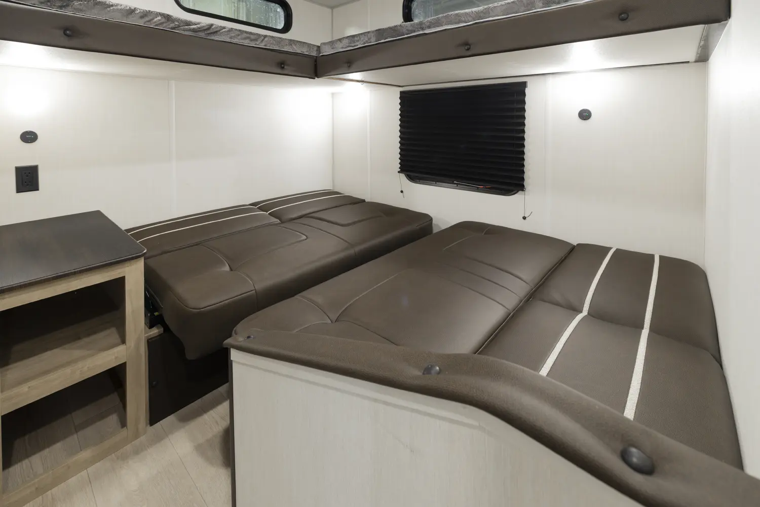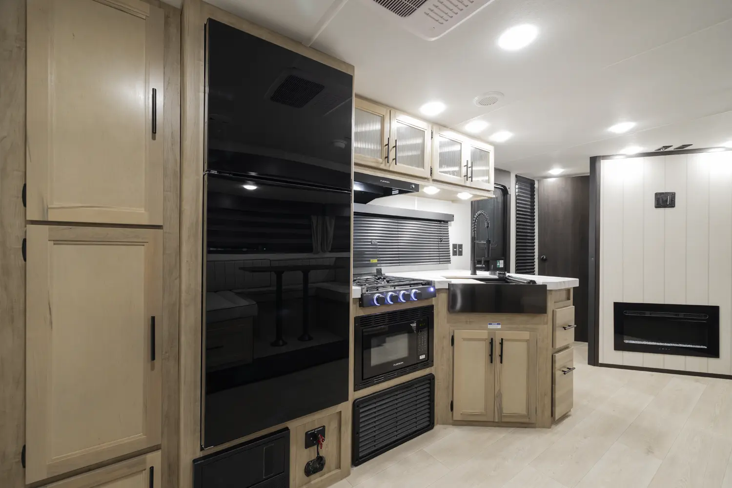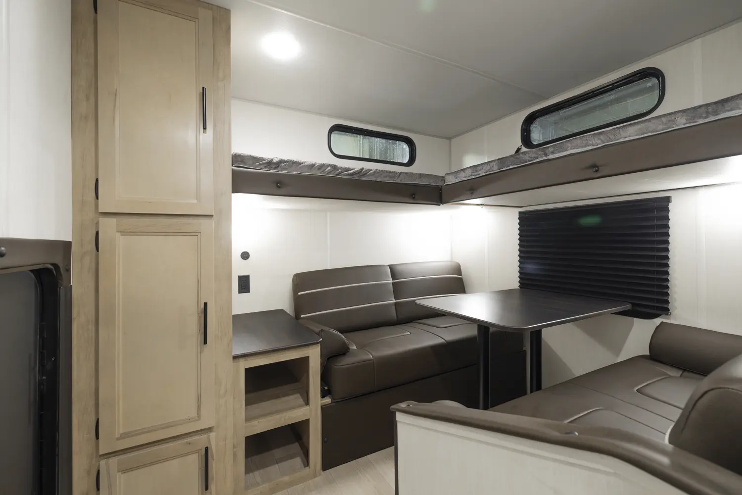 The Cherokee Grey Wolf 29NM by Forest River offers a unique floorplan with a rear bunkhouse that features a collapsable dinette, providing flexibility and space-saving functionality. The spacious living room, highlighted by a cozy fireplace and large windows, creates a welcoming atmosphere. The well-equipped kitchen, with its U-shaped dinette, full pantry, and ample prep space, is perfect for cooking and entertaining. Experience the comfort and versatility of the Cherokee Grey Wolf 29NM.