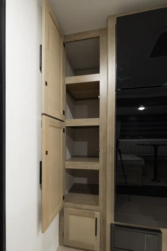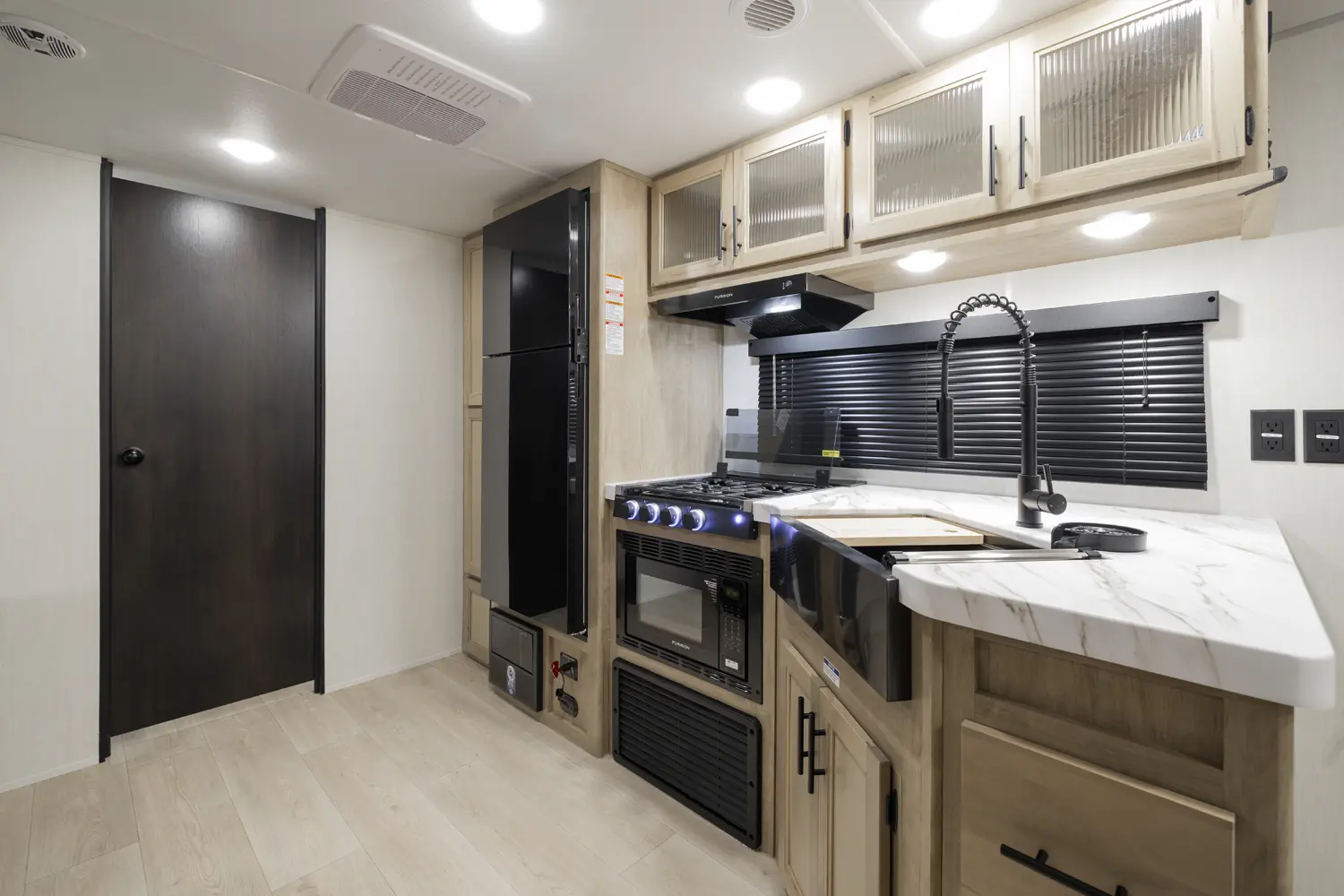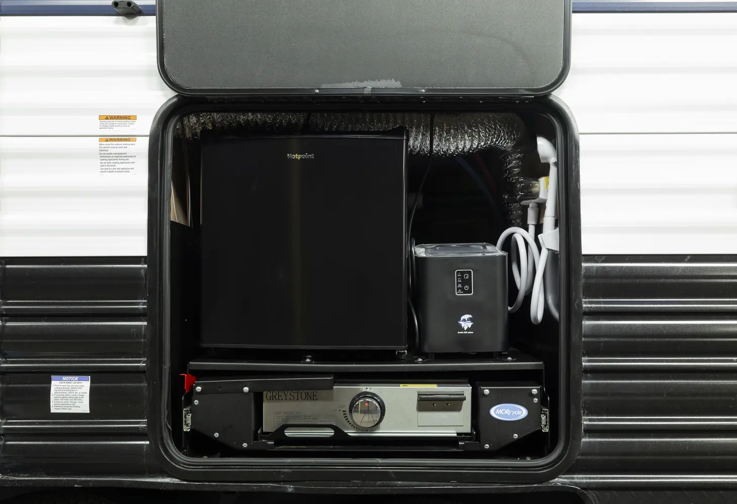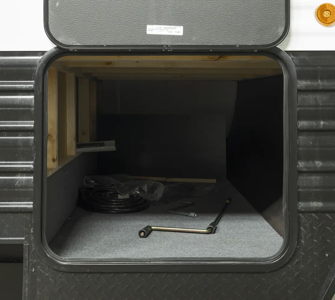 The Cherokee Grey Wolf 29NM by Forest River offers a unique floorplan with a rear bunkhouse that features a collapsable dinette, providing flexibility and space-saving functionality. The spacious living room, highlighted by a cozy fireplace and large windows, creates a welcoming atmosphere. The well-equipped kitchen, with its U-shaped dinette, full pantry, and ample prep space, is perfect for cooking and entertaining. Experience the comfort and versatility of the Cherokee Grey Wolf 29NM.