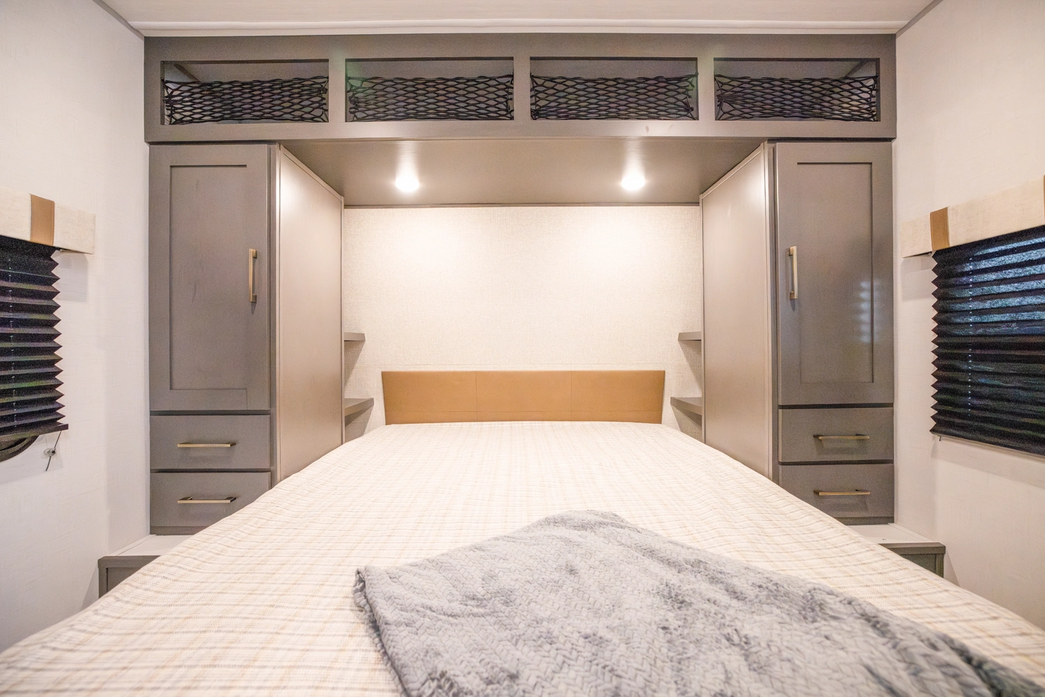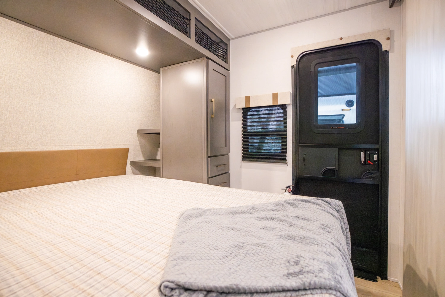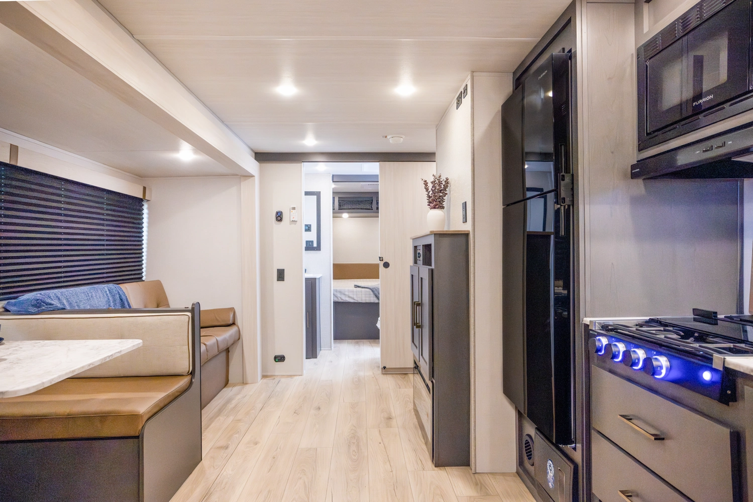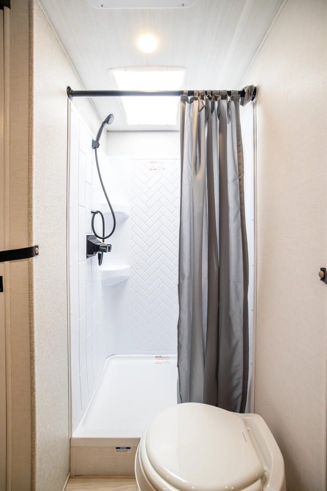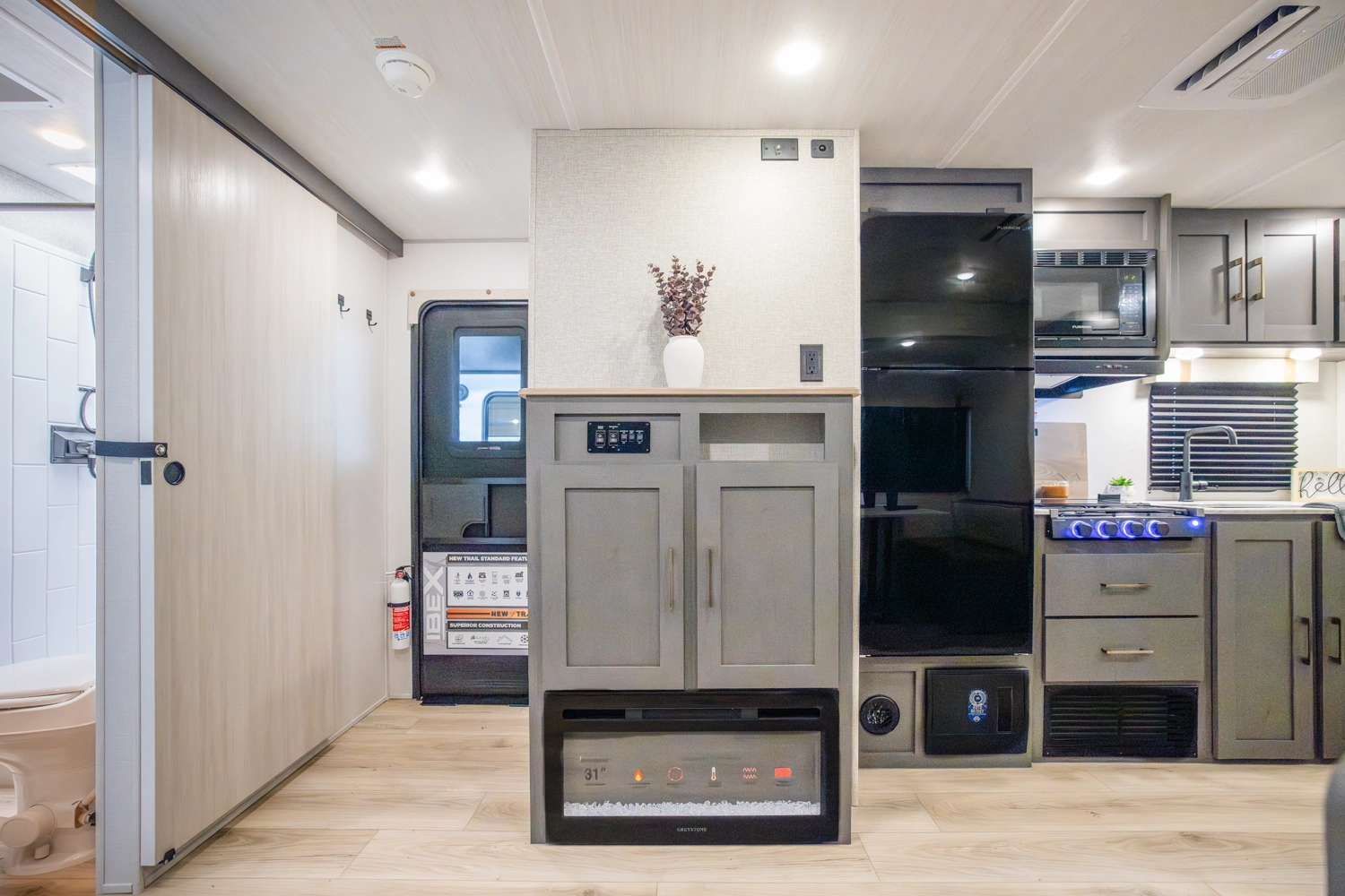 The Ibex New Trail Edition TRAIL28 features a front queen bed, central living area with sofa and dinette, a full kitchen, and a walk-through bath. A private rear bunk room offers four bunks and extra storage. Includes washer/dryer prep, tankless water heater, 50-amp service, and designed with superior construction.