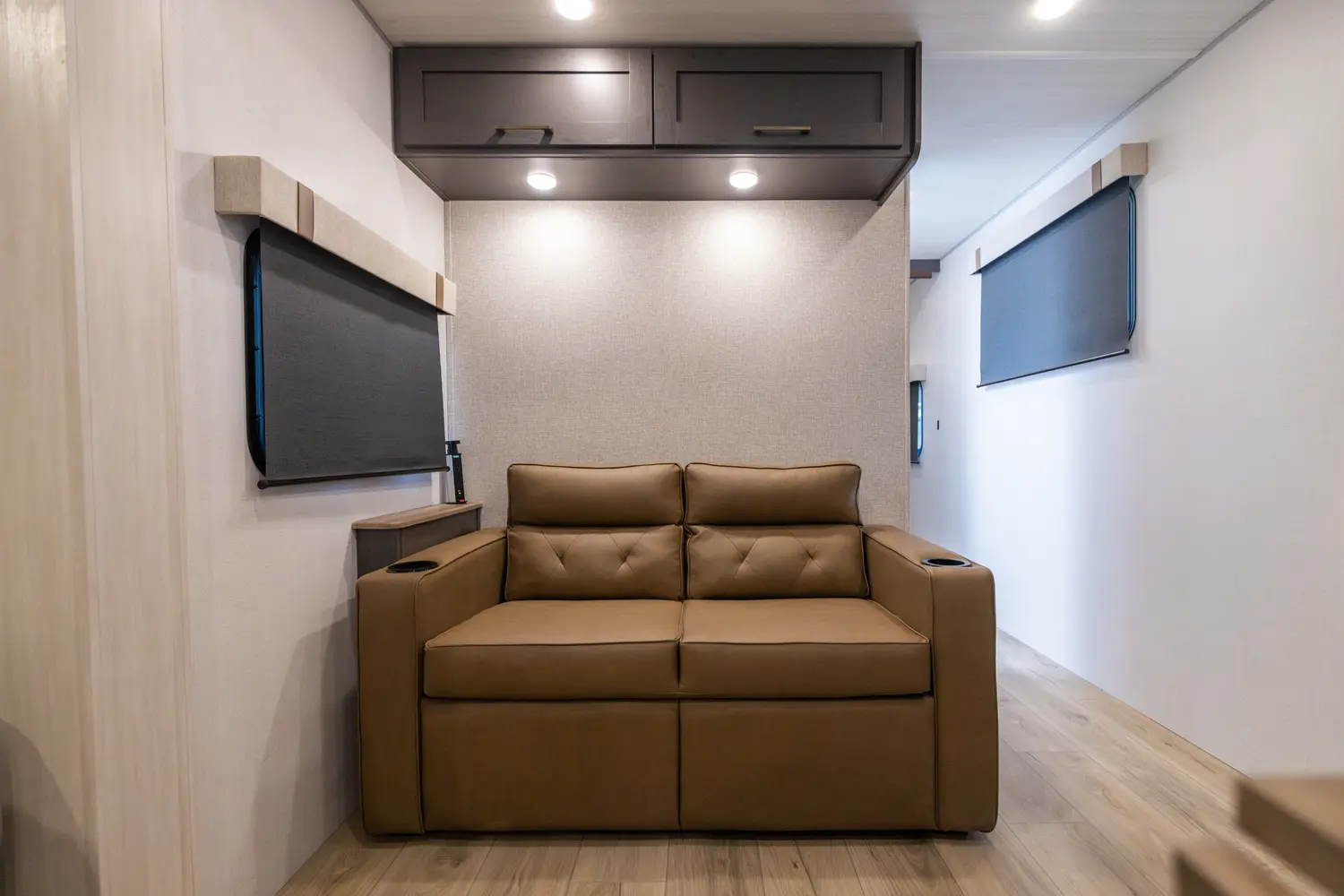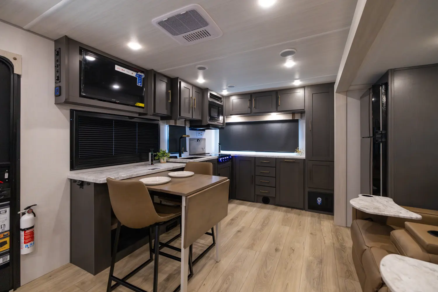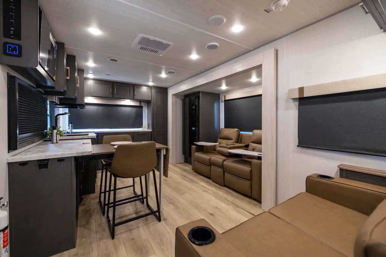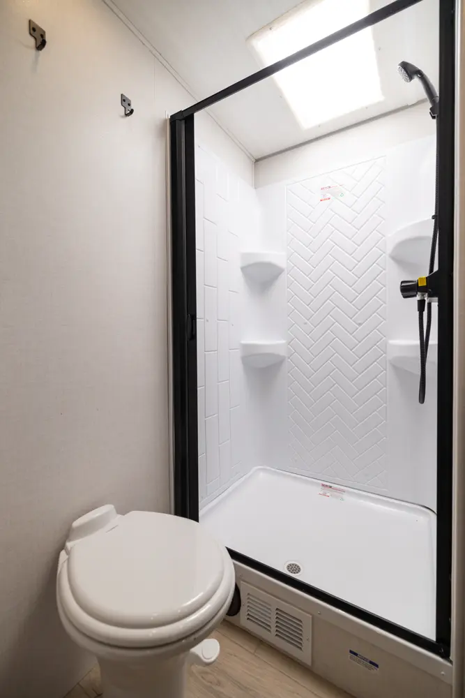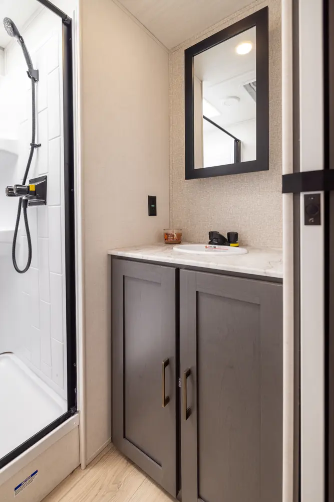 The 26BRE features an innovative layout with a front queen bedroom with dual wardrobes, and provides ample storage space. The central kitchen includes modern appliances, including a large refrigerator and air fryer microwave, while the Bar 2 Table feature converts from a bar into a four-person dining table. The 26BRE includes an enclosed underbelly with forced heat, radiant foil insulation, and 12V heating pads on all tanks. Complete with a 20' power awning and rugged construction.