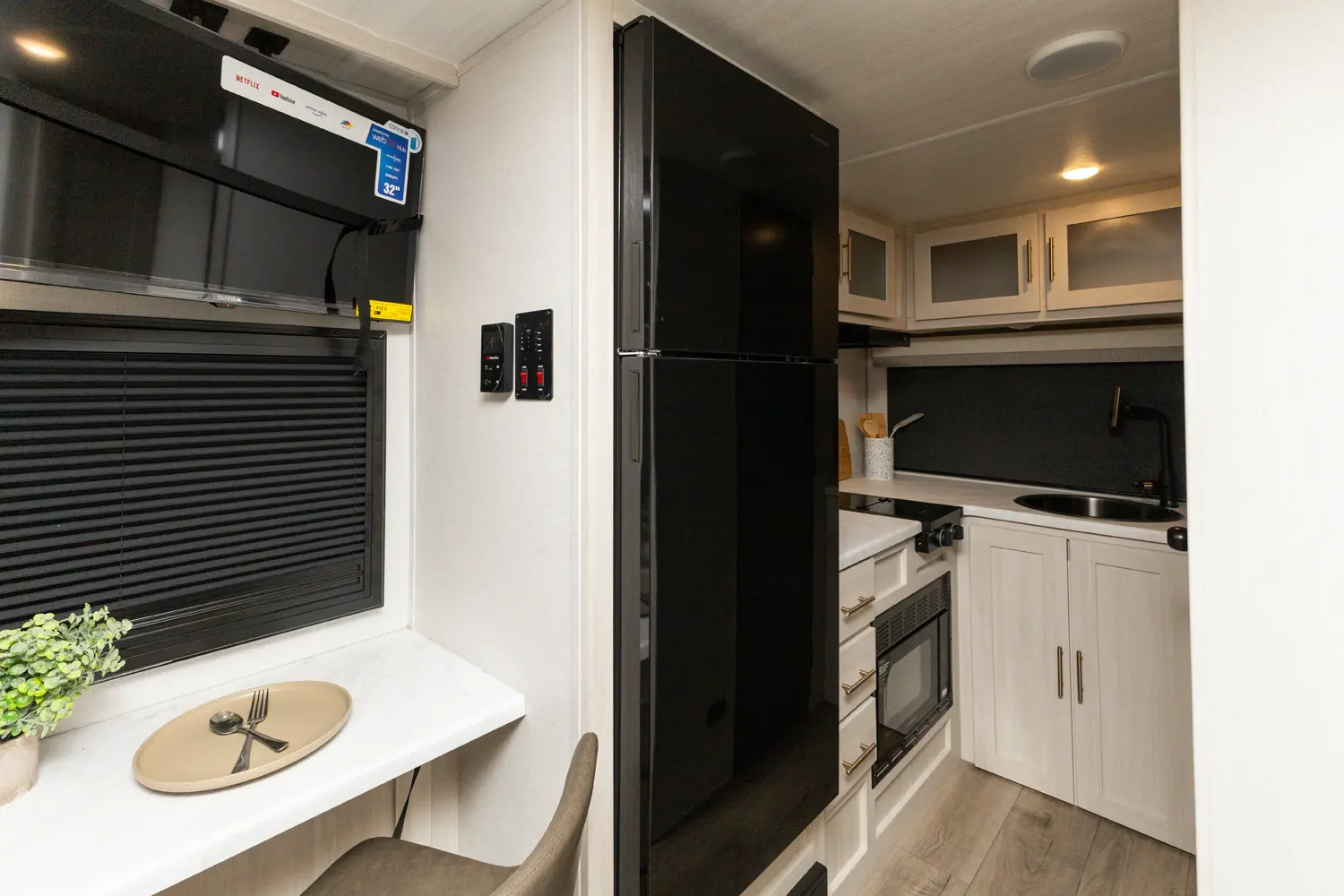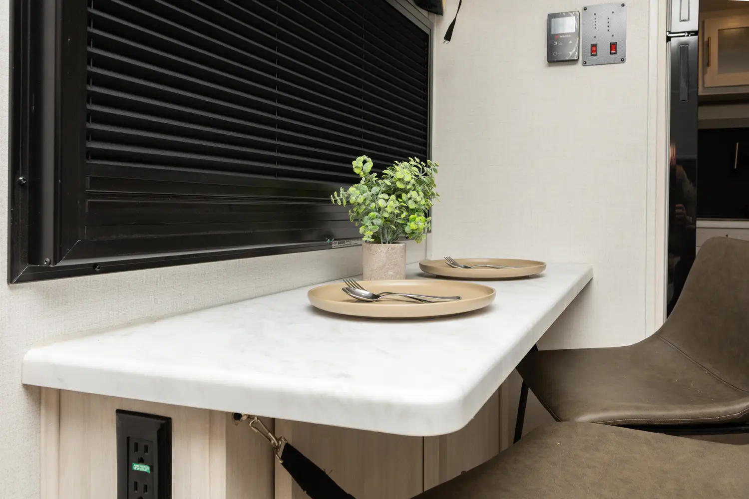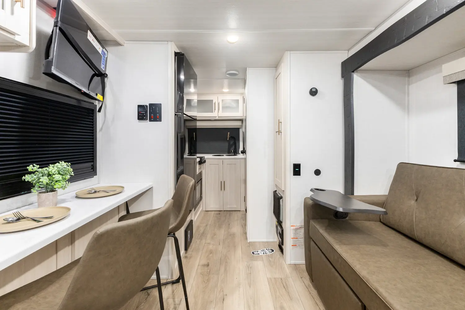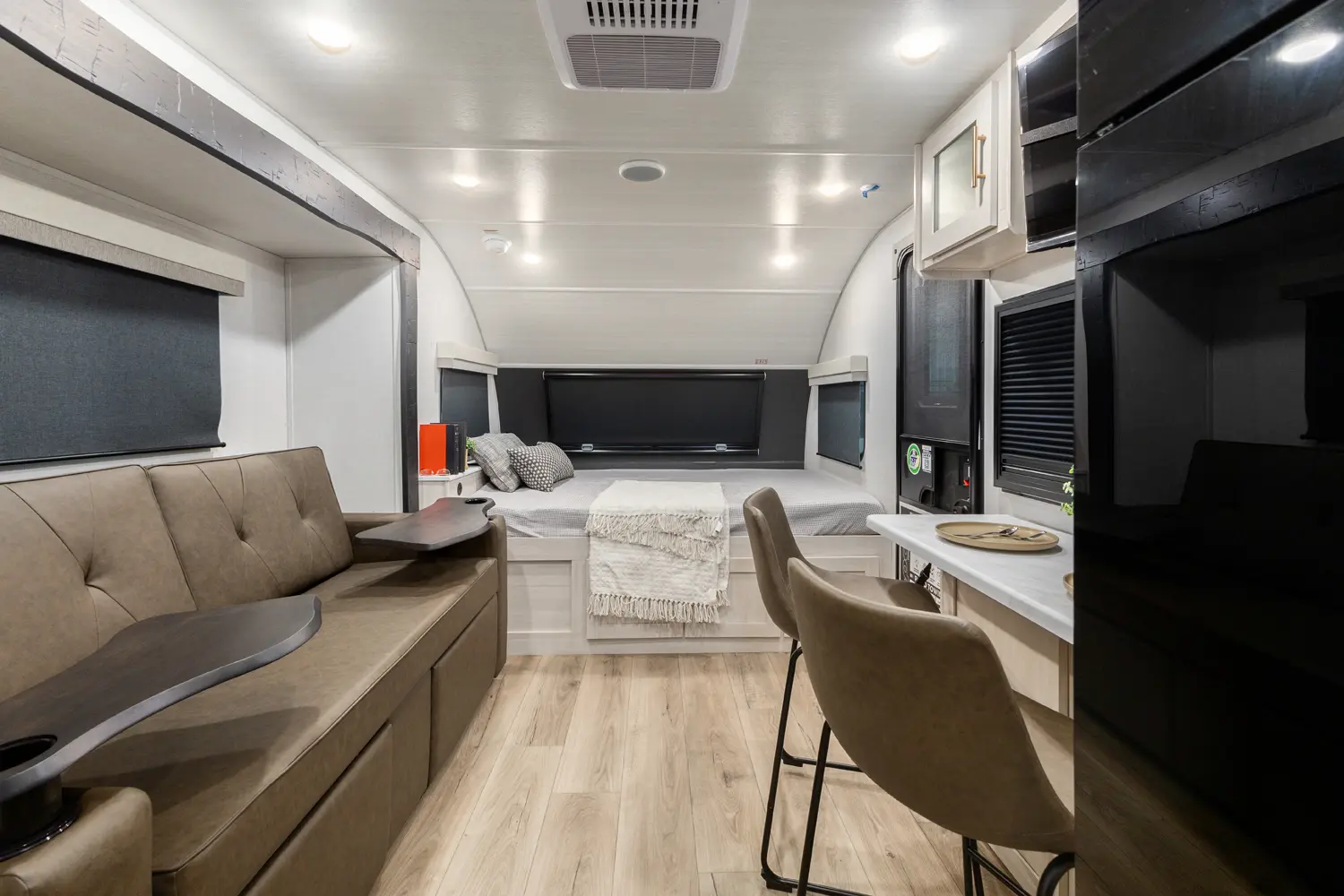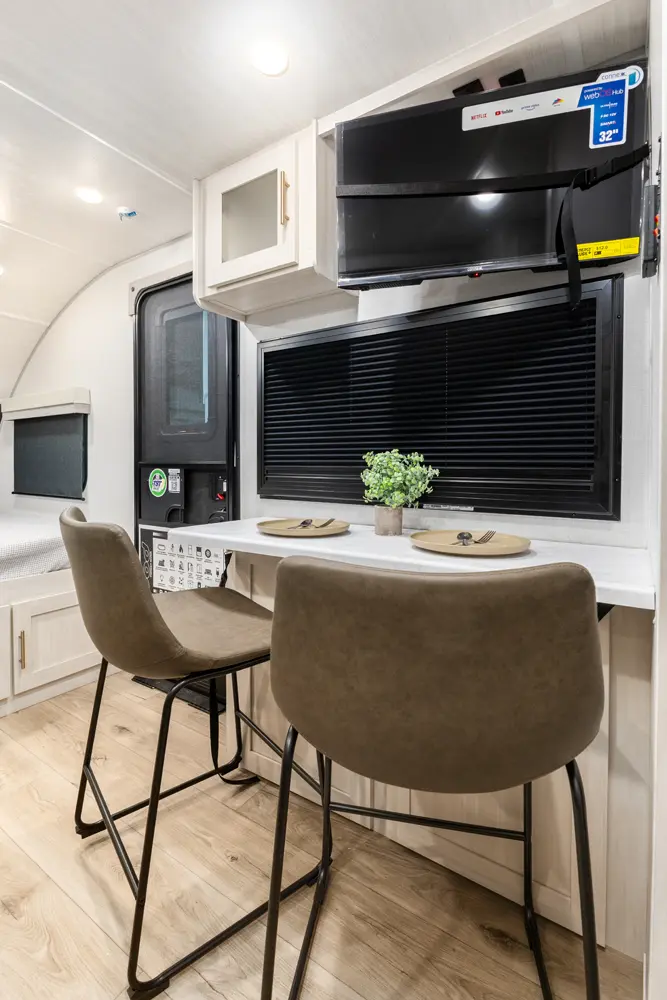 The RP-185 delivers a perfect balance of lightweight design and spacious comfort. Inside, you’ll find a roomy rear bath, well-equipped kitchen, and inviting dinette that converts for sleeping space. A unique bar top with a flip-up window creates an open-air feel, perfect for serving or relaxing outside. Modern finishes and clever storage complete this travel-ready design.