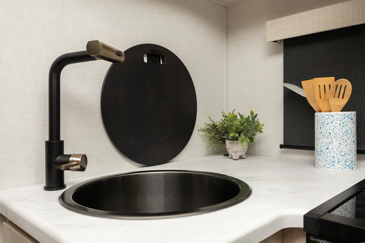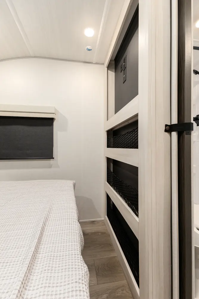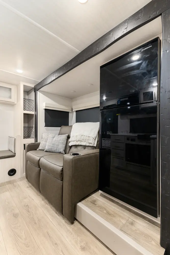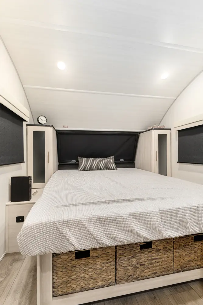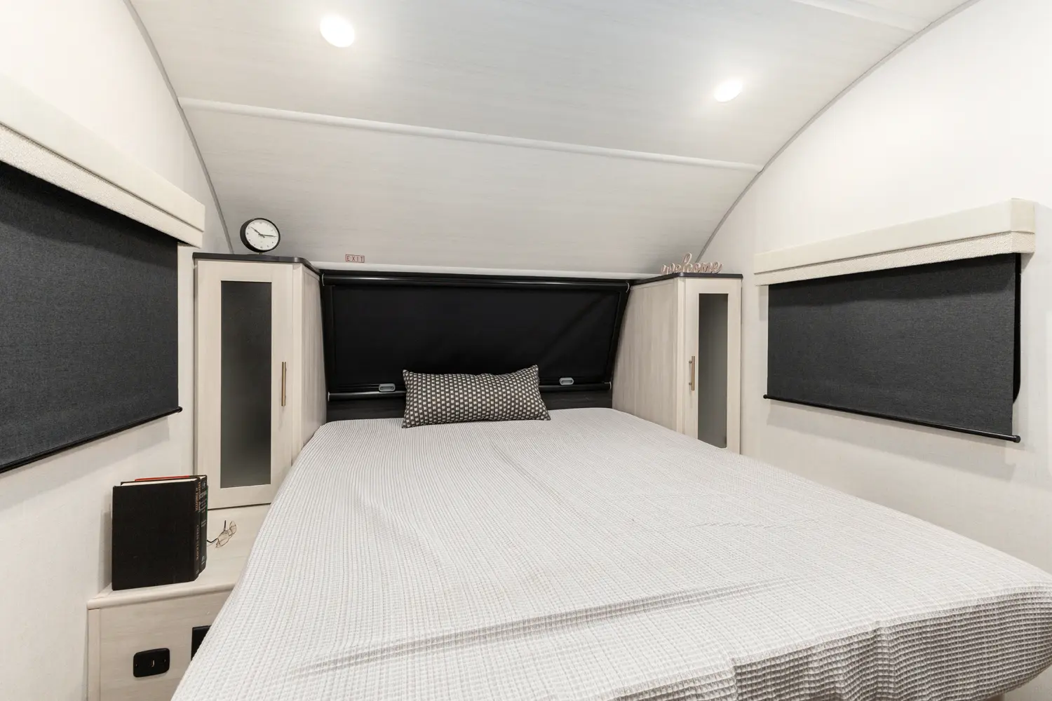 The RP-198 offers lightweight towing with a smart, efficient layout. A private front queen bed provides restful nights, while a pass-through bath is accessible from both the bedroom and main living area for convenience and privacy. The kitchen and dinette area make meal prep and dining easy, with ample storage and modern finishes throughout. Ideal for couples or small families seeking comfort on the road.