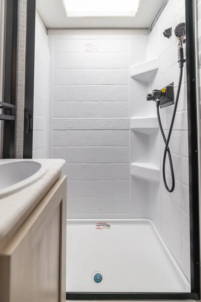This 25' 8" ultra-lite travel trailer offers a spacious layout with a private front queen bed and a full rear bath. The well-equipped kitchen features a bar top with a flip-up window, convection microwave, and 12V refrigerator. Inside, enjoy 64" theater seating for relaxation. Exterior amenities include a 13' power awning and a hot & cold spray port, perfect for compact adventures.