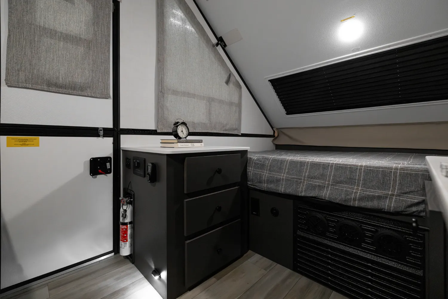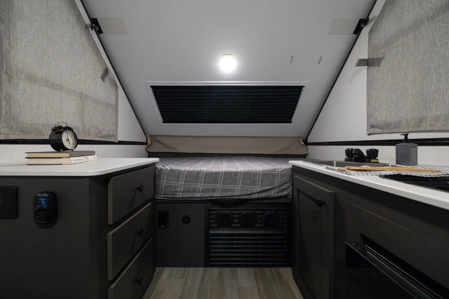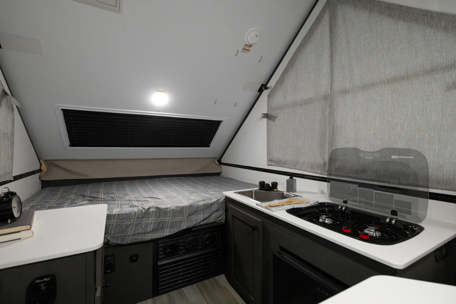 The A122S is exactly like the A122 with a large storage area on the front with all the comfort features and sets up into a firm structure in just minutes. The large window on the front side gives the dinette plenty of seating for four. If you're looking for a small A-frame camper with tons of storage, this is the camper for you.