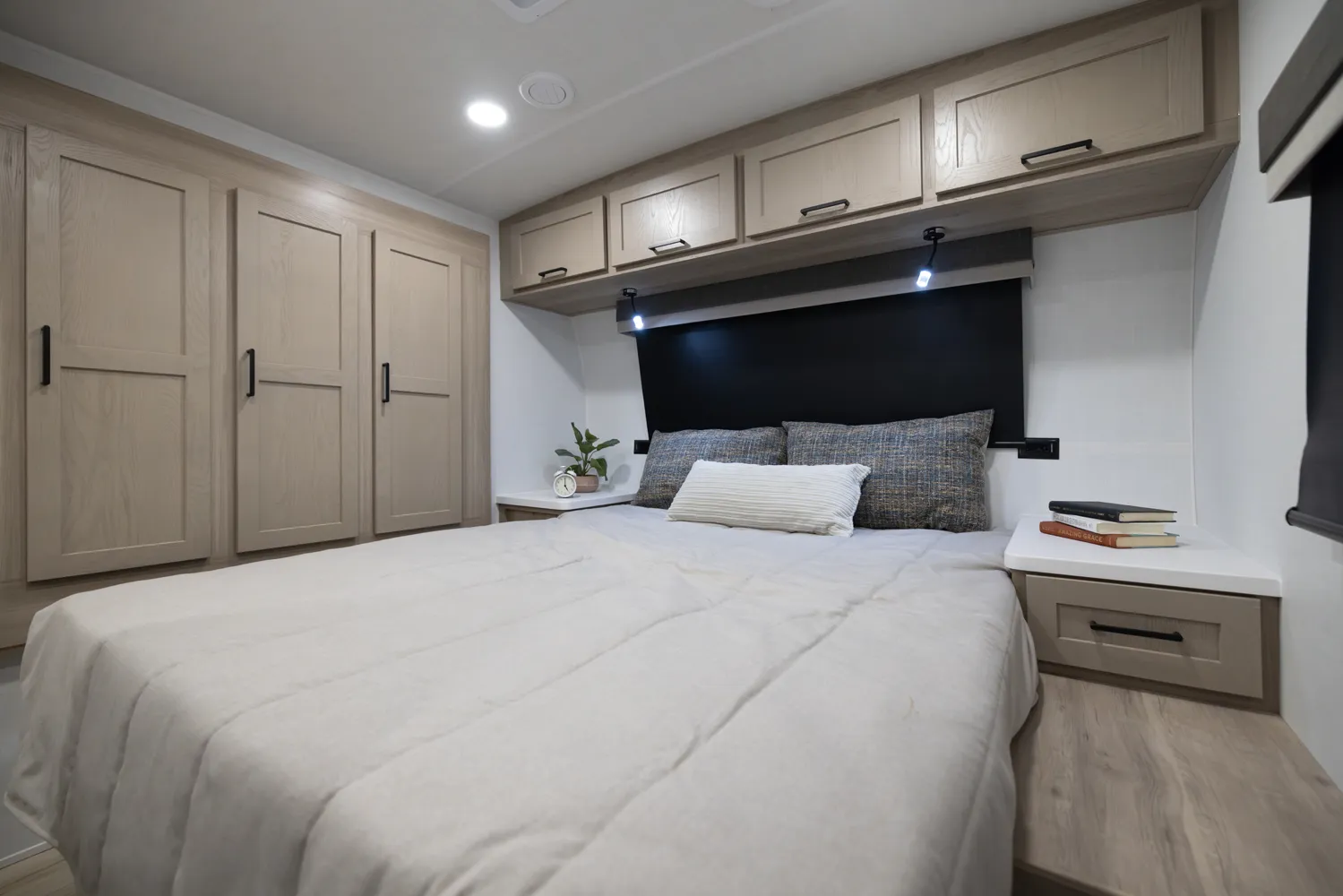 The outside kitchen on this Rockwood Mini Lite featuring our new griddle, a refrigerator and grill makes cooking so enjoyable and flexible. No need to take the smell of cooking bacon inside. The large wardrobe slide makes packing and organization so easy. The large pantry next to the bathroom covers all your kitchen storage needs as well. The center position of the television in your entertainment spaces makes viewing from any part of the living quarters easy.