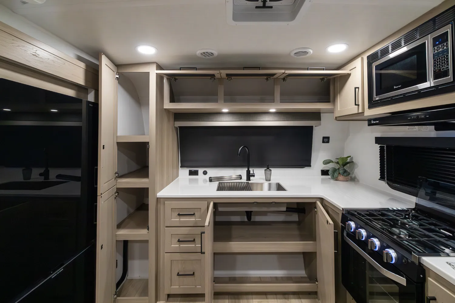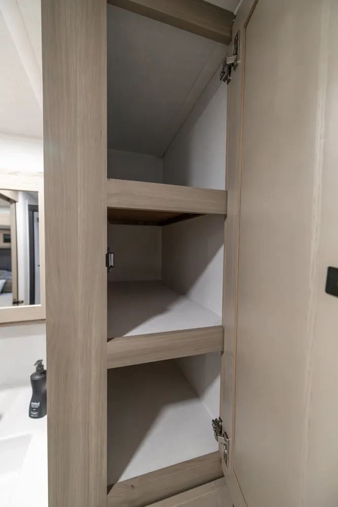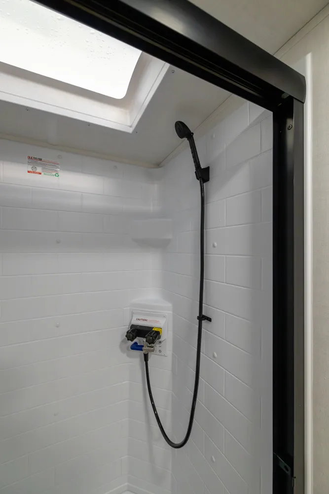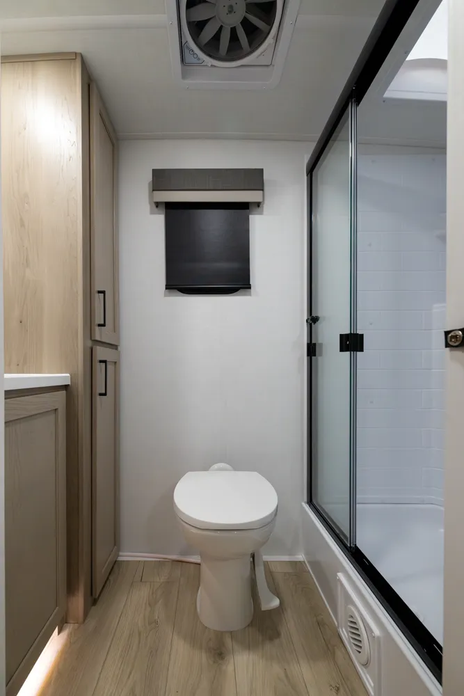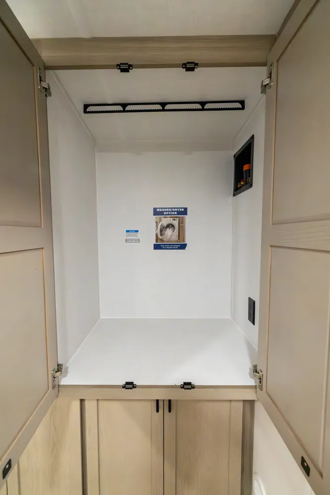 The front kitchen with a large window creates an open, inviting feel with great campsite views. Theater seating faces the entertainment center for easy viewing, with an optional hide-a-bed for guests. The bedroom includes a queen bed in a slide-out, dresser, and wardrobe with washer/dryer prep. A spacious bathroom with a large shower and linen storage adds comfort and convenience, making this coach feel like home.