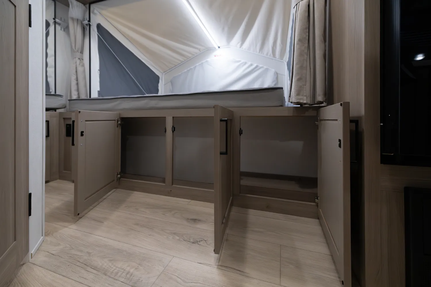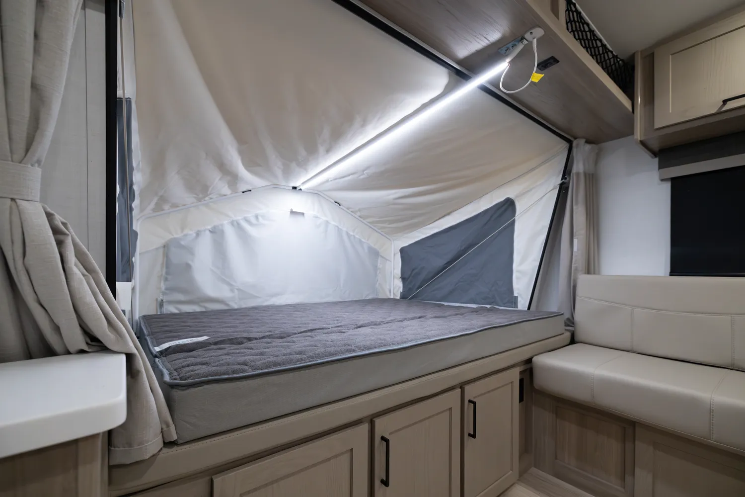 This incredibly popular floor plan has three bed expandables and one slide out featuring a large U-Shaped Dinette. All three expandable beds are residential Queen 60 x 80 beds. There is also sleeping on the 44 x 85 U-Shaped dinette and on the 67” flip out sofa. With the potential to sleep 10 people in a coach that weighs just over 5,000lb, this is a truly unique floor plan.