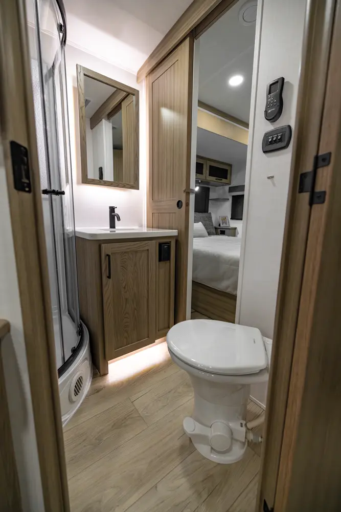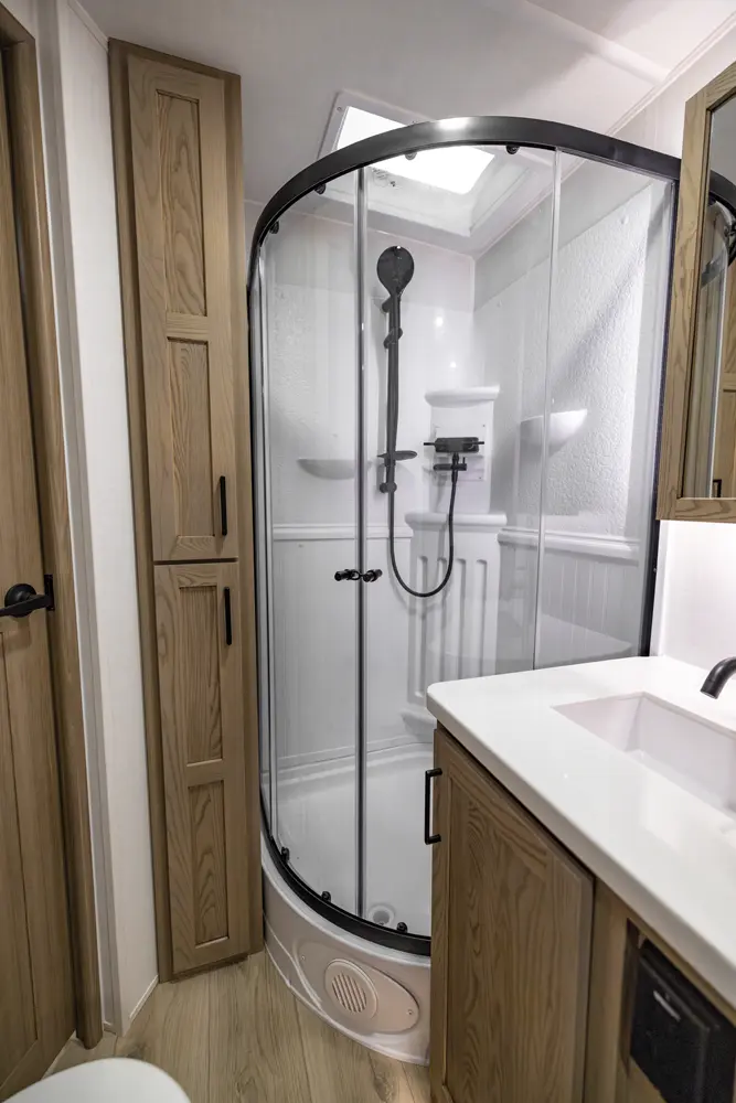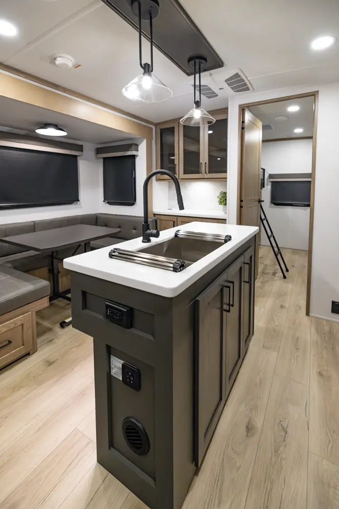 This four slide bunk model has great sleeping arrangements and a U-Dinette that can seat everyone for dinner. The outside camp kitchen has a large refrigerator and cooking stove to feed everyone you are sleeping for the trip. The bunkroom has its own entertainment and hard door for separation from the rest of the coach. The king bed option and the washer and dryer prep make this coach great on every occasion for any family.