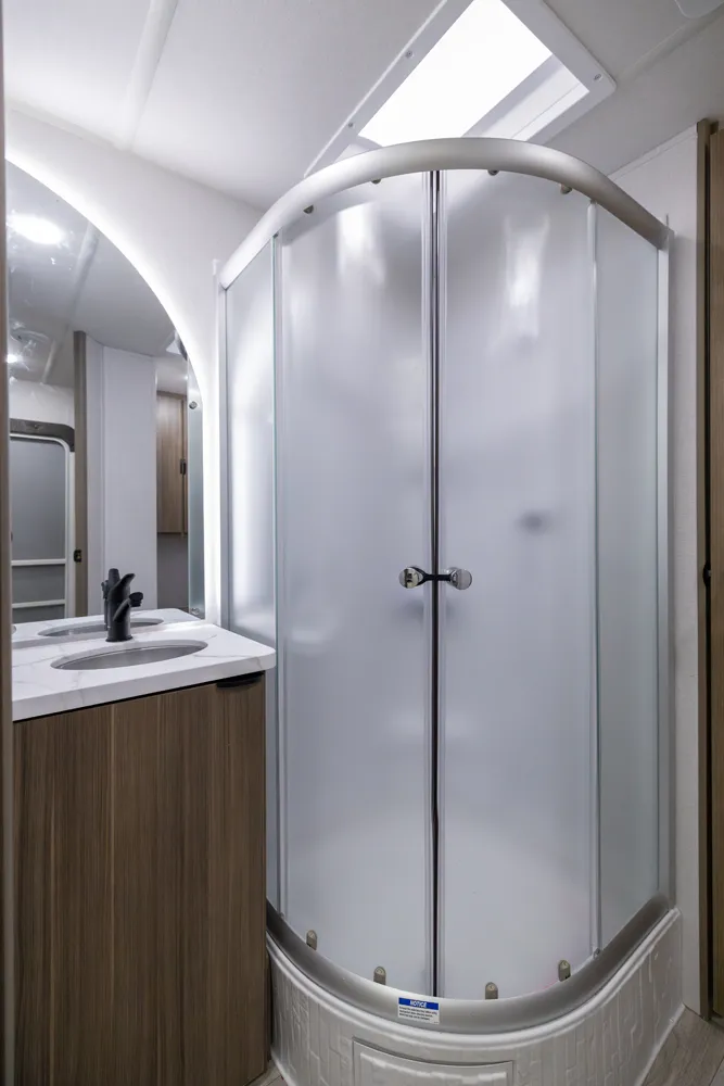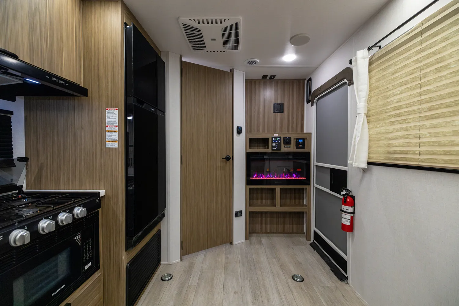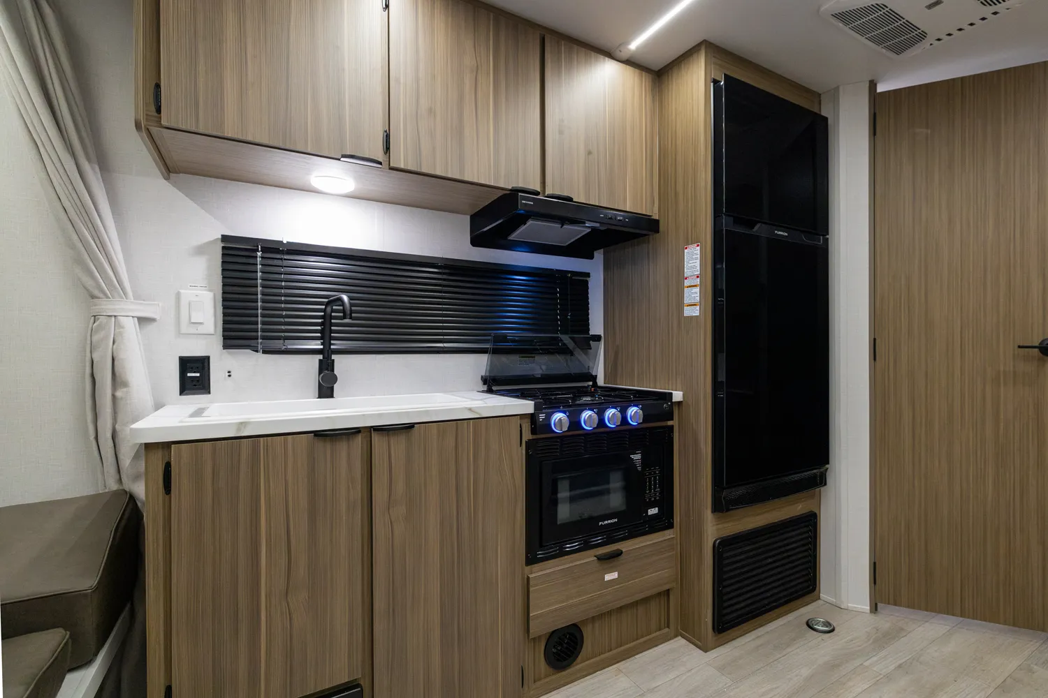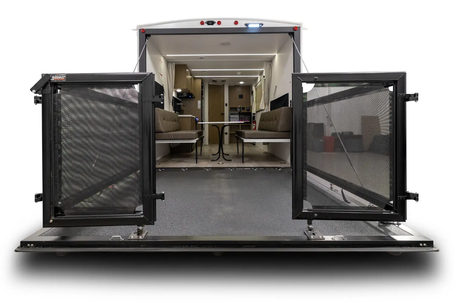 The 260RTK front bedroom provides a queen bed with extra storage, while the adjacent bathroom gives you a large skylight shower and mirrored linen closet. The kitchen provides modern appliances, panoramic window, and faux stone accent wall with entertainment center. Taking the crew on the road? The flip-down sofas and removable dining table in the garage convert to a king bed. Plus, the ramp door doubles as a party patio. At just over 5,000 lb., this toy hauler is ready to roll and easy to tow.