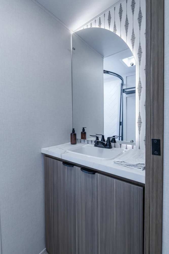 The 27RK stands out with its spacious kitchen and panoramic campsite windows. You will love the Versa-Lounge, which can reconfigure and customize according to your needs—and conveniently below is the Stow N Go Storage! This model also provides a fireplace (heater) and 11 CU. FT. refrigerator making you feel right at home.