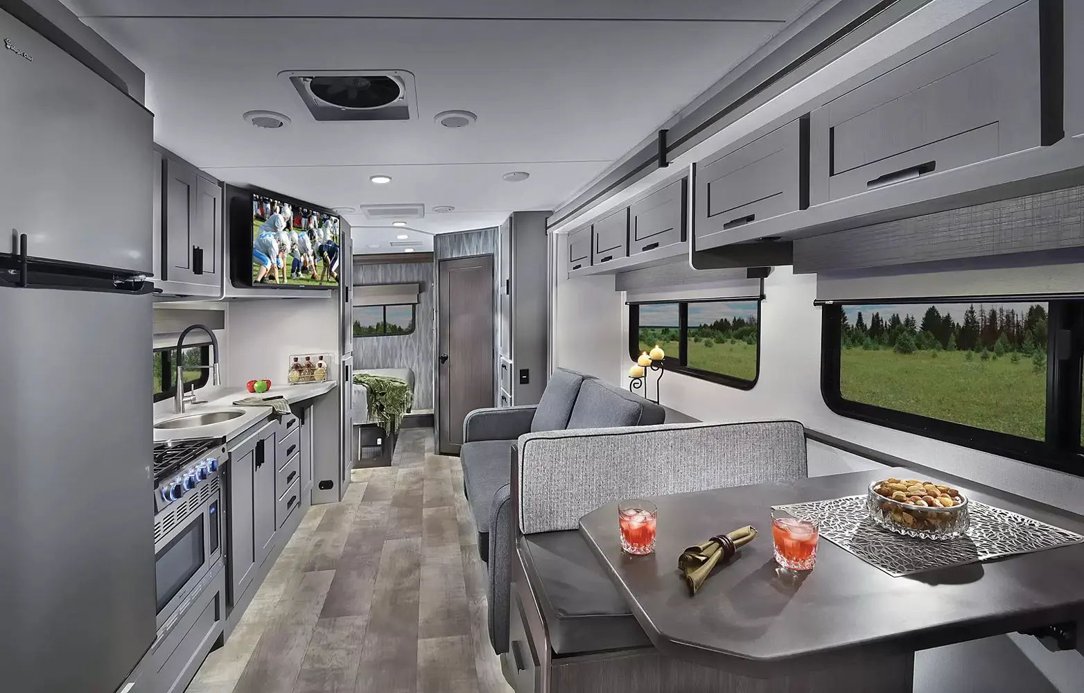 Solera’s contemporary style and residential luxury is offered in a value package designed to get you into the Class C RV lifestyle. Popular standard amenities include an 8" Sony CarPlay/Android radio, 12V LED TV, 10.7 cu. ft. 12V Refrigerator, convection microwave, back-up and side view cameras, a 12V Solar charging system and Bilstein shocks with a lifetime warranty.