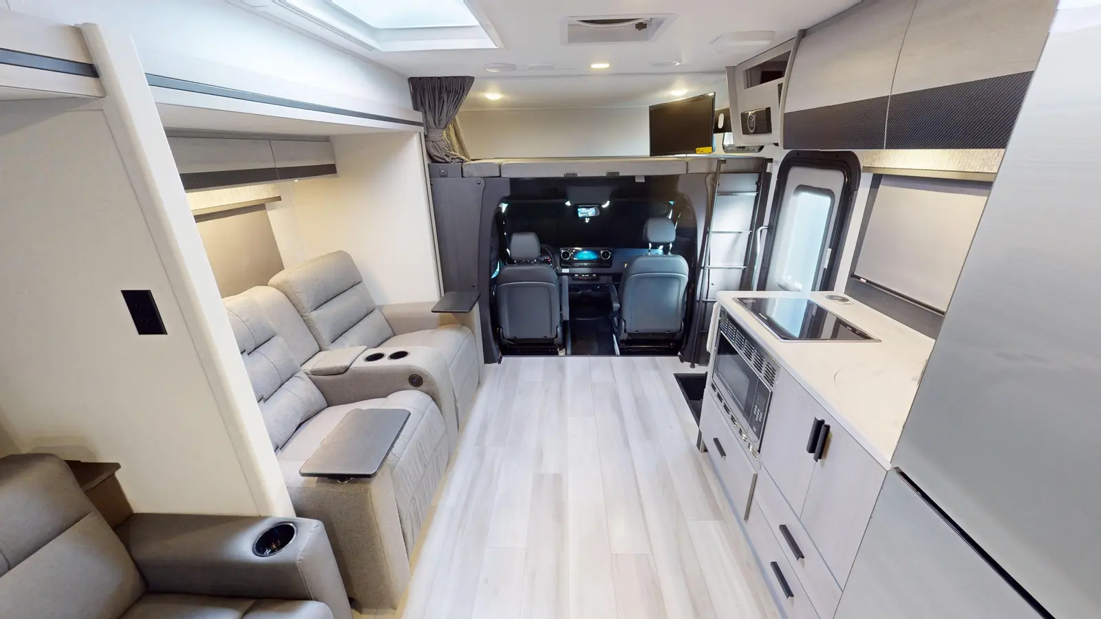 The Solera 24SRB is built on the Mercedes-Benz Sprinter 3500 chassis. It features a unique Murphy Bed in the central living area to maximize available space, in a slideout that provides even more elbow room. The kitchen area is fully equipped for meals on the go, with a 10.7 cu ft 12V refrigerator, recessed 2-burner range with flush glass cover, and a 1.3 cu ft convection microwave oven. Overhead cabinets and a dedicated closet, plus hidden drawers behind the TV, provide ample storage. The bathroom takes up the rear wall of the unit and includes a 24" x 36" shower, commode, sink with medicine cabinet, plus a linen closet.