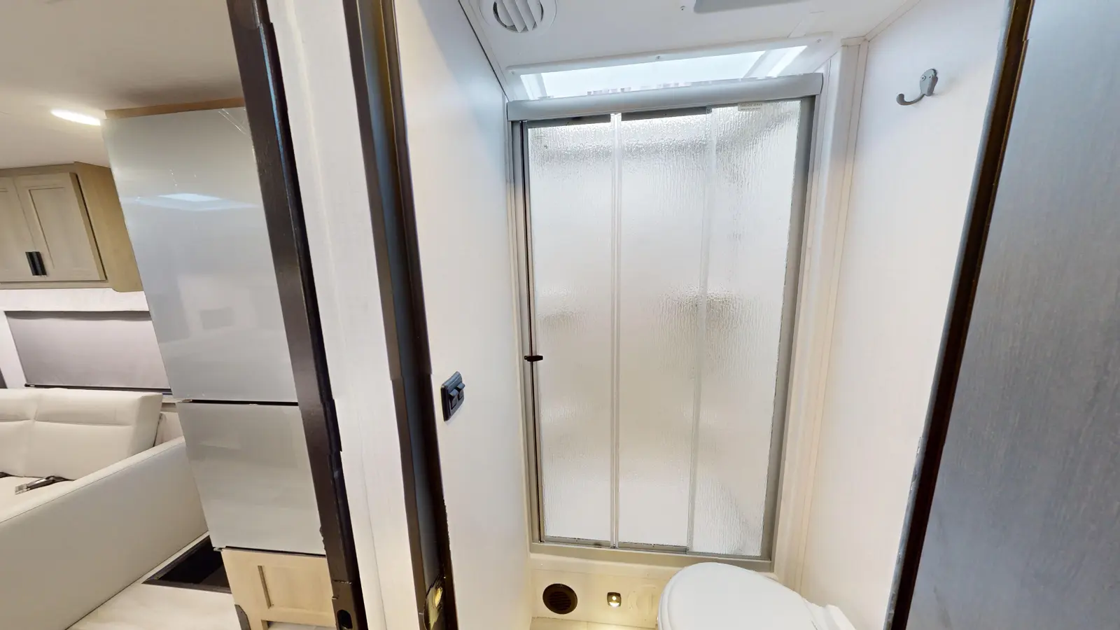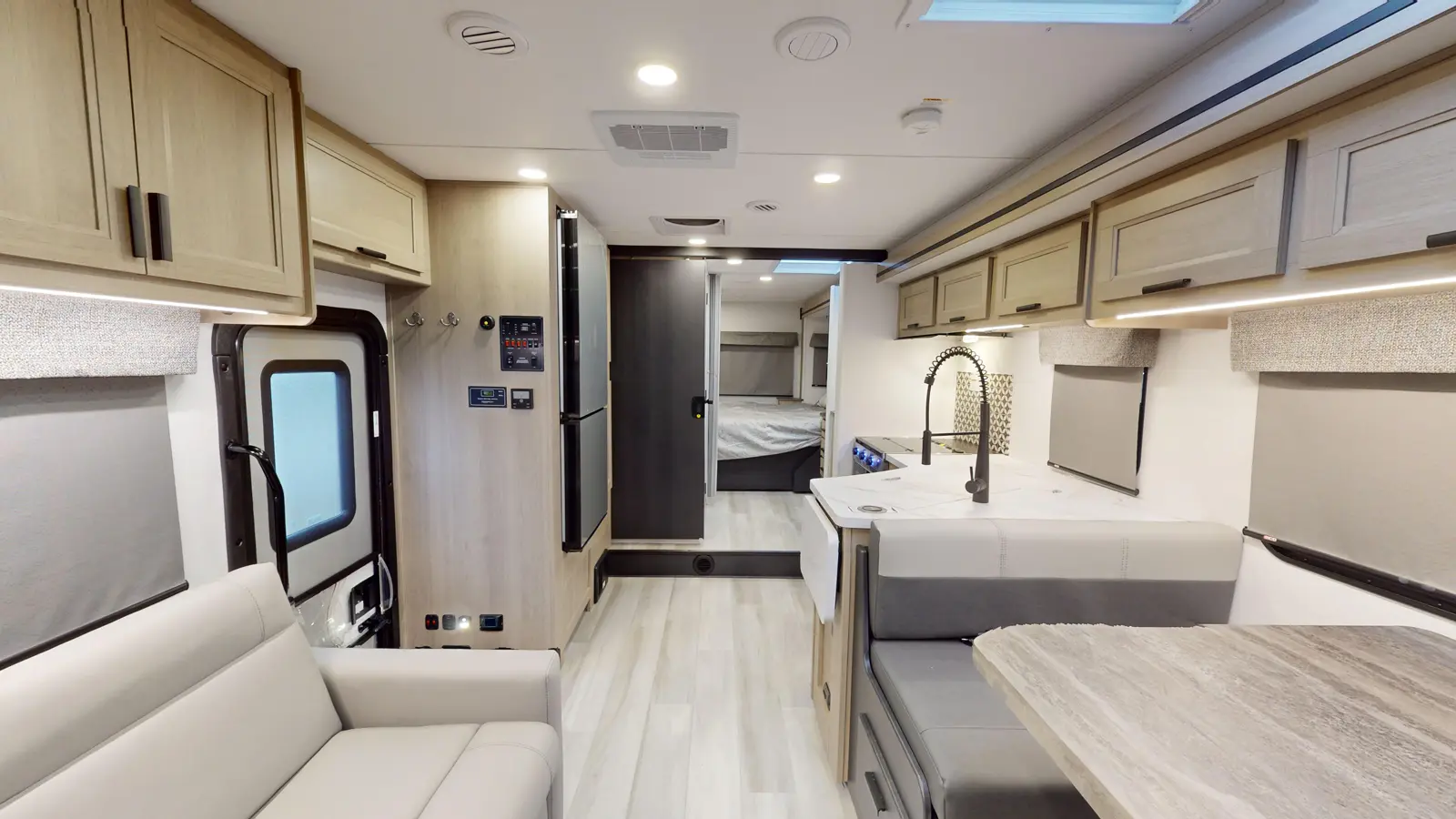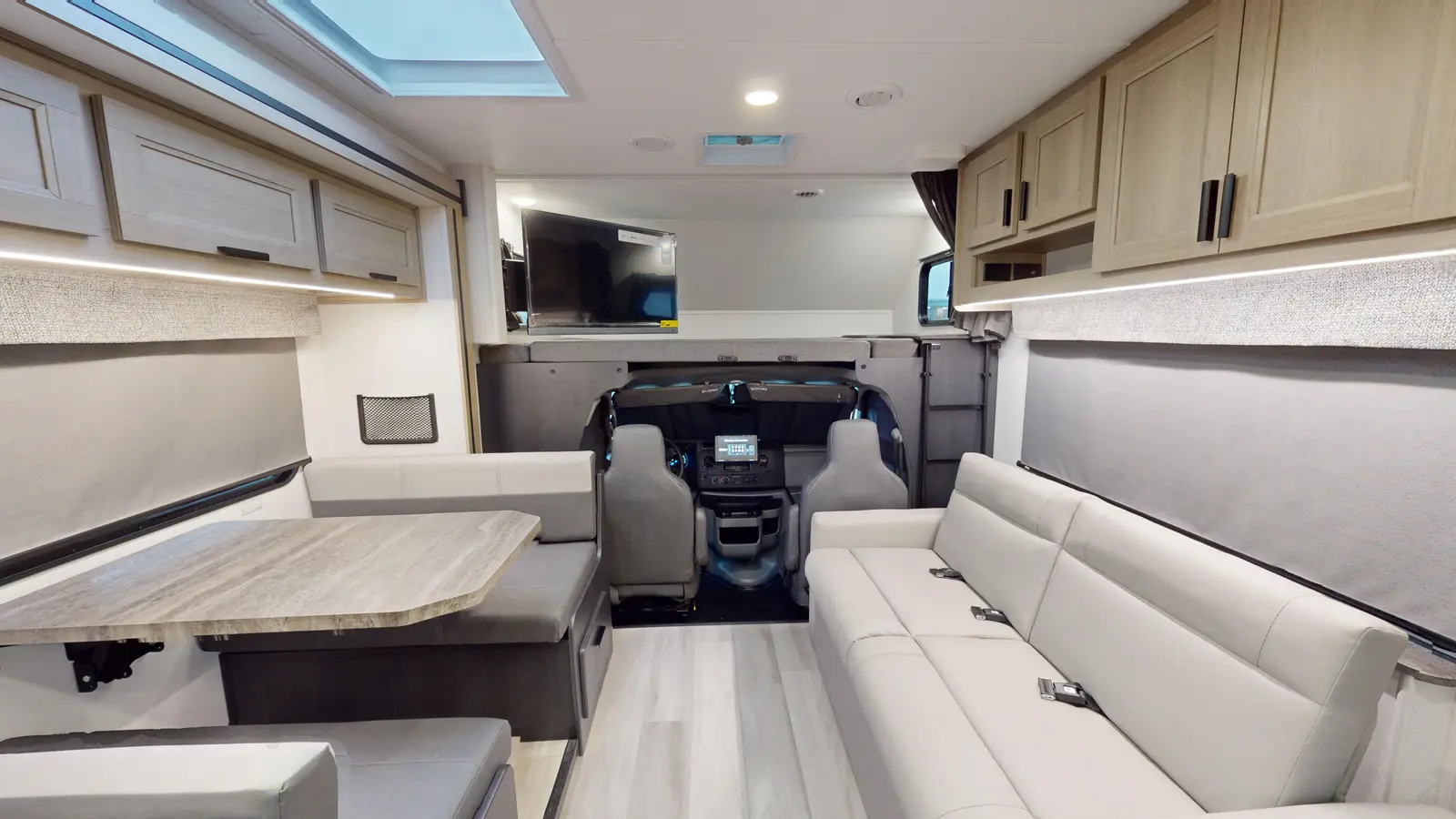 The 3050S has a large slideout, providing more room in the bedroom, bathroom, and main living are. The bedroom features a 60" x 80" bed, and storage wall with two wardrobes, drawers, and 12V TV. The kitchen is centrally located with a pantry, 12V refrigerator, cooktop, convection microwave, and flip-up countertop extension. A booth dinette is next to the kitchen counter. Choose between a sofa and theater seating, depending on your needs. Plus, enjoy a 60" x 80" cab over bunk for sleep/storage.