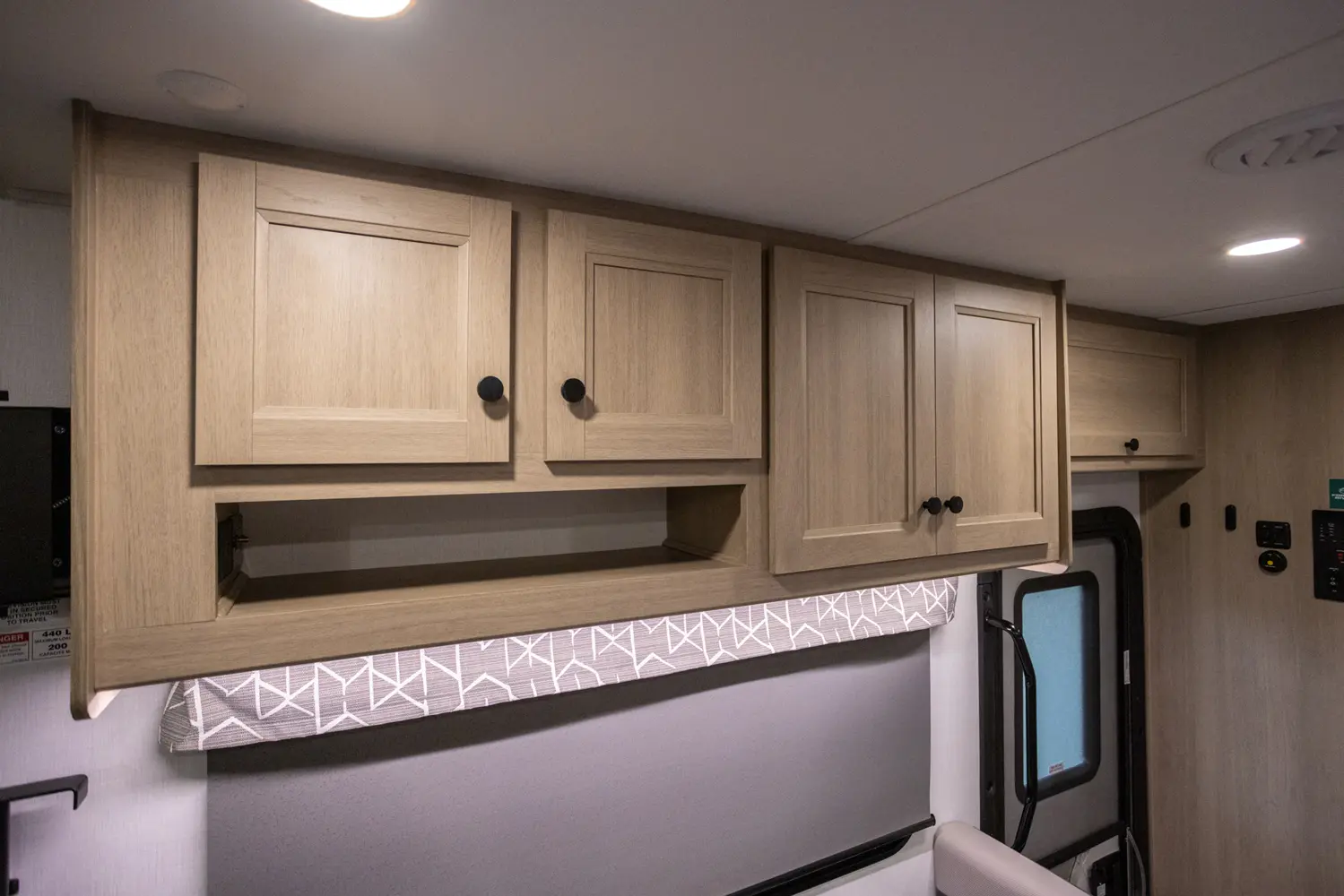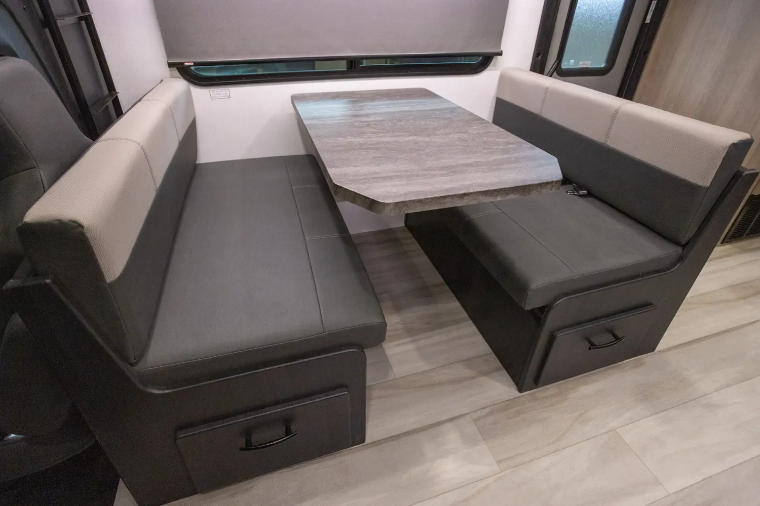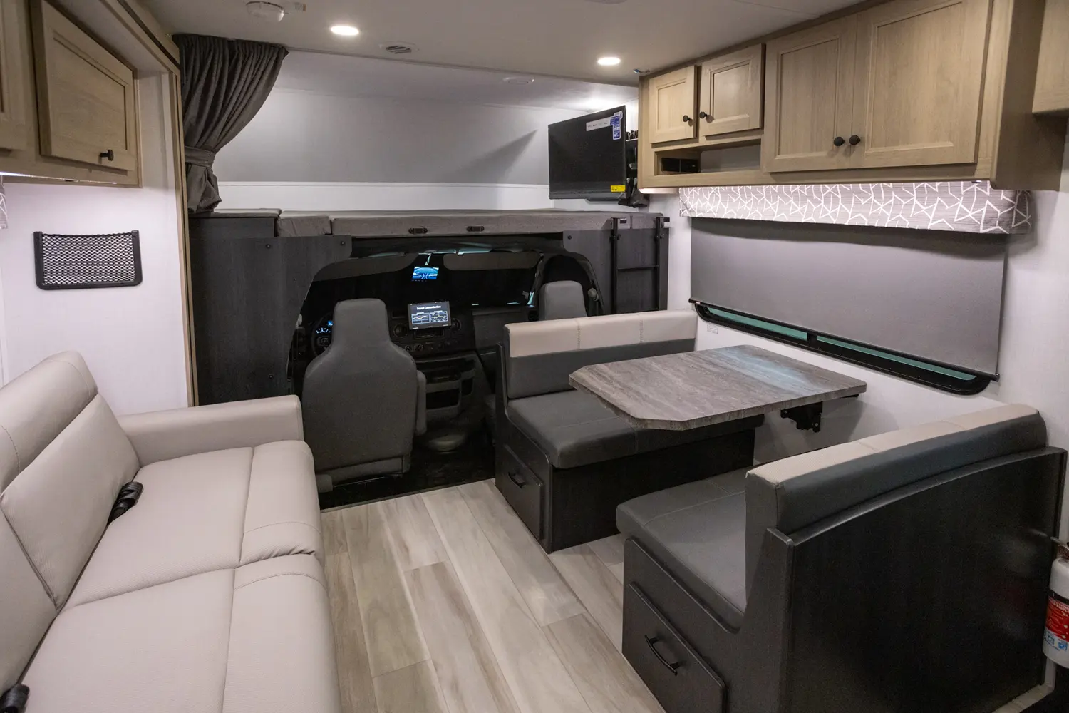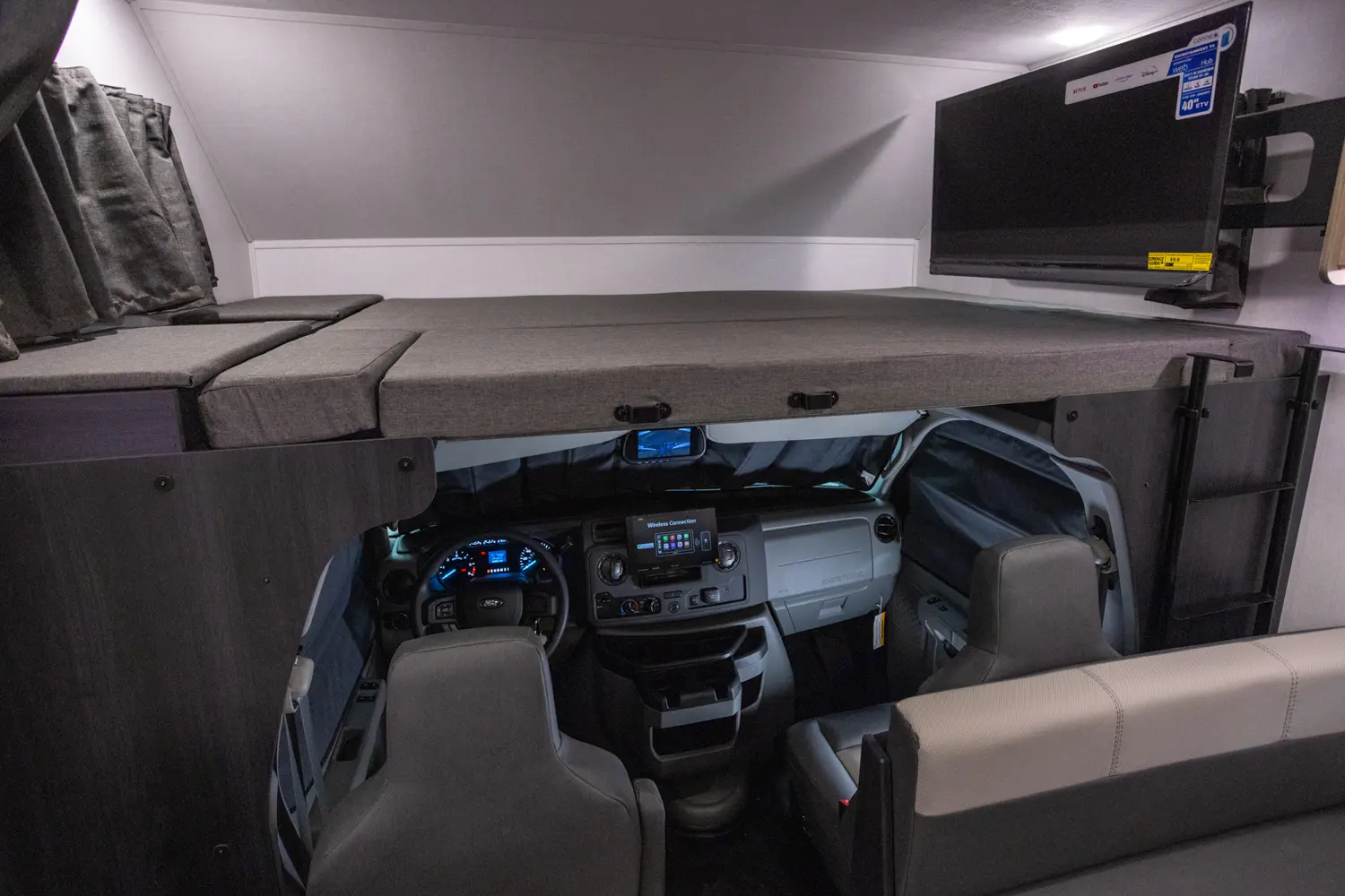 The 3250DSLE is a bunkhouse model. There's a 28" x 72" flip-down bunk above with a kids' sofa sleeper that folds out to a bed below. The adults can enjoy their own sleeping area in the rear. The bathroom offers a 24" x 32" shower with tub, along with linen storage. The kitchen is set up to maximize space, while a booth dinette and sofa provide additional seating and sleeping areas. In front, a 60" x 80" cab over bunk gives you even more space! Built on the Ford E450 Chassis.