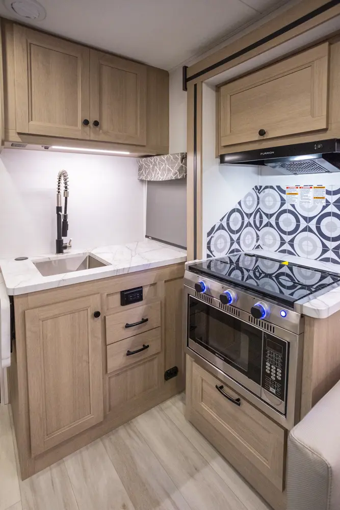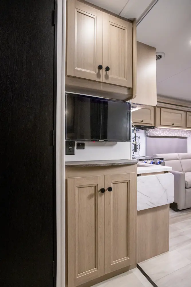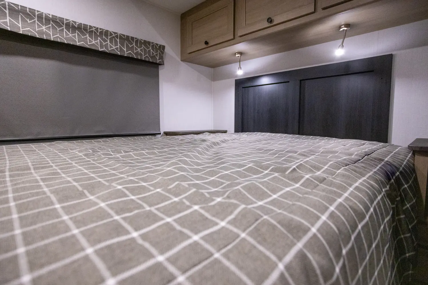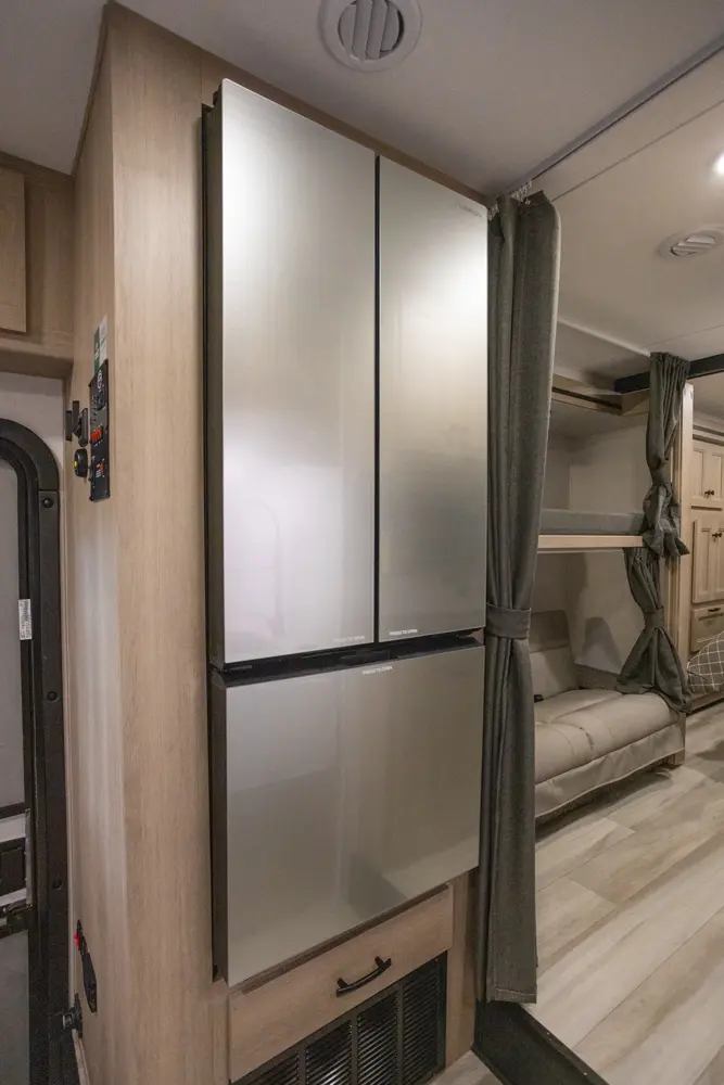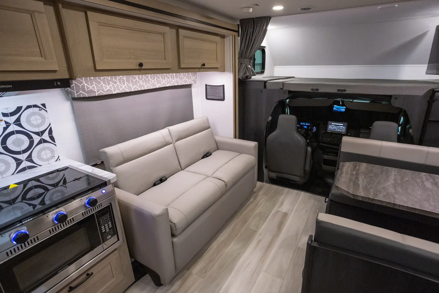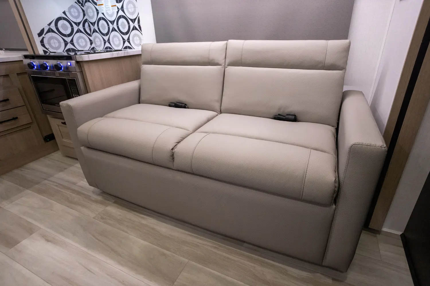 The 3250DSLE is a bunkhouse model. There's a 28" x 72" flip-down bunk above with a kids' sofa sleeper that folds out to a bed below. The adults can enjoy their own sleeping area in the rear. The bathroom offers a 24" x 32" shower with tub, along with linen storage. The kitchen is set up to maximize space, while a booth dinette and sofa provide additional seating and sleeping areas. In front, a 60" x 80" cab over bunk gives you even more space! Built on the Ford E450 Chassis.