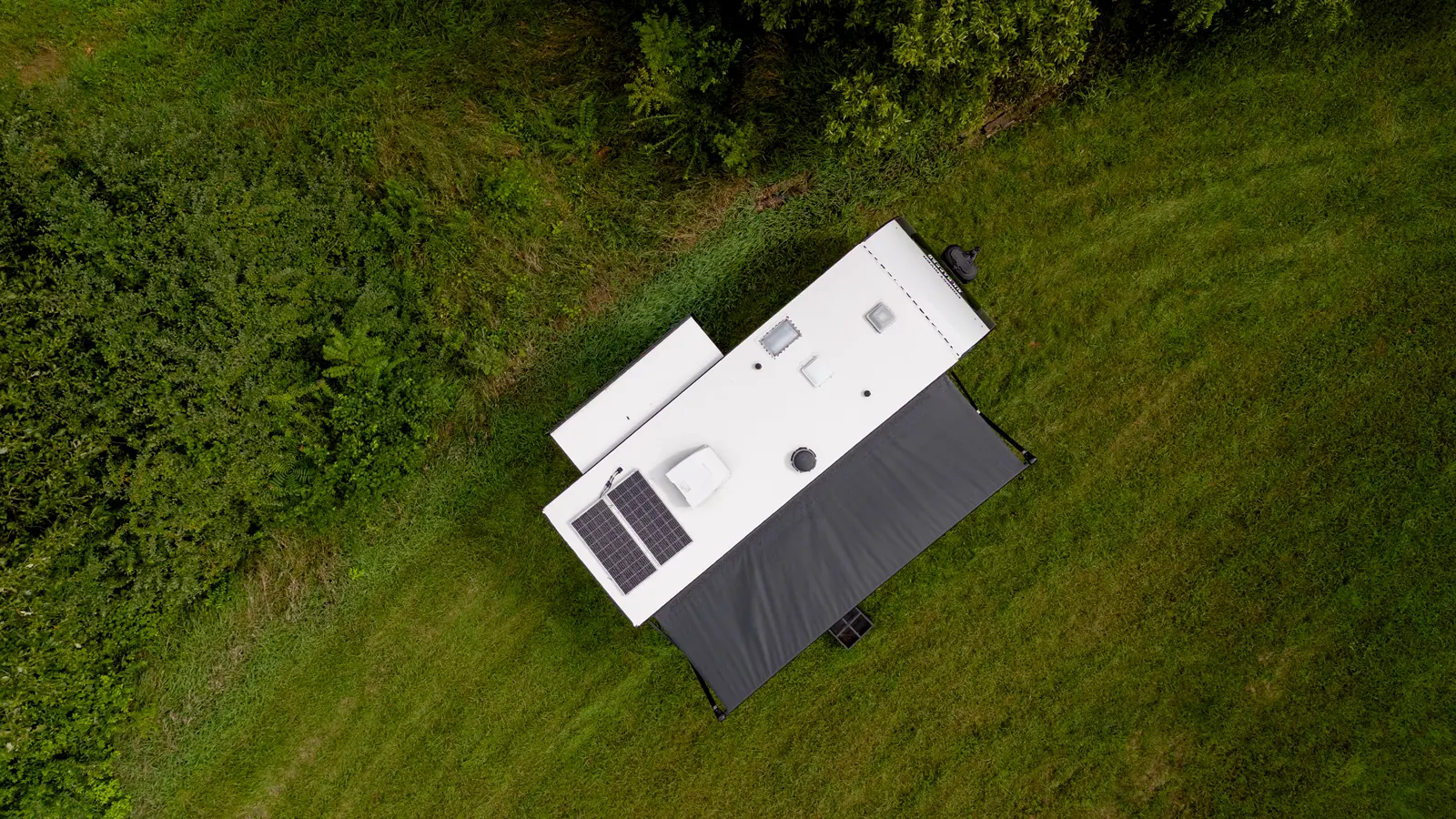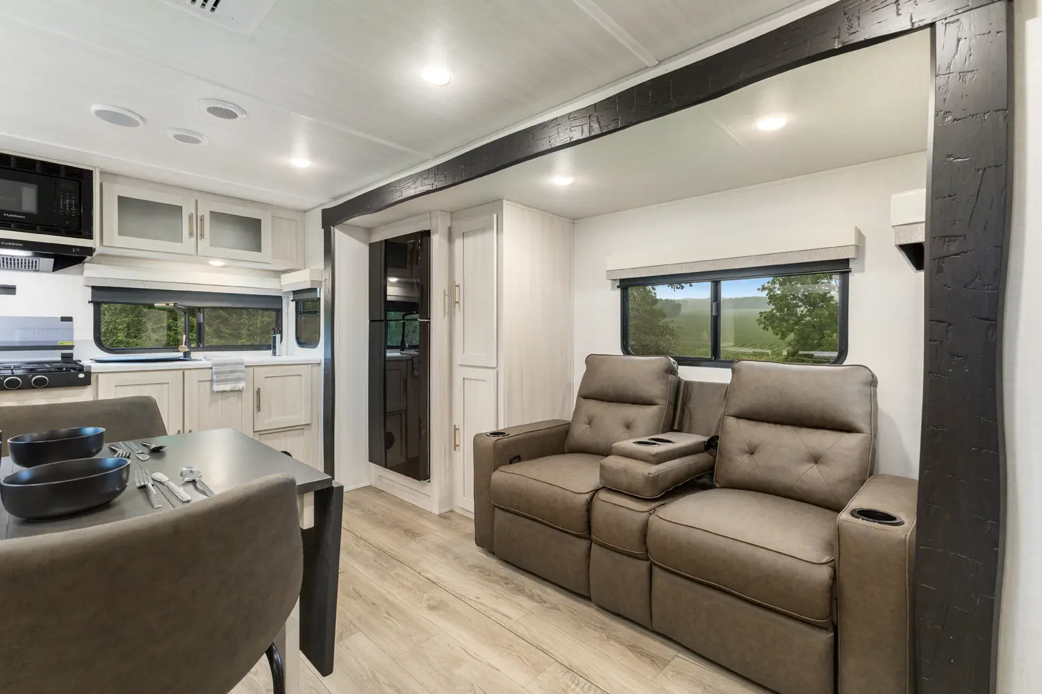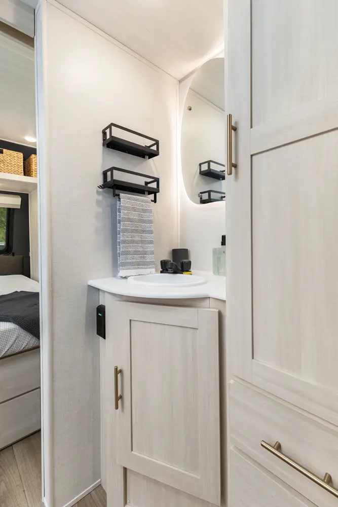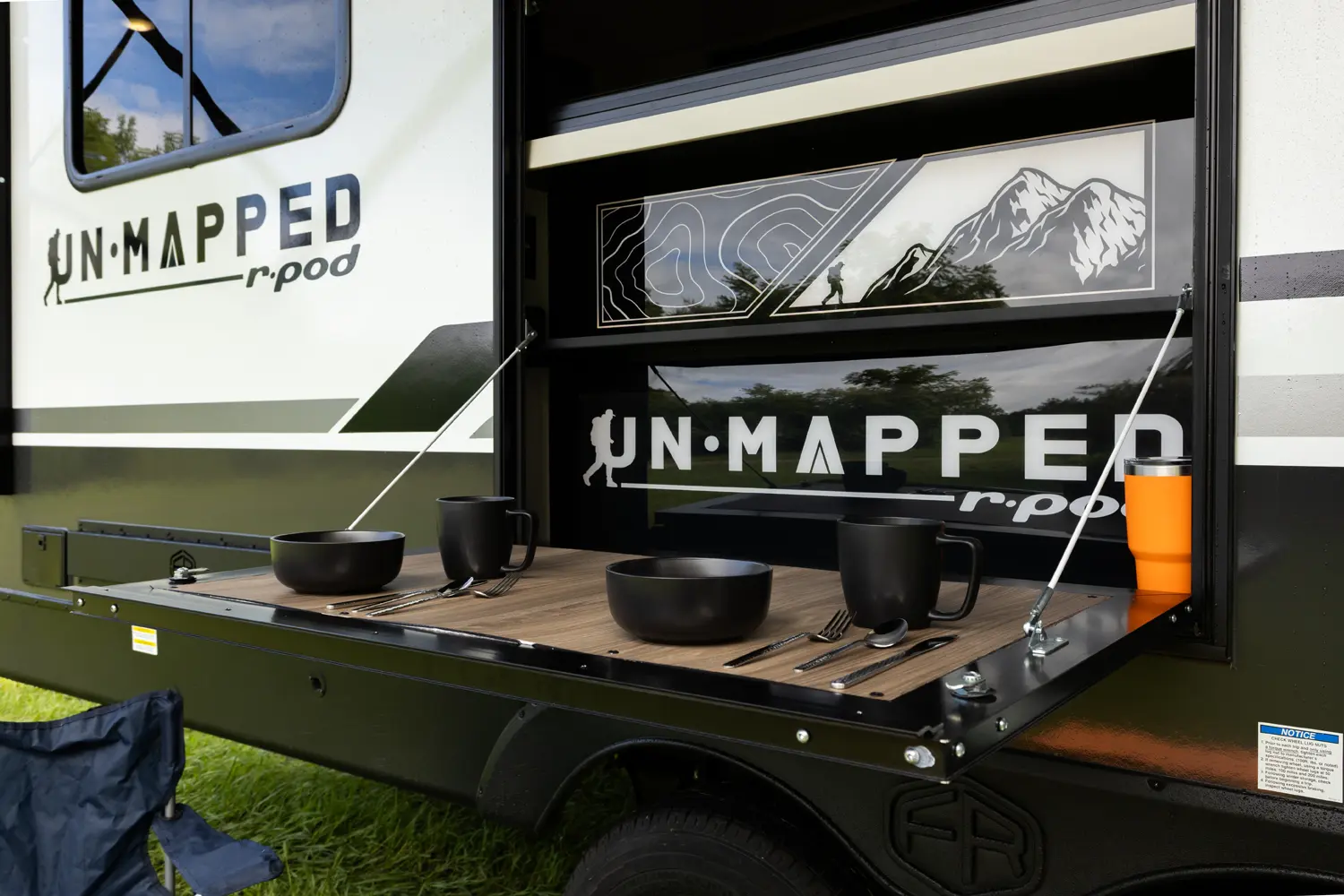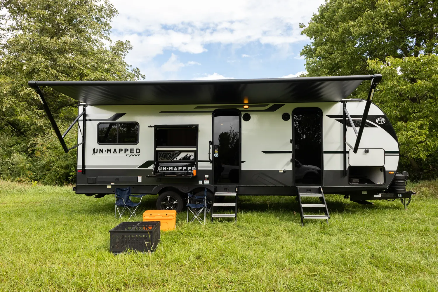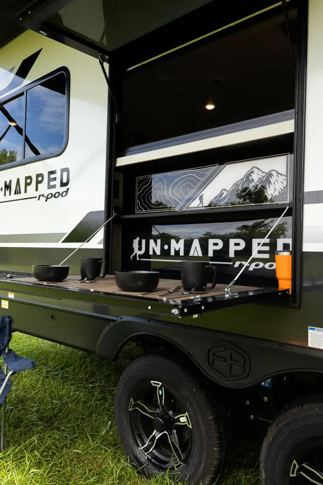 The Un•Mapped 24RK features a rear kitchen layout with a 12V black glass refrigerator, and an air fryer microwave. The Bar2Table pull-out dinette and TrailGate outdoor bar enhance dining flexibility and outdoor entertaining. Inside, enjoy a king bed, 15K A/C, and a tankless on-demand water heater. Exterior amenities include a 21' powered awning and a hot & cold spray port.
