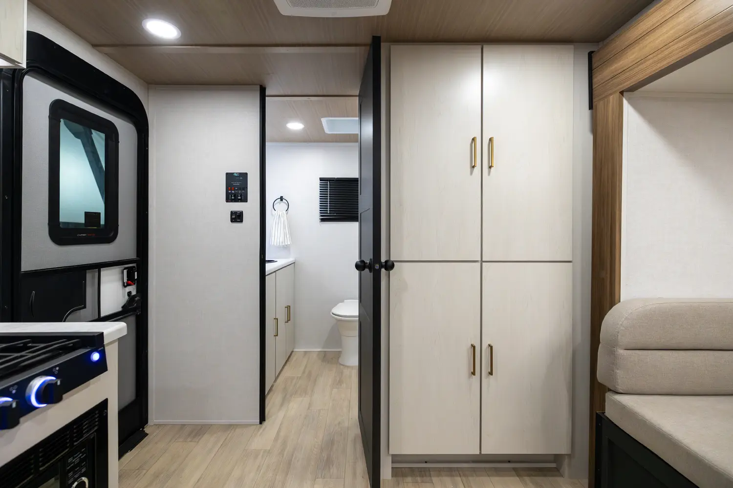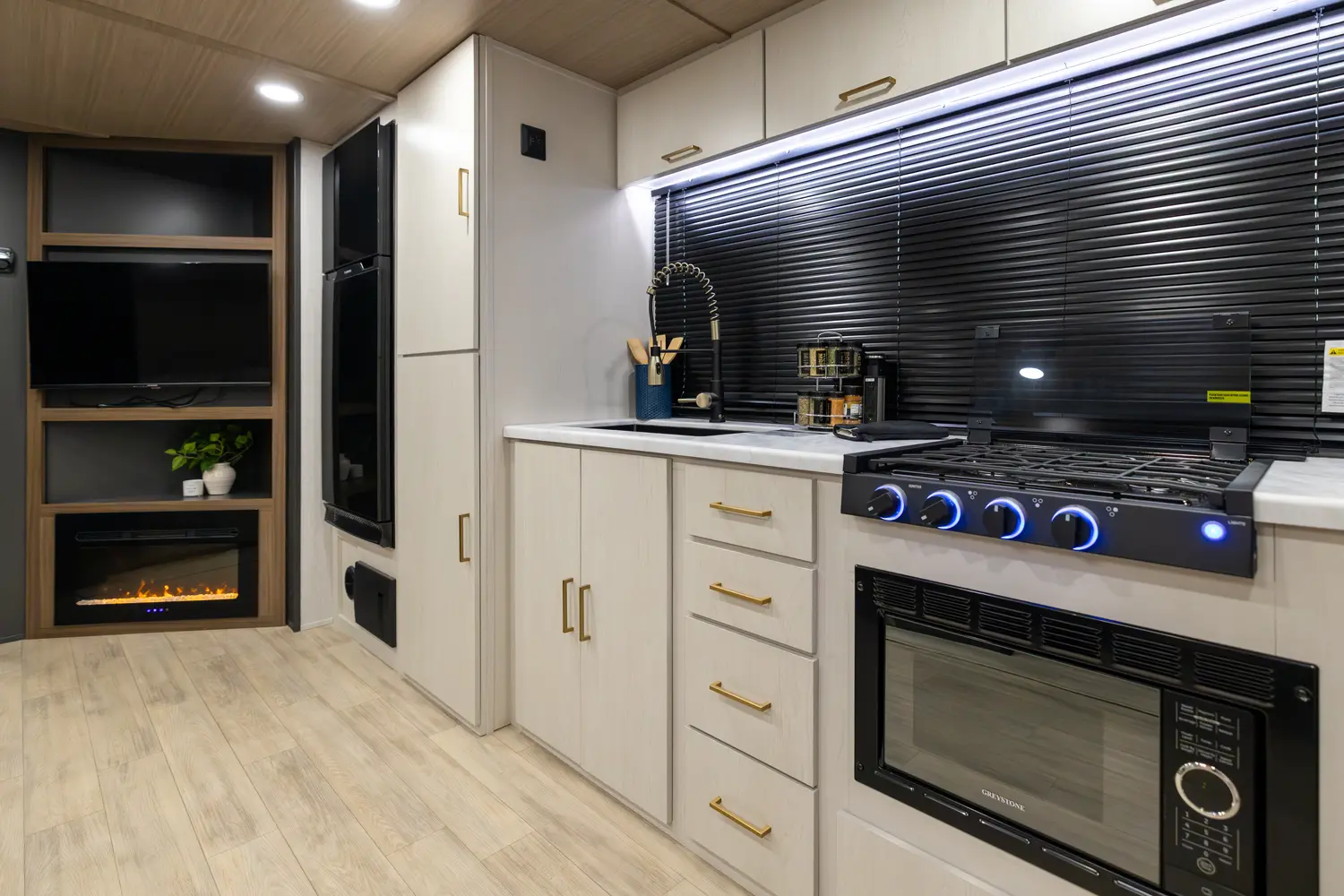 • Universal Docking Station Enclosed in Cargo Storage - Hookups Included: Cable & Satellite Switch, Fresh-Tank Gravity Fill, City Water, Black Tank Flush, Winterization Pump, Outdoor Shower, GFI Outlet, And Space Prepped for Solar Panel Controller