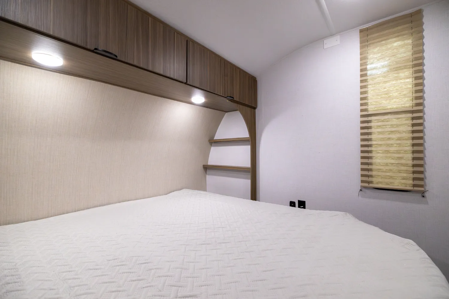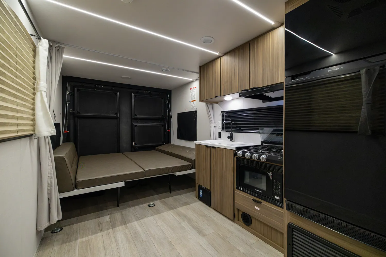The 260RTK front bedroom provides a queen bed with extra storage, while the adjacent bathroom gives you a large skylight shower and mirrored linen closet. The kitchen provides modern appliances, panoramic window, and a faux stone accent wall with entertainment center. Taking the crew on the road? The flip-down sofas and removable dining table in the garage convert to a king bed. Plus, the ramp door doubles as a party patio. At just over 5000 lb, this toy hauler is ready to roll and easy to tow.