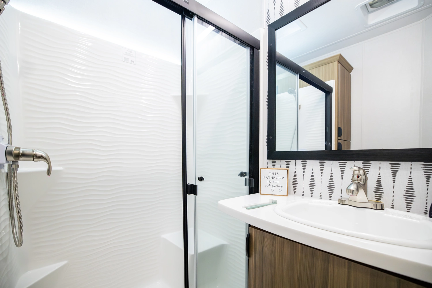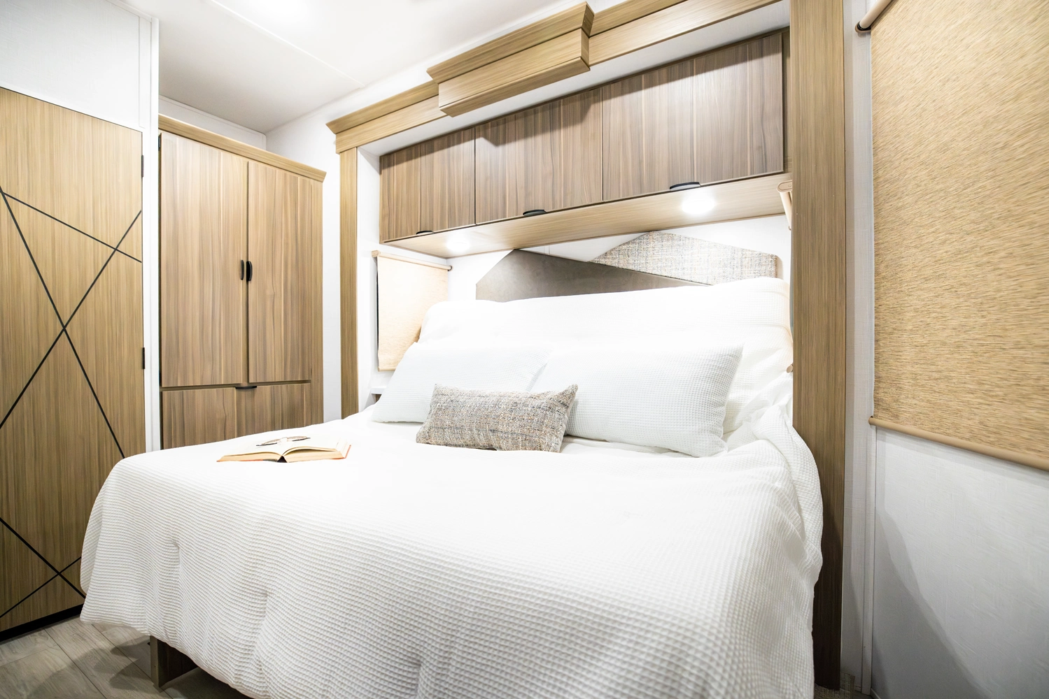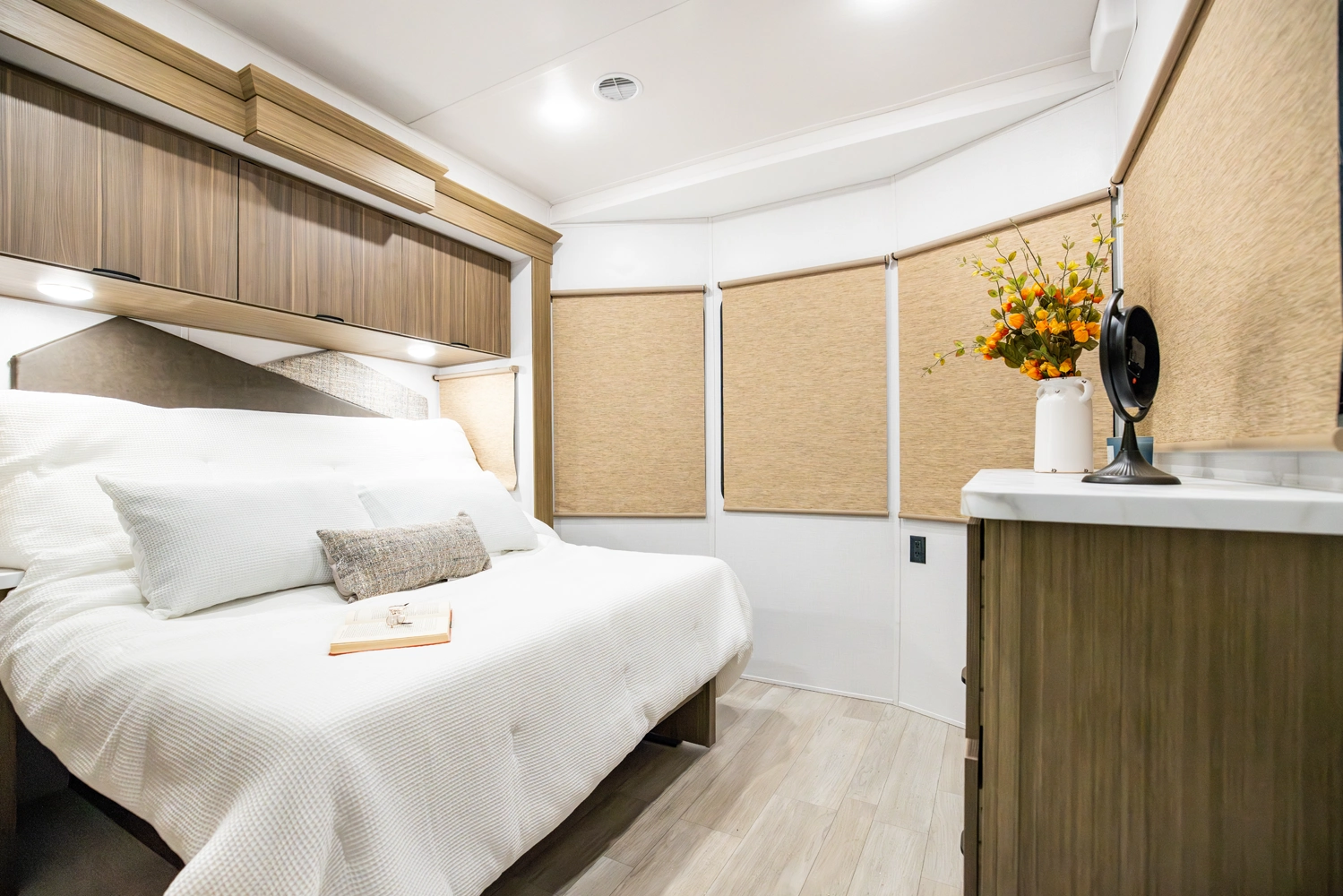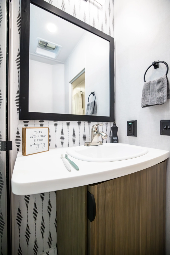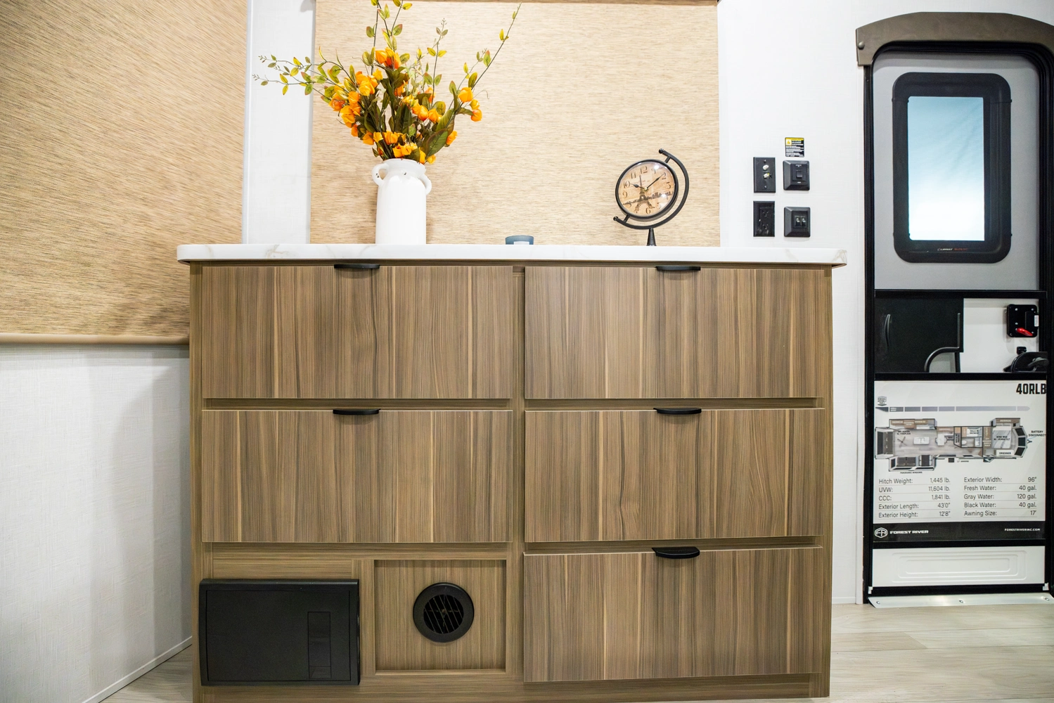 The 40RLB is an open floorplan that maximizes space for a residential cottage look and feel. The large king bedroom provides plenty of storage and washer/dryer hookup. The bathroom offers a walk-in shower with built-in seat, skylight, and linen cabinets. The island kitchen provides residential appliances and plenty of room for all the cooking essentials. Don’t forget the awesome view out the panoramic windows.