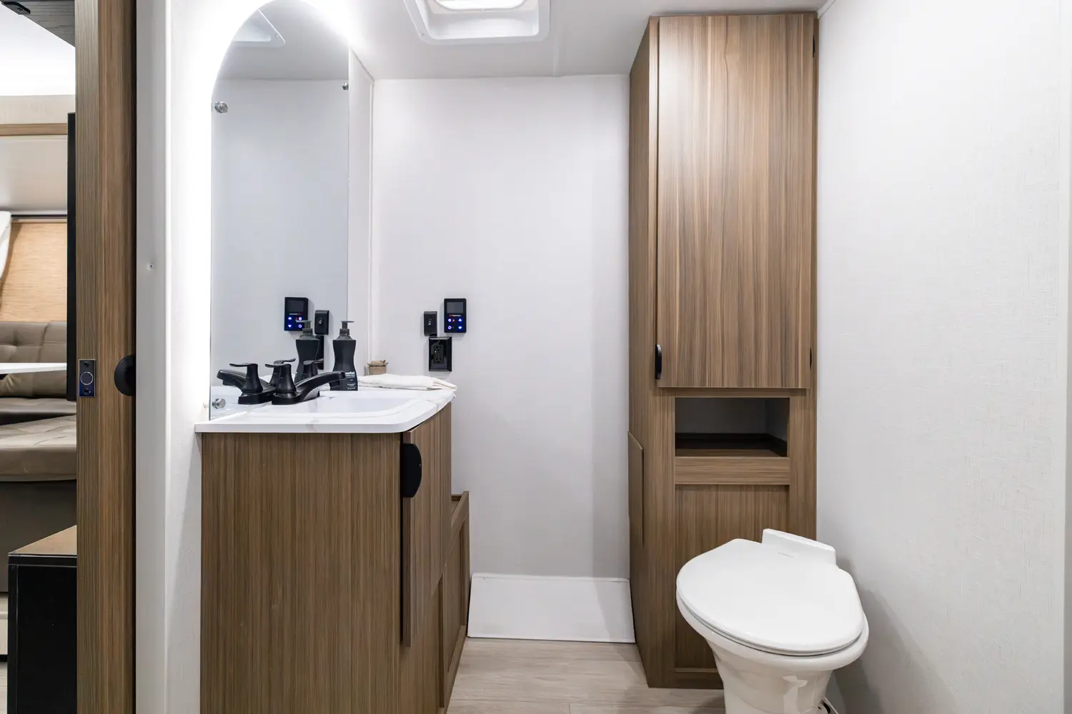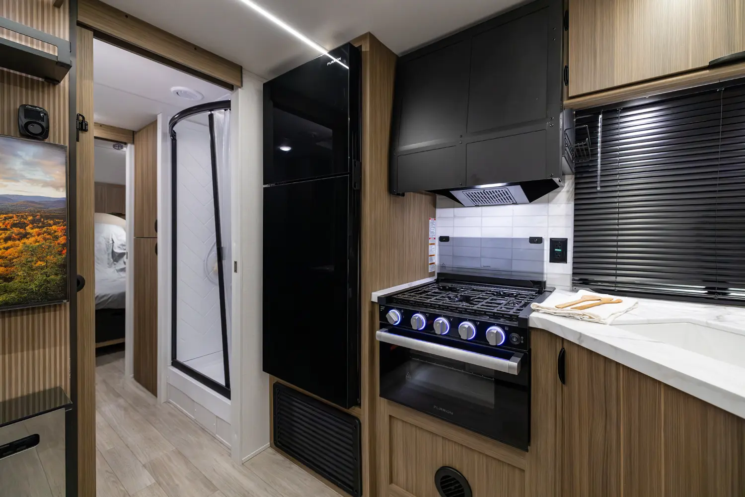 The 24RLXL is an extra-light travel trailer that comes in at 28' 11" and just over 5,000 lbs. The master bedroom features a ton of storage, including dedicated C-pap cubbies! The bathroom provides loads of storage as well, plus a walk-in shower. The kitchen is well-appointed with modern appliances and an oversized 11 CU. FT. refrigerator, fireplace, and U-dinette.